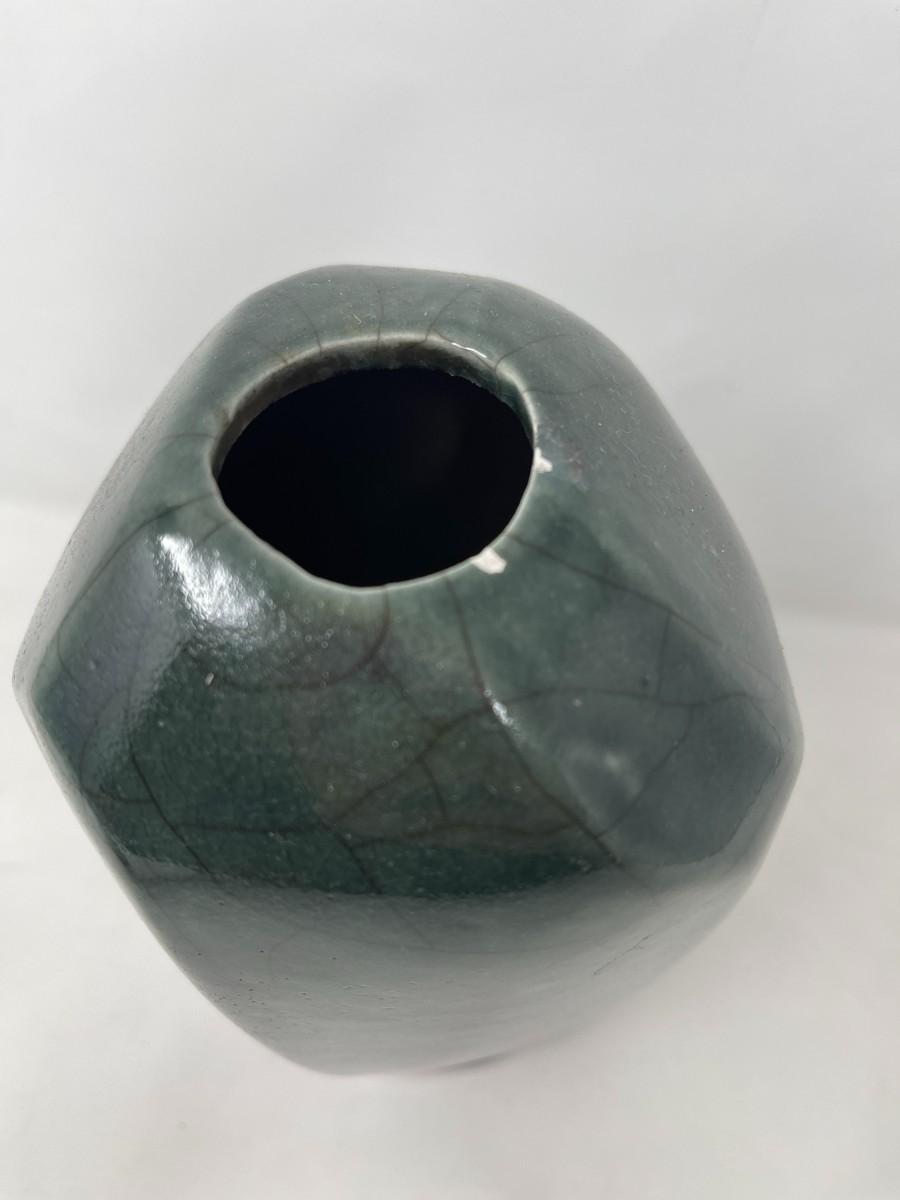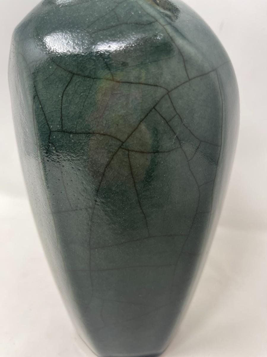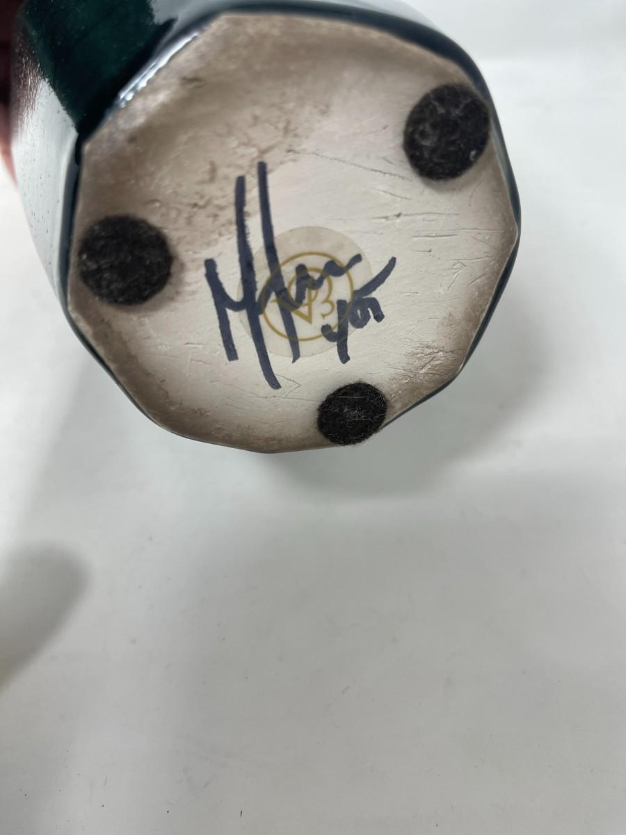 The pottery vessel has some chips at its mouth, but is otherwise intact. The stopper is in excellent condition. The piece is signed on the bottom, approx 10" with stopper. # 519