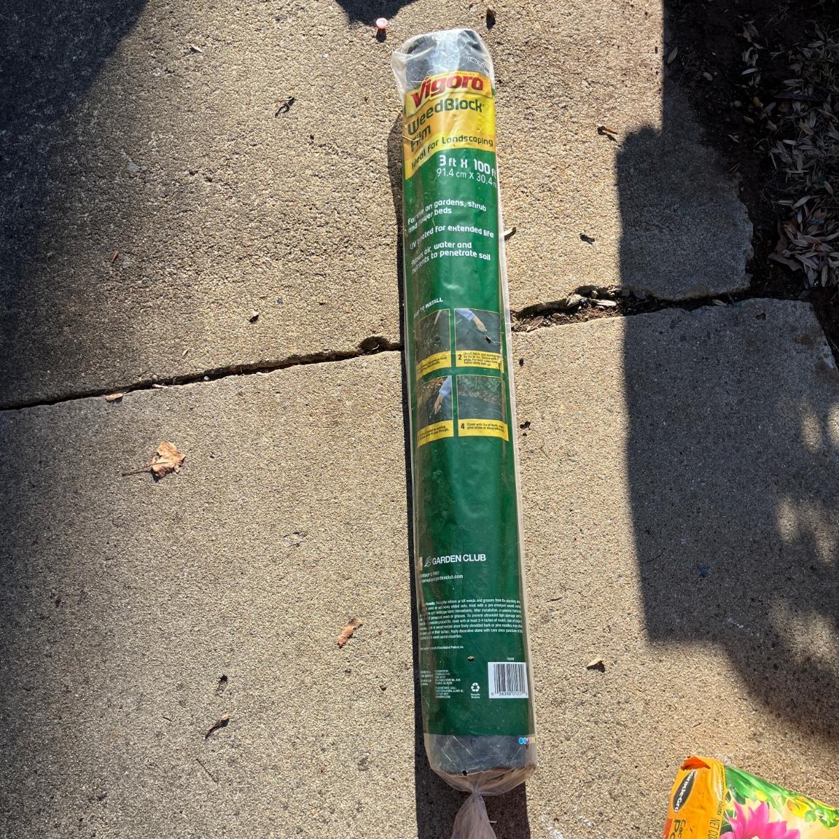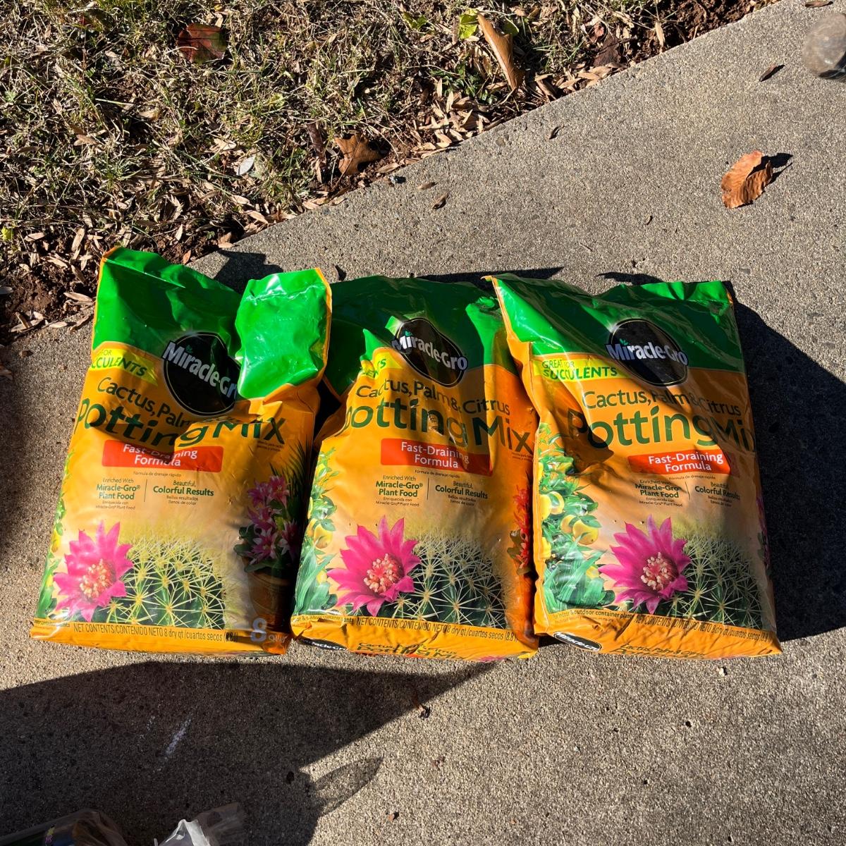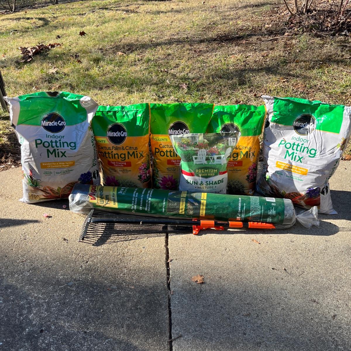 Lot includes three unopened 8 dry quart bags of Miracle Gro cactus, palm and citrus potting mix, two unopened 16 dry quart bags of Miracle Gro indoor potting mix, weed block film, an unopened 4 pound bag of grass seed, and a collapsible rake by Black & Decker.