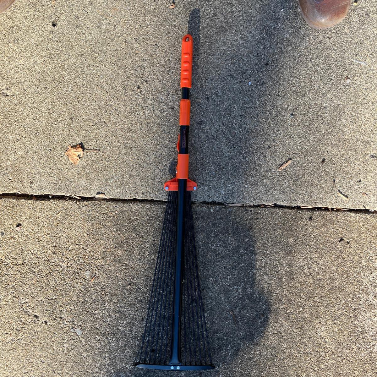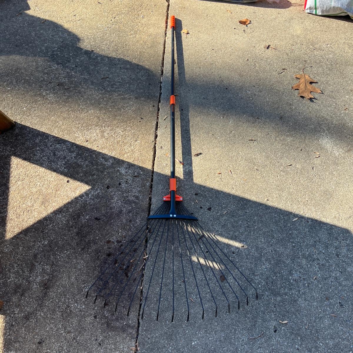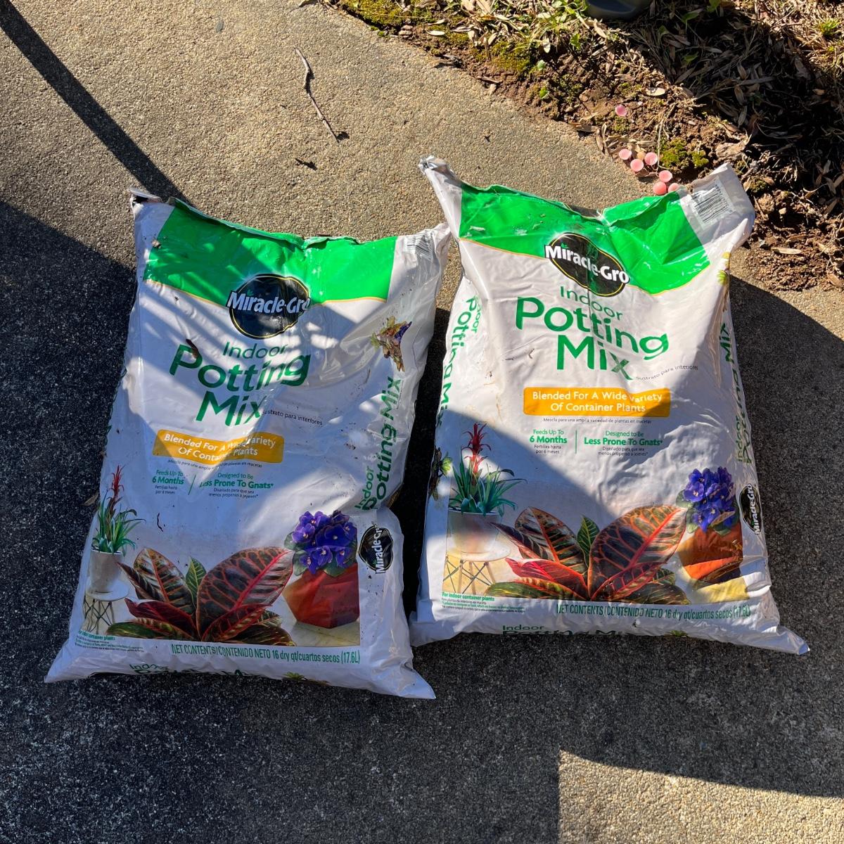Lot includes three unopened 8 dry quart bags of Miracle Gro cactus, palm and citrus potting mix, two unopened 16 dry quart bags of Miracle Gro indoor potting mix, weed block film, an unopened 4 pound bag of grass seed, and a collapsible rake by Black & Decker.
