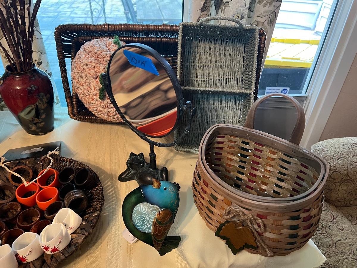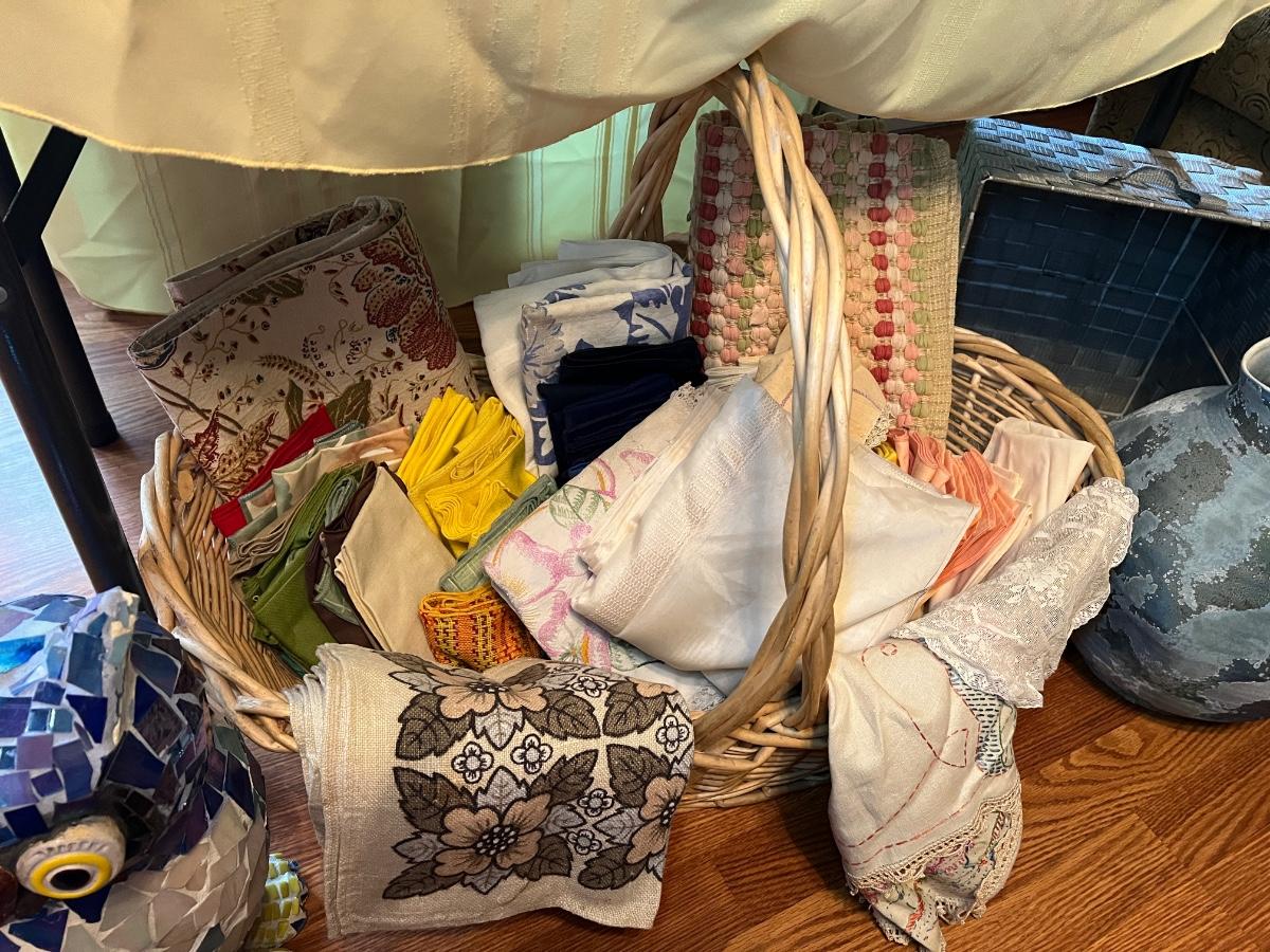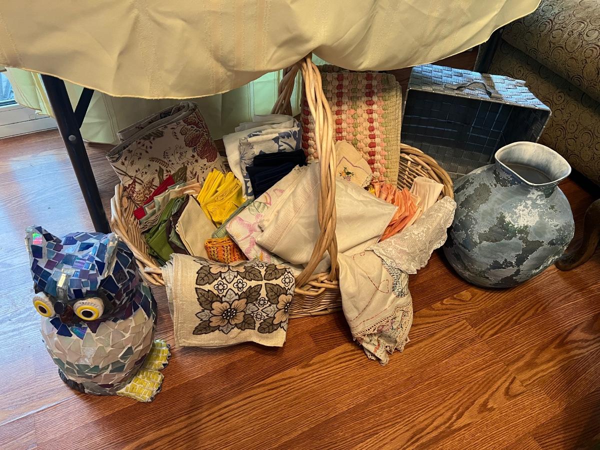 Includes cloth napkins, napkin rings, pottery, vases, baskets, and clay sculptures.