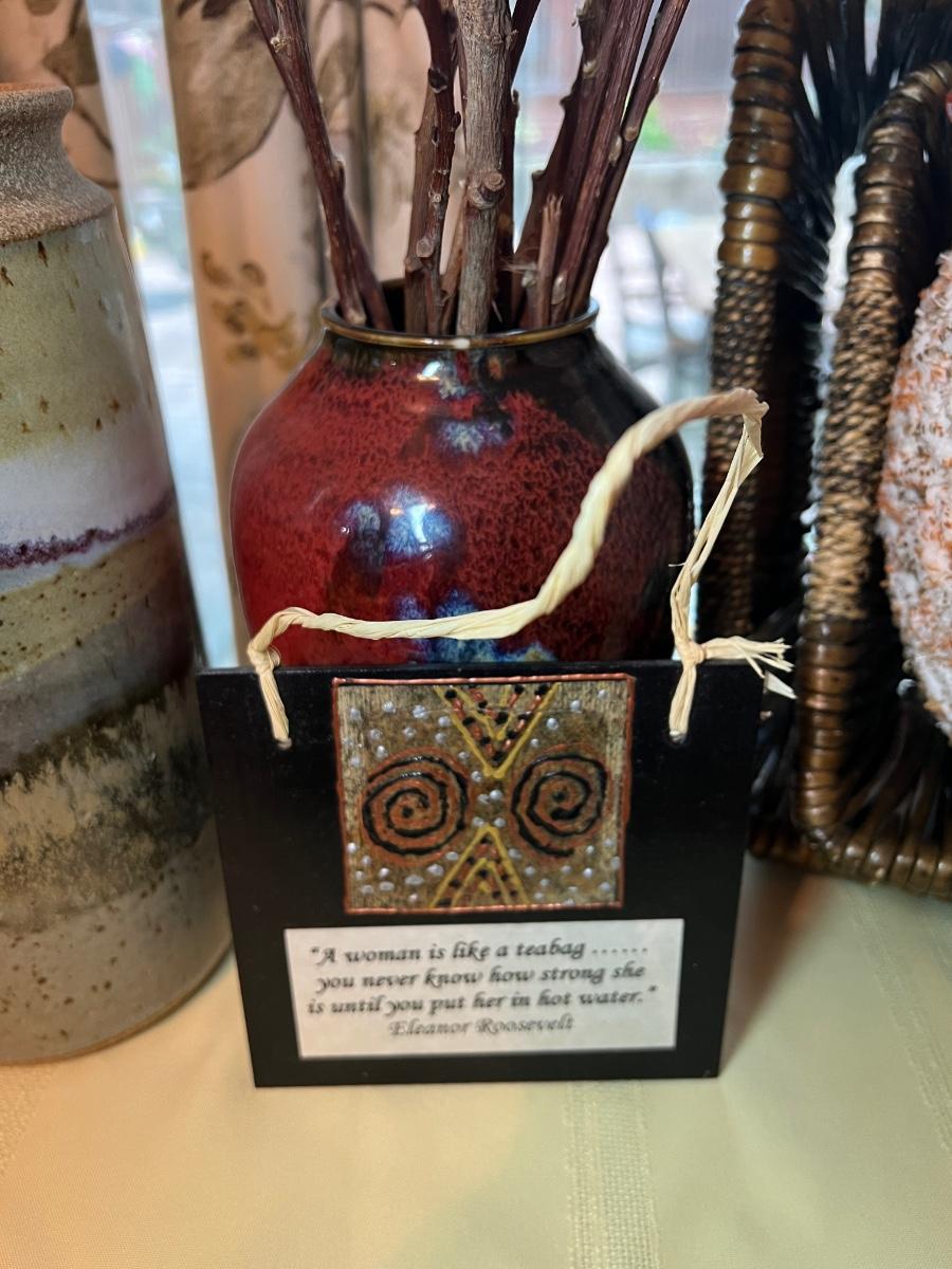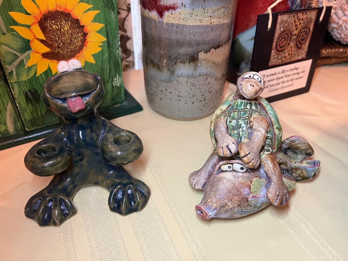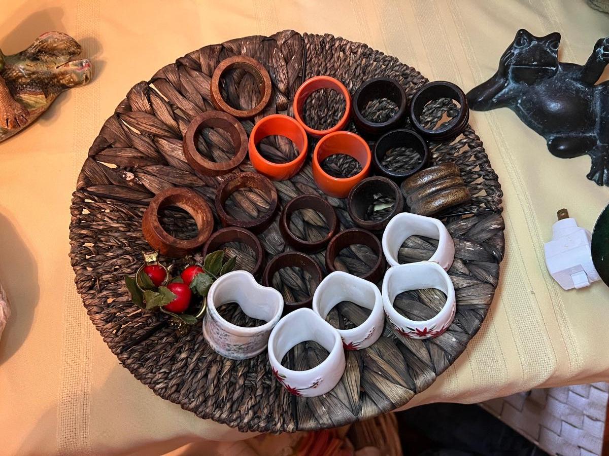 Includes cloth napkins, napkin rings, pottery, vases, baskets, and clay sculptures.