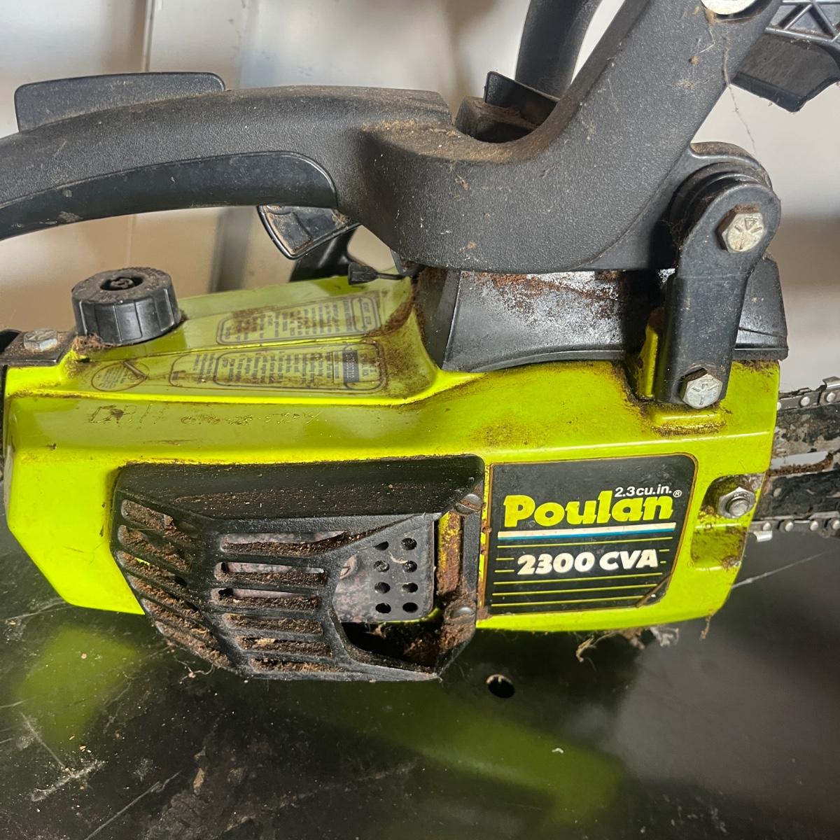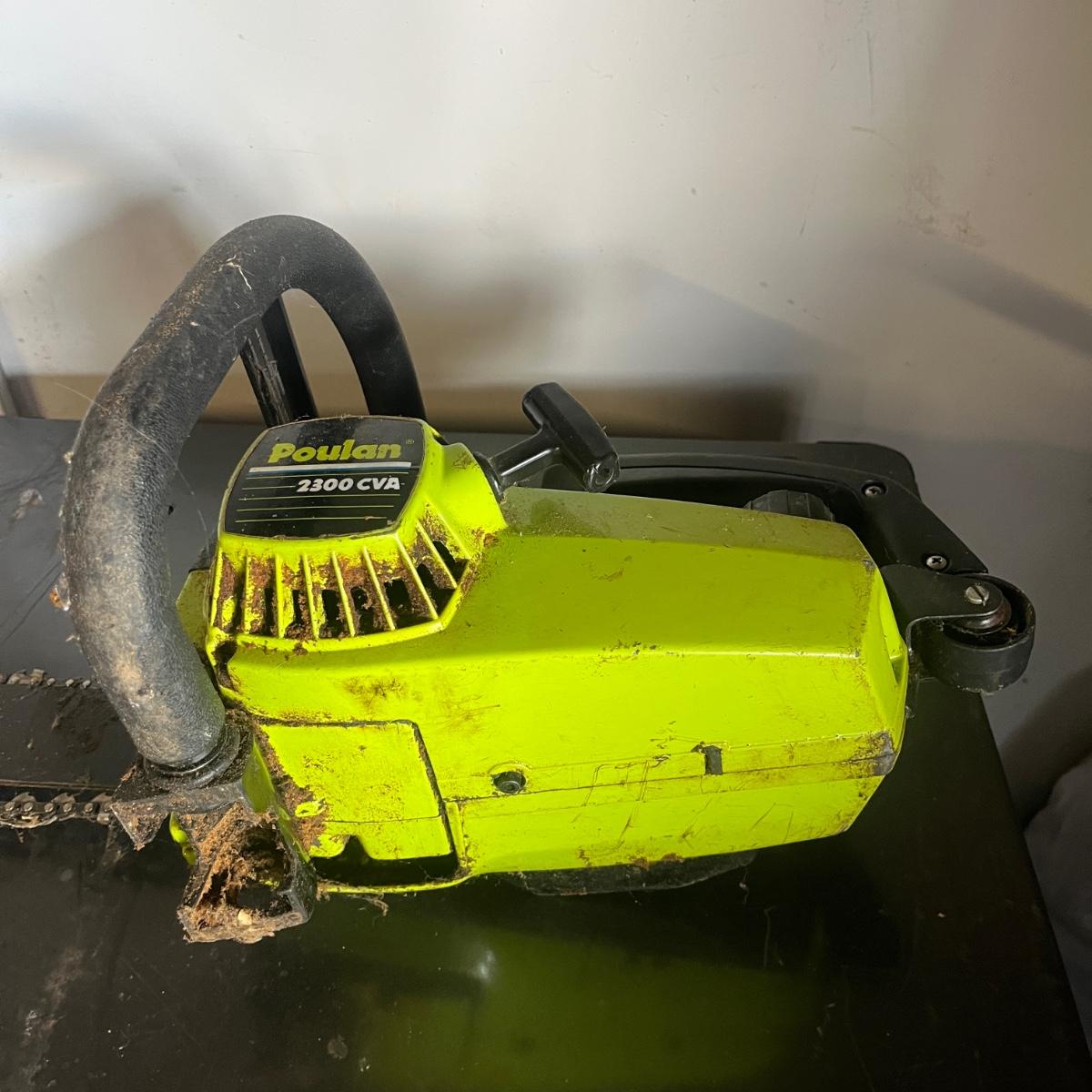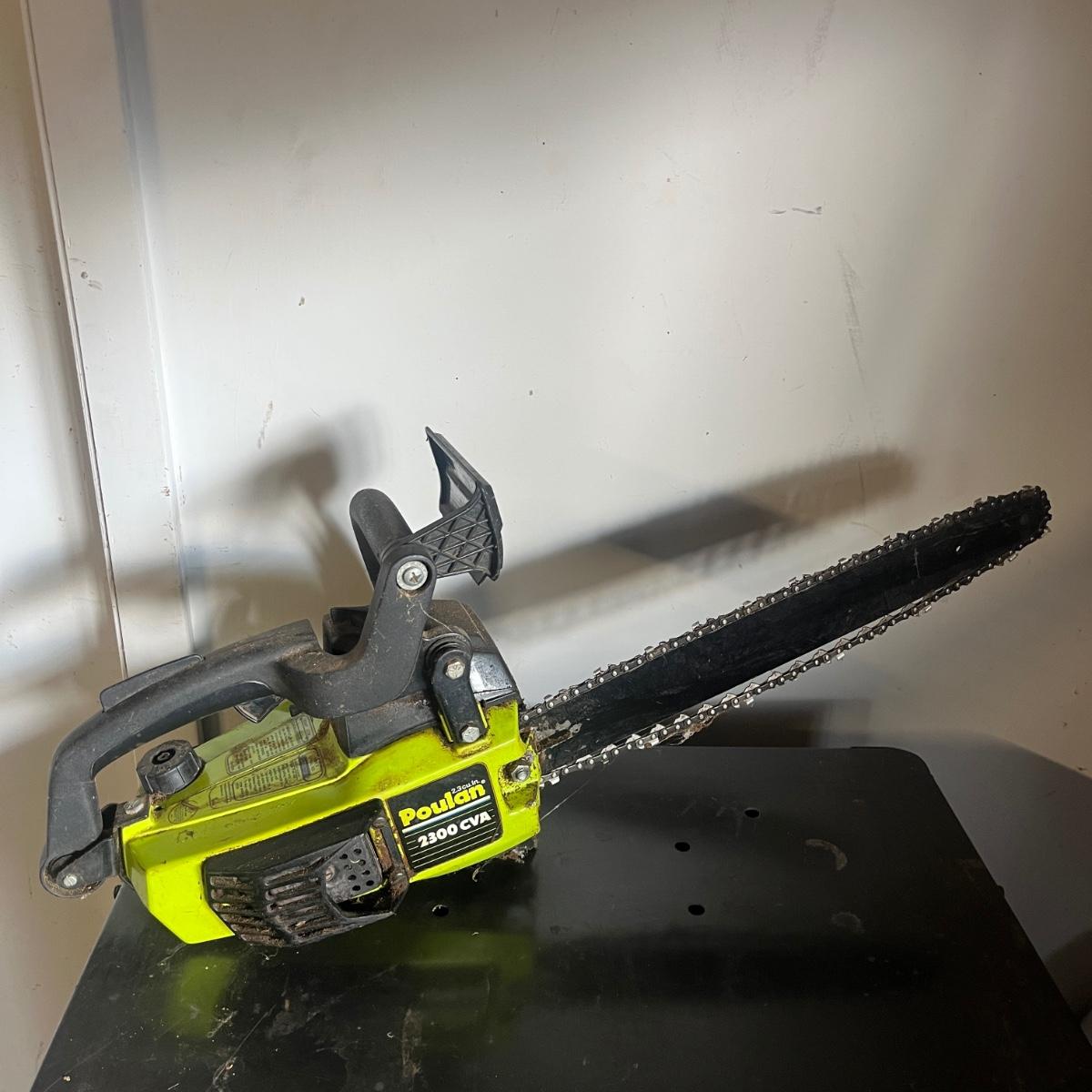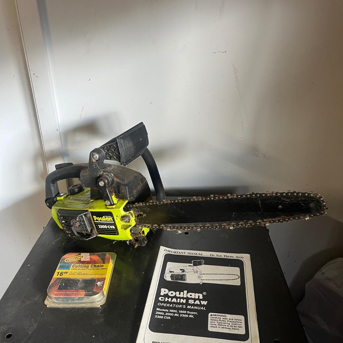 Lot includes a Poulan chainsaw with a 16” bar and an extra chain. Saw has no fuel to start , but turns over when starter cord pulled.