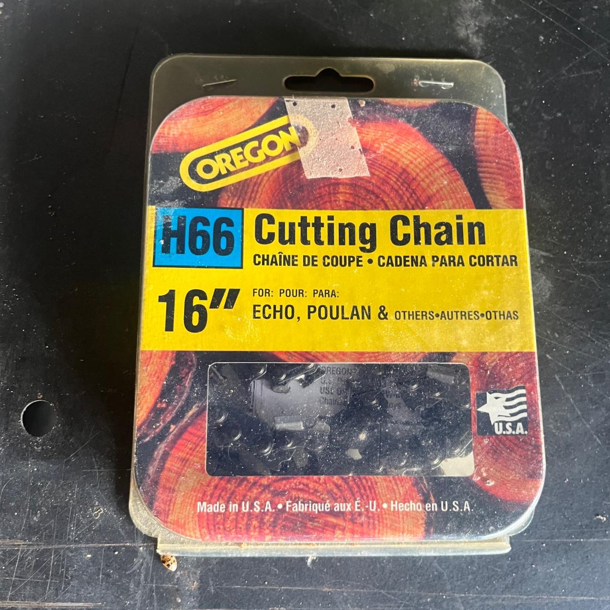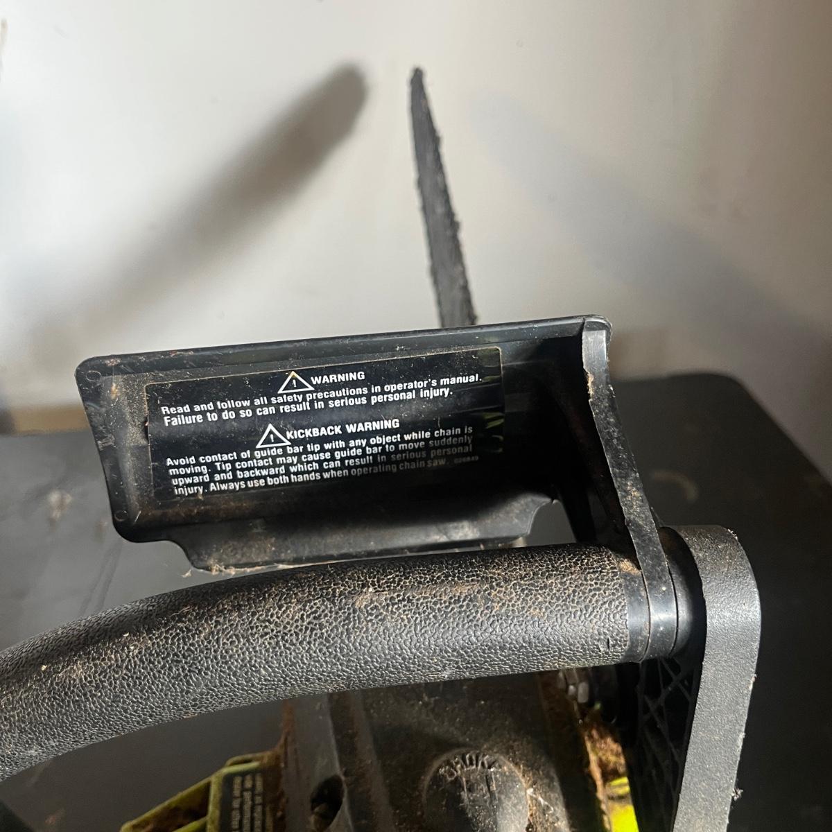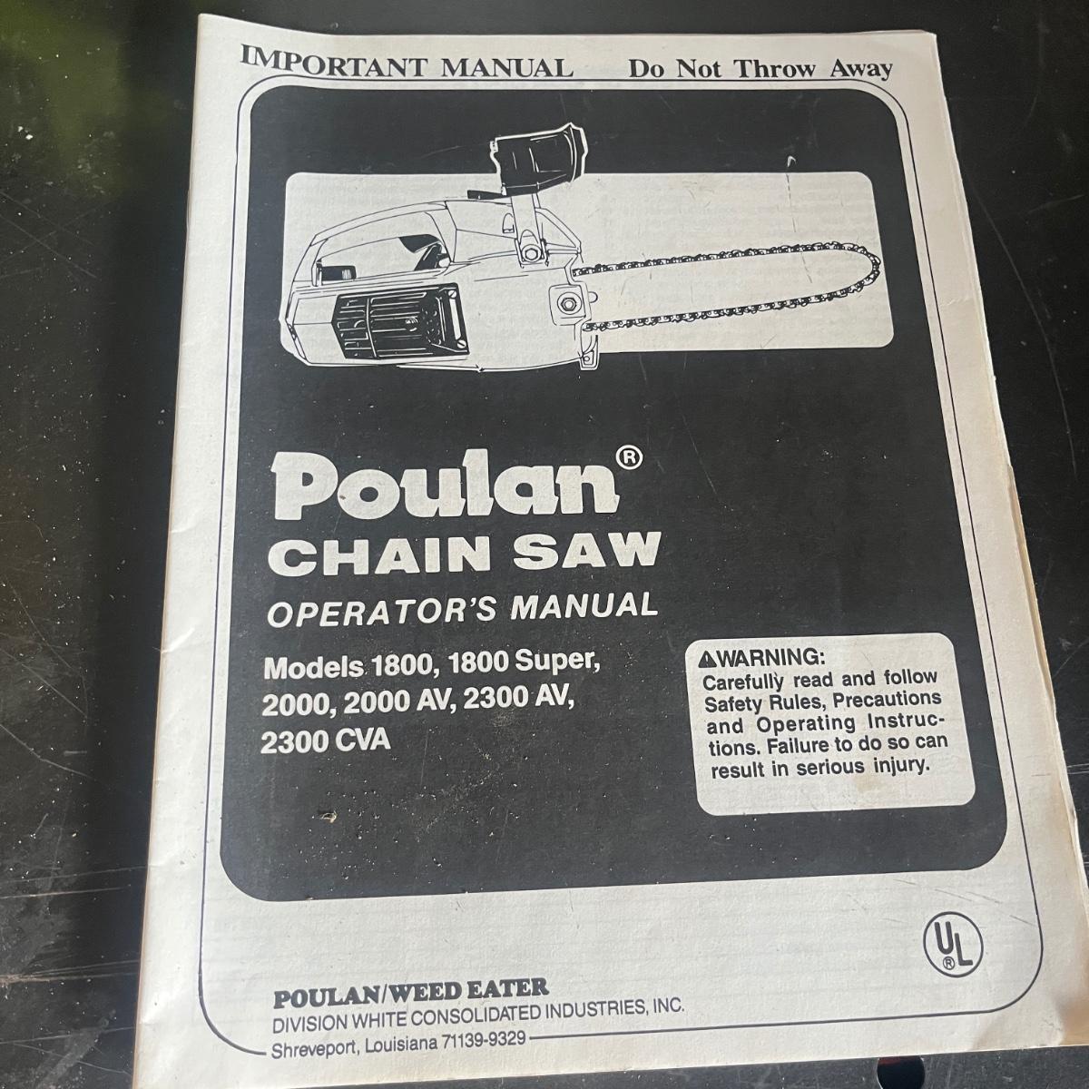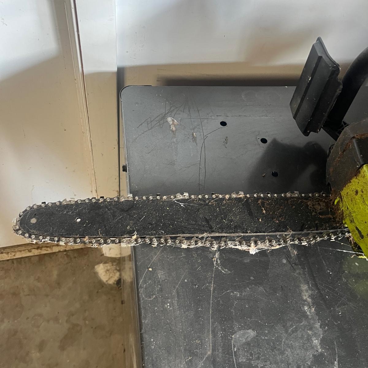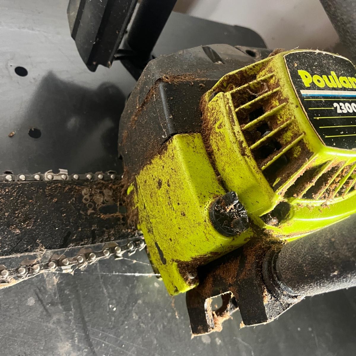 Lot includes a Poulan chainsaw with a 16” bar and an extra chain. Saw has no fuel to start , but turns over when starter cord pulled.
