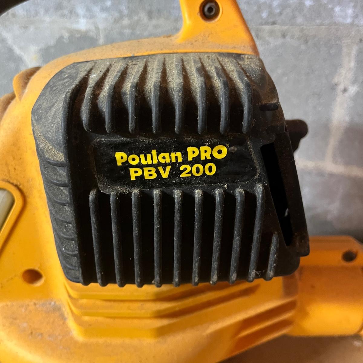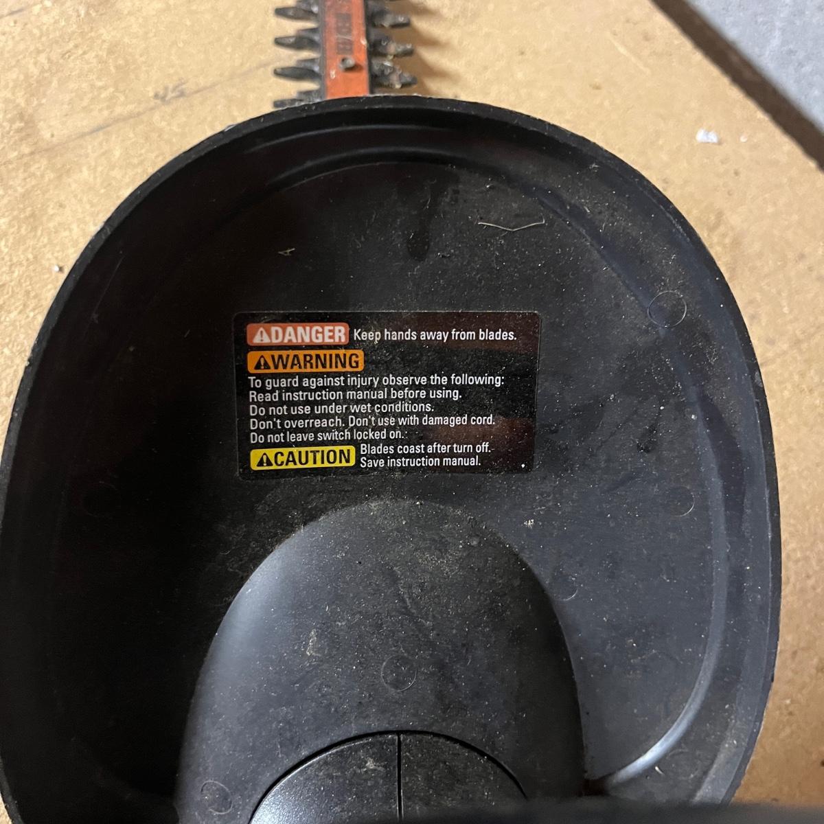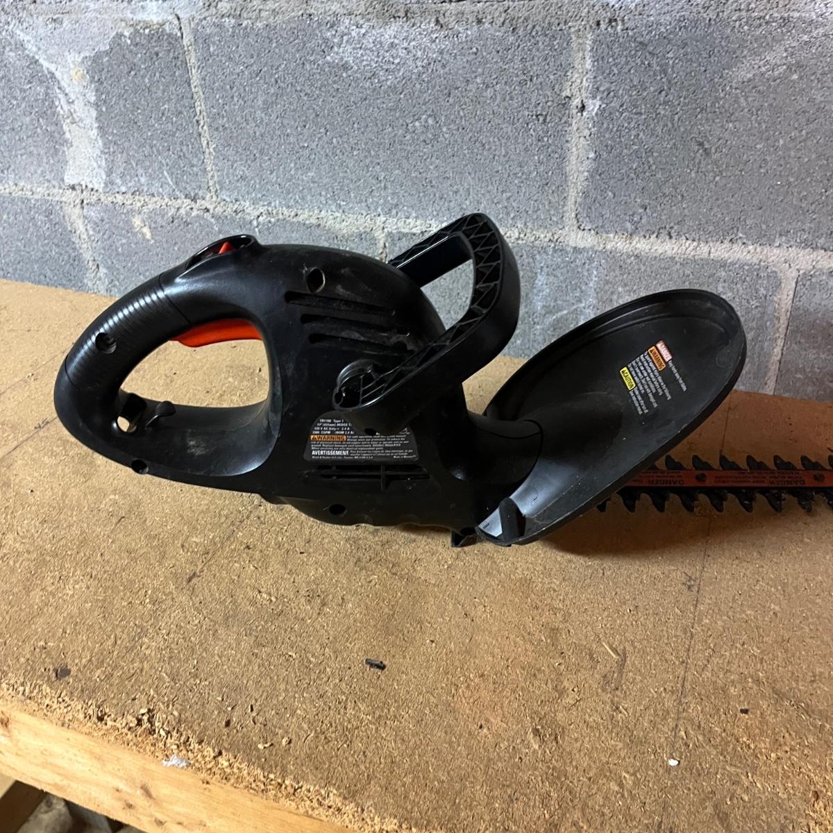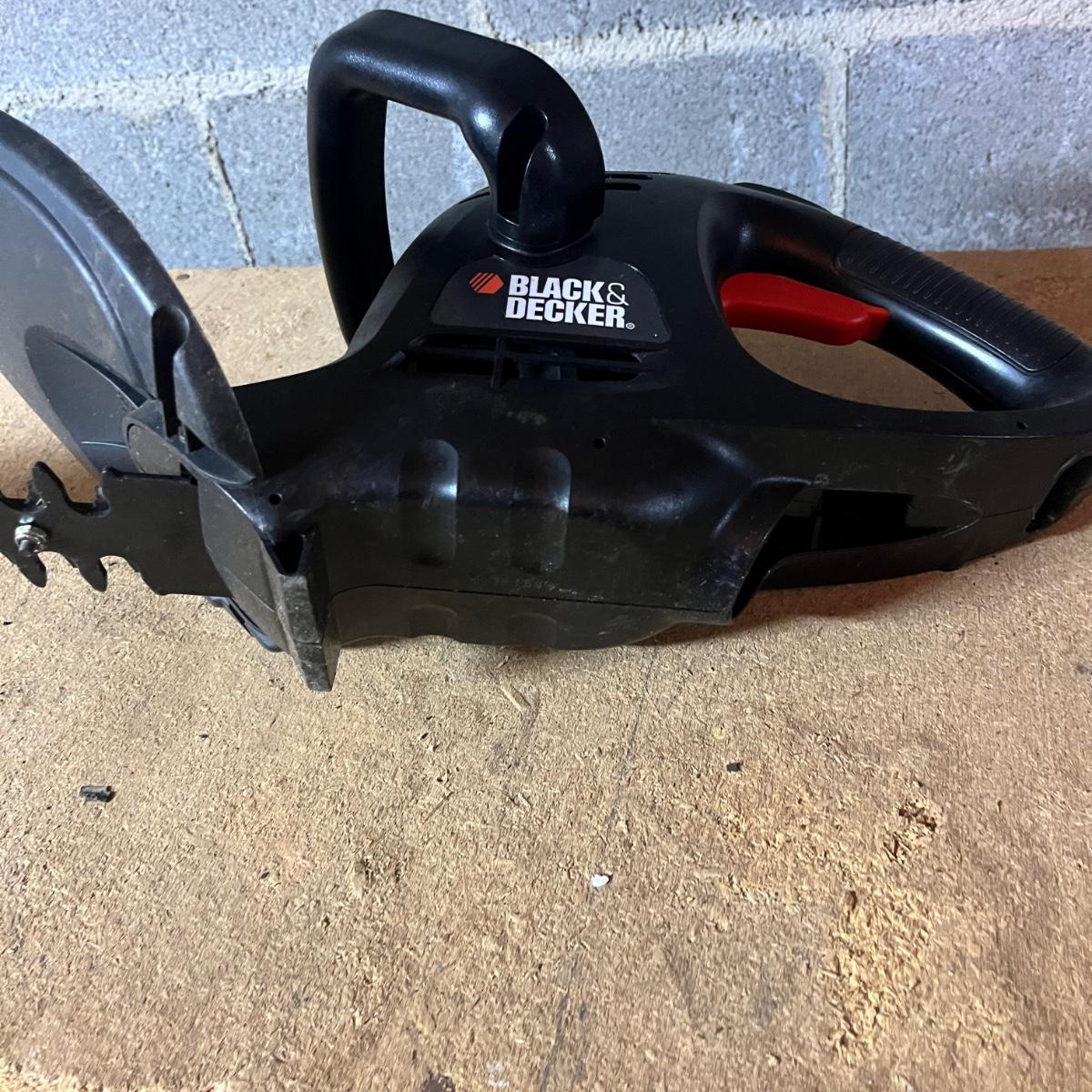 Lot includes a Poulan gas chainsaw with 16” bar, gas Poulan blower and a Black & Decker electric hedge trimmer that powered on when plugged in. Both gas machines do not have gas but turned over when cord was pulled.
