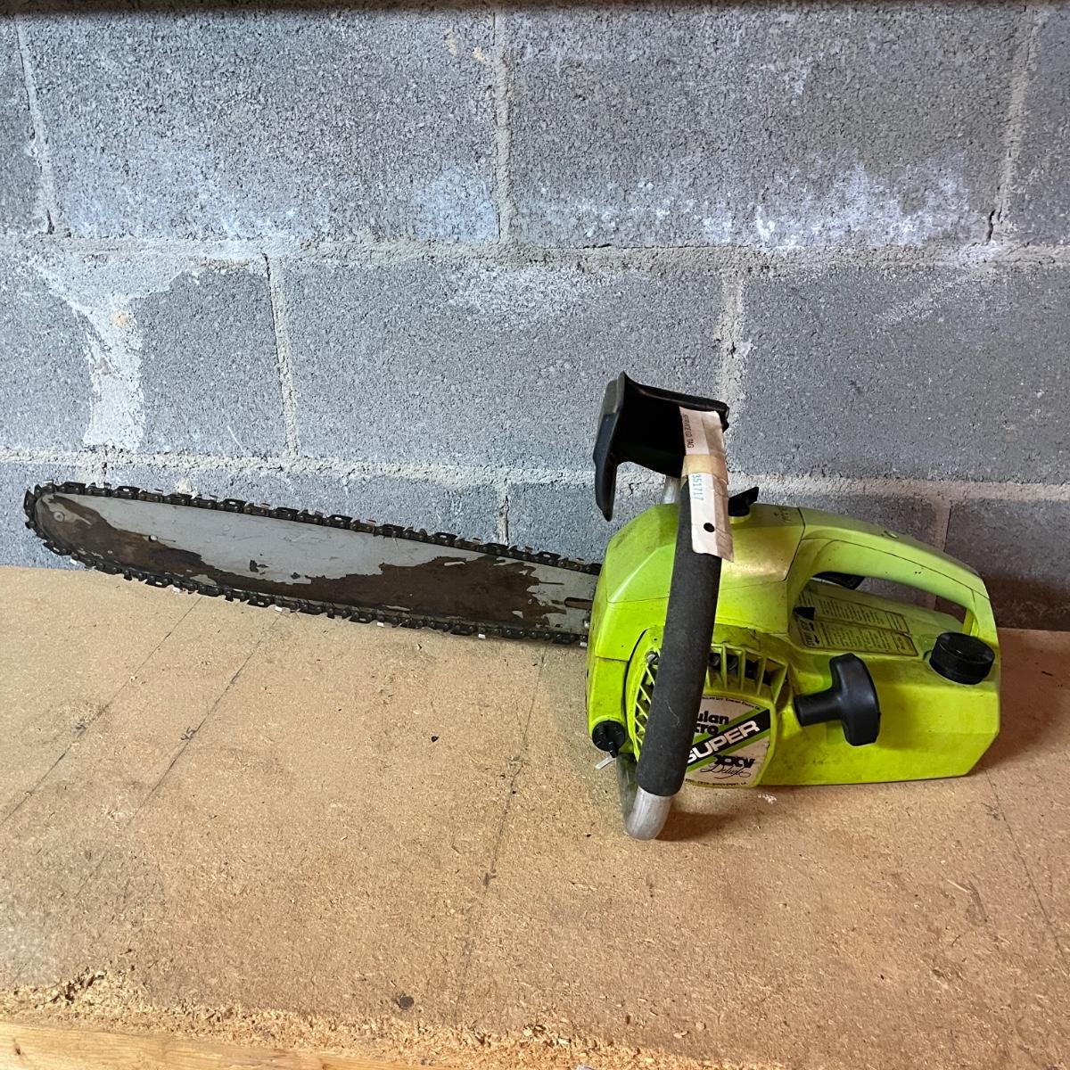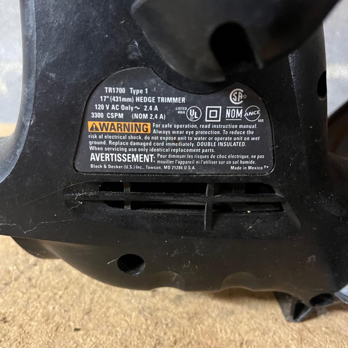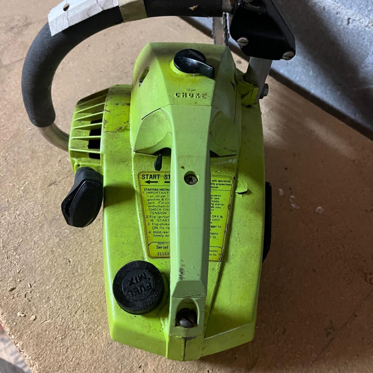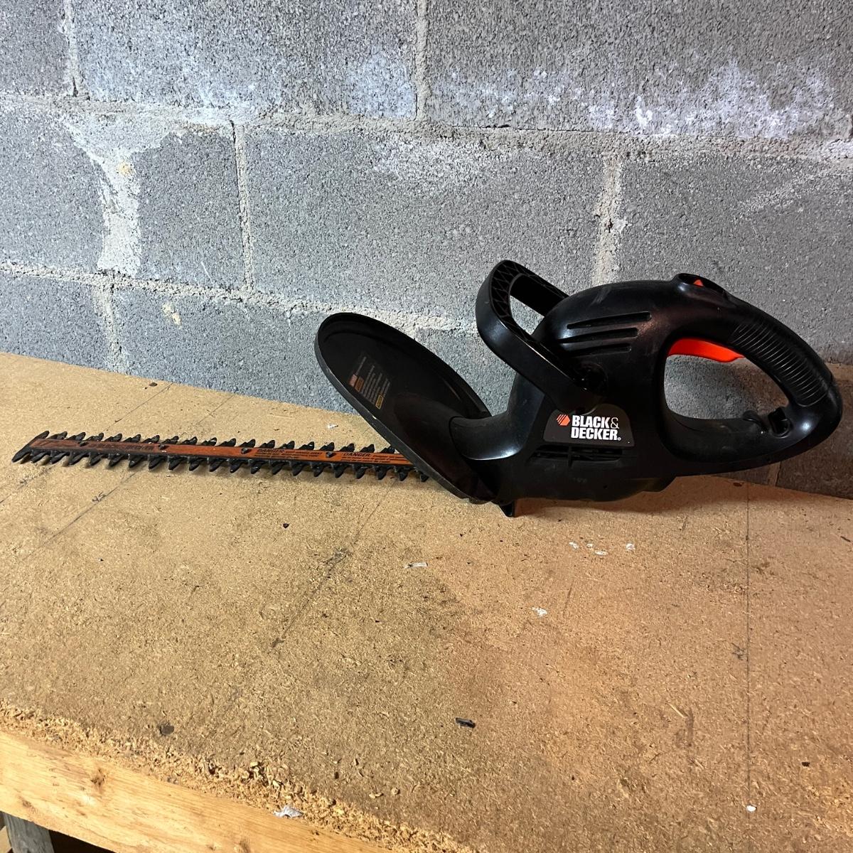Lot includes a Poulan gas chainsaw with 16” bar, gas Poulan blower and a Black & Decker electric hedge trimmer that powered on when plugged in. Both gas machines do not have gas but turned over when cord was pulled.