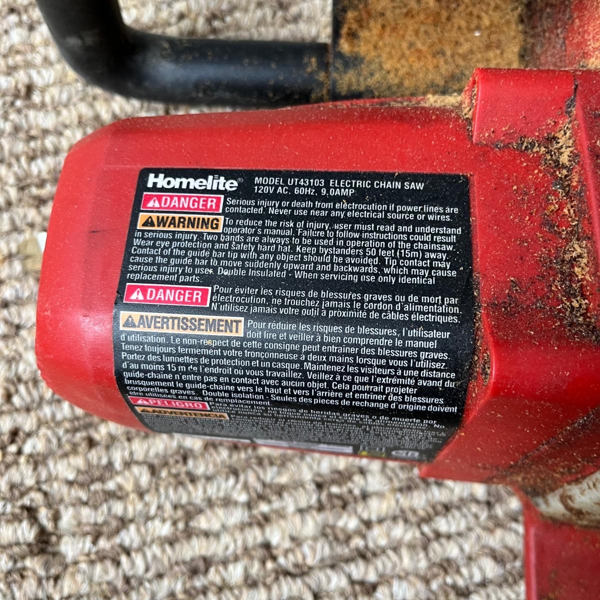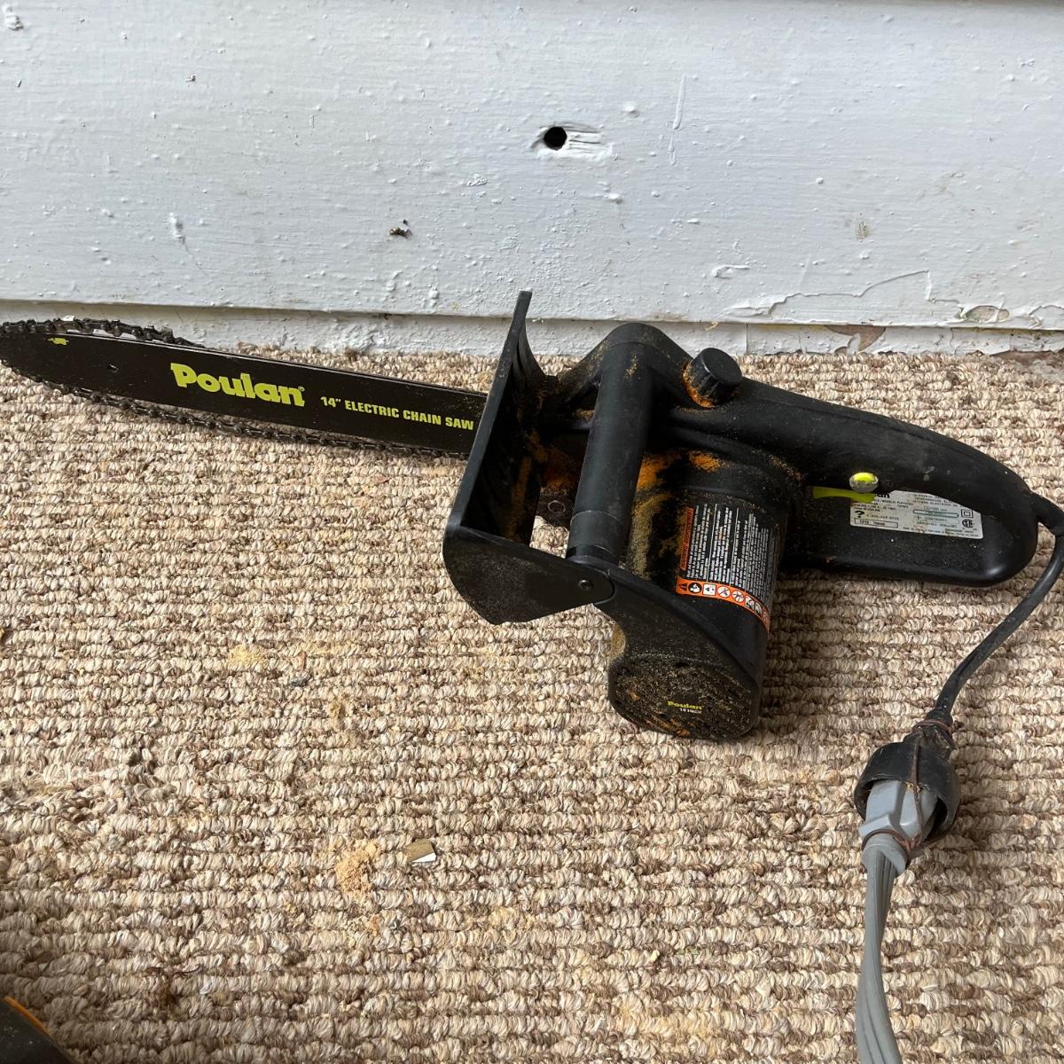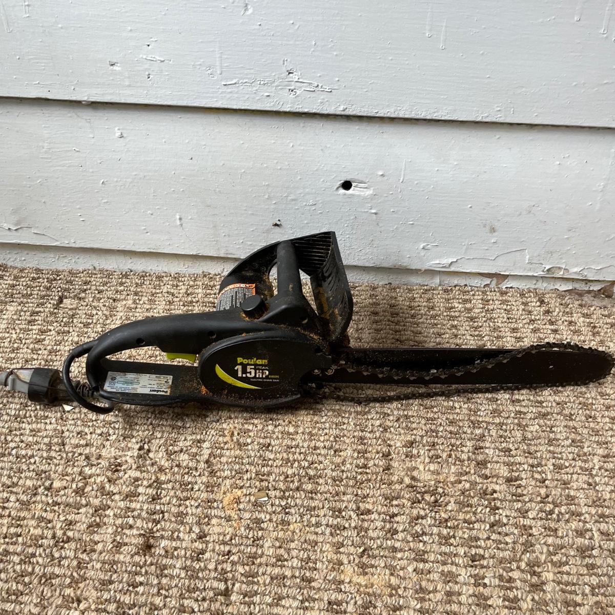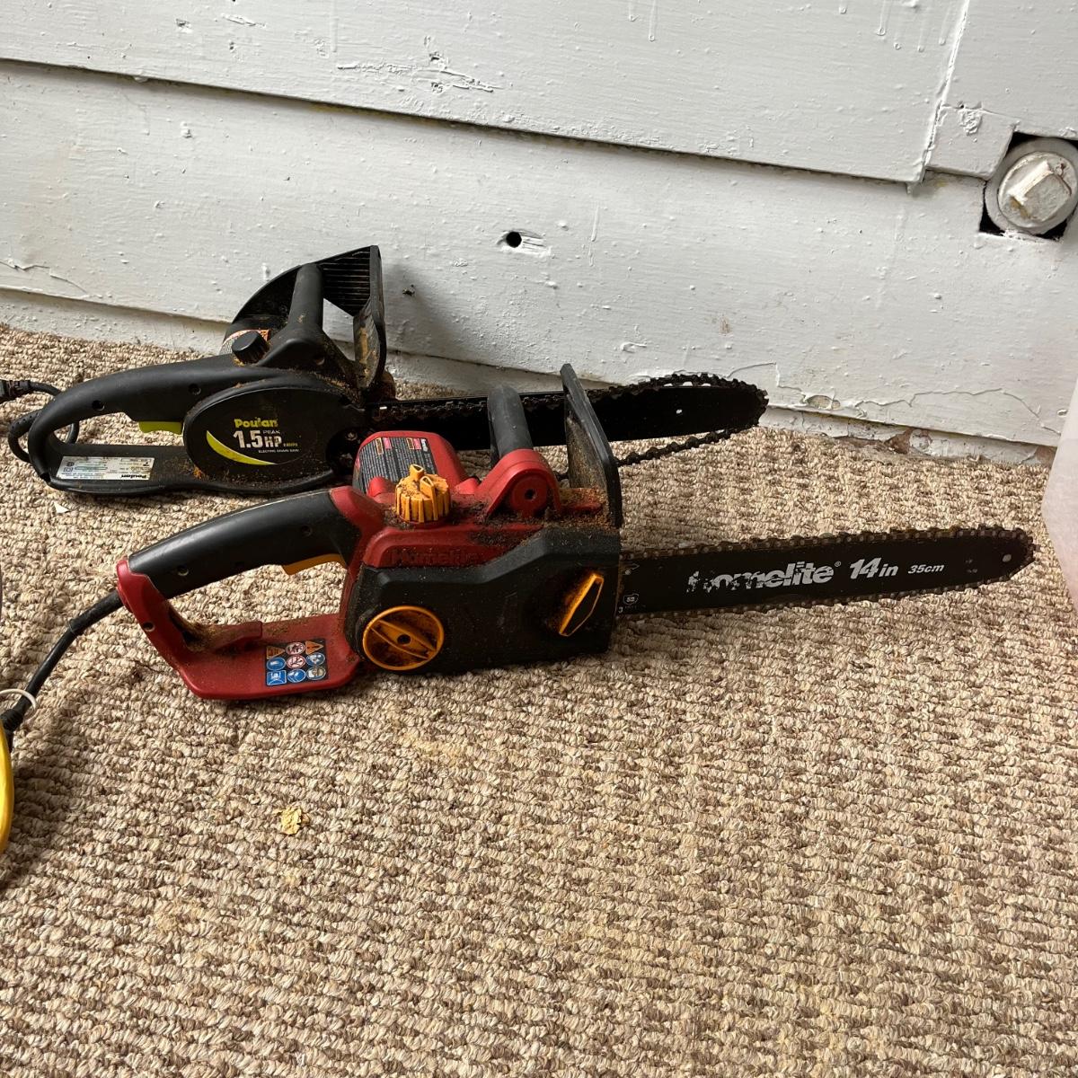 Lot includes a Homelite electric 14” chainsaw model # UT43103 and a Poulan electric 14” chainsaw model # PLN1514. Homelite saw worked when tested, Poulan saw was not tested as chain is off.