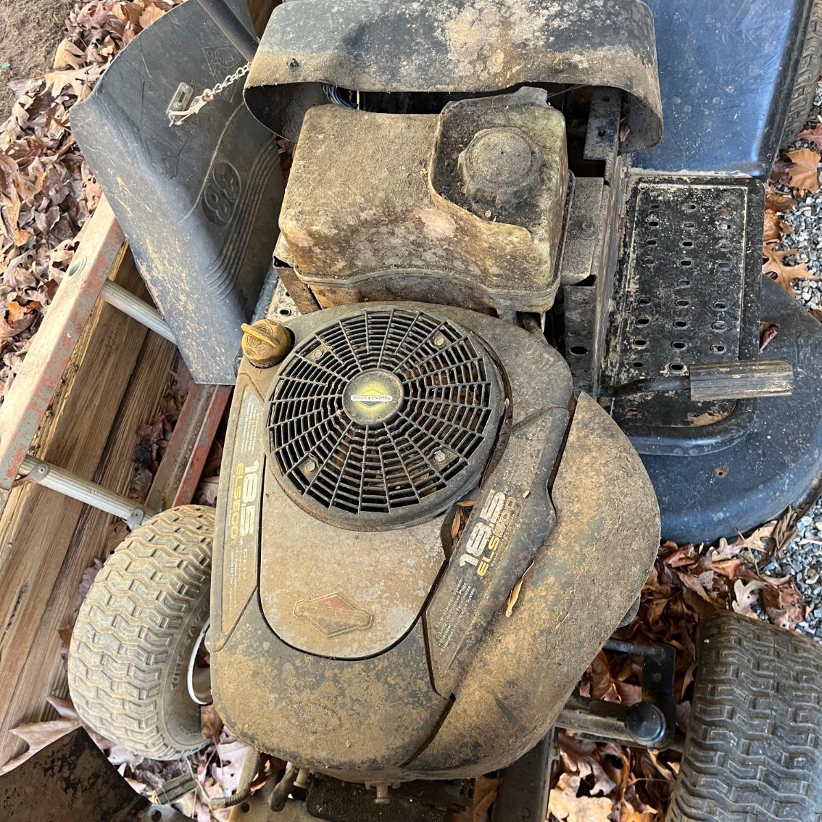 Lot includes a Poulan riding lawnmower with 38” cut and a 15.5HP Briggs & Stratton motor. Mower has dead battery and no gas so it was not tested. Tires are flat and show signs of dry rot.