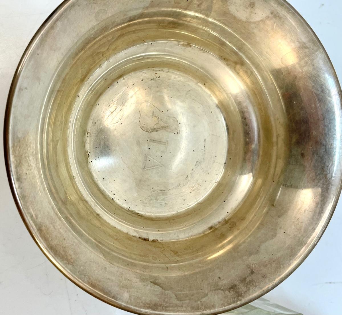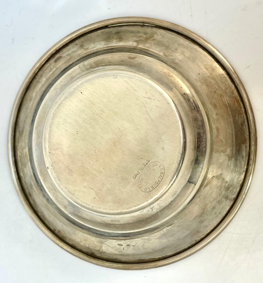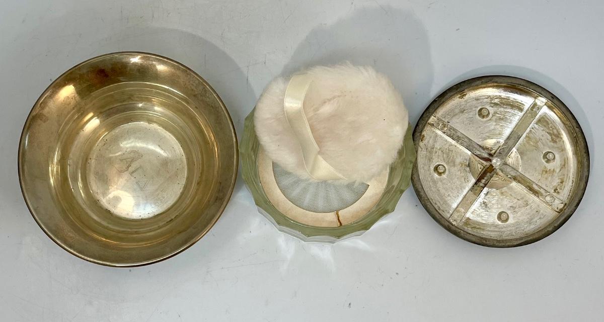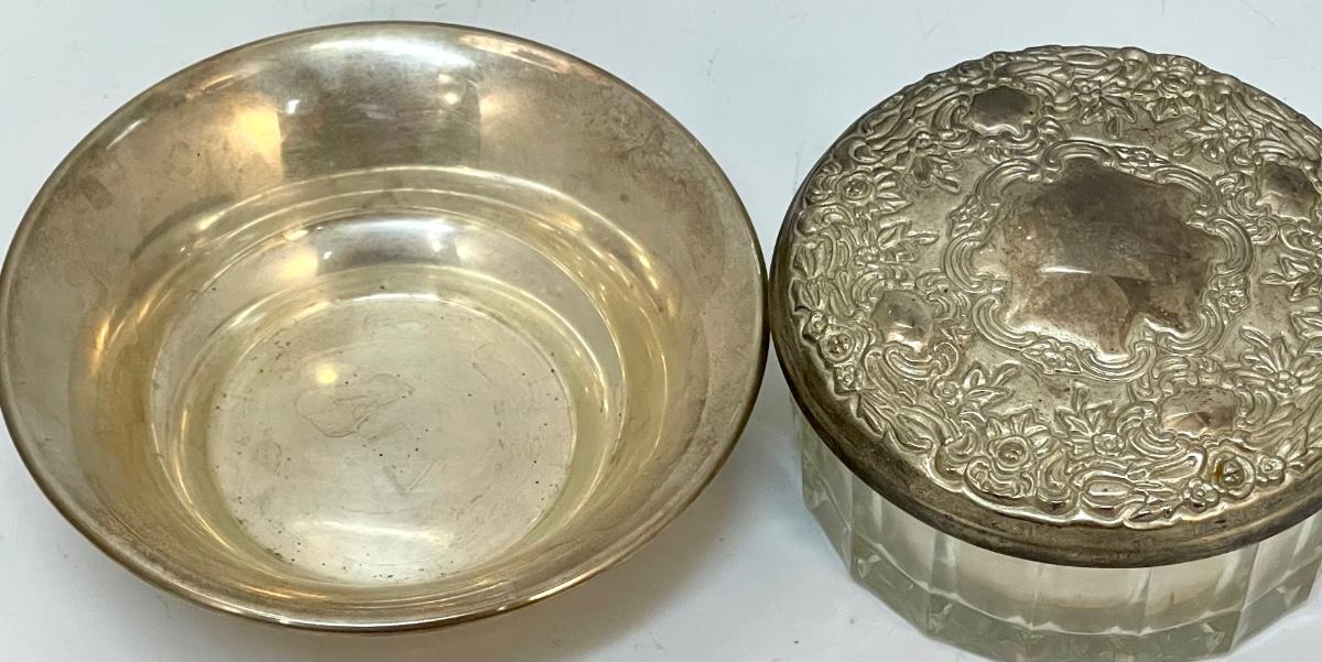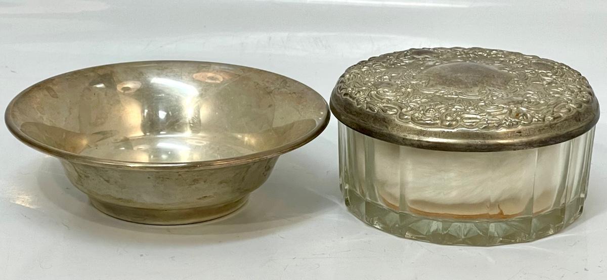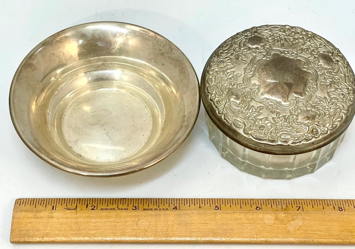 Vintage Powder Container & Balfour Sterling Silver Small Dish Bowl. The powder holder is glass with a silver plate lid. The small sterling bowl is lightweight from Balfour. Both are about the same 4.5" size.