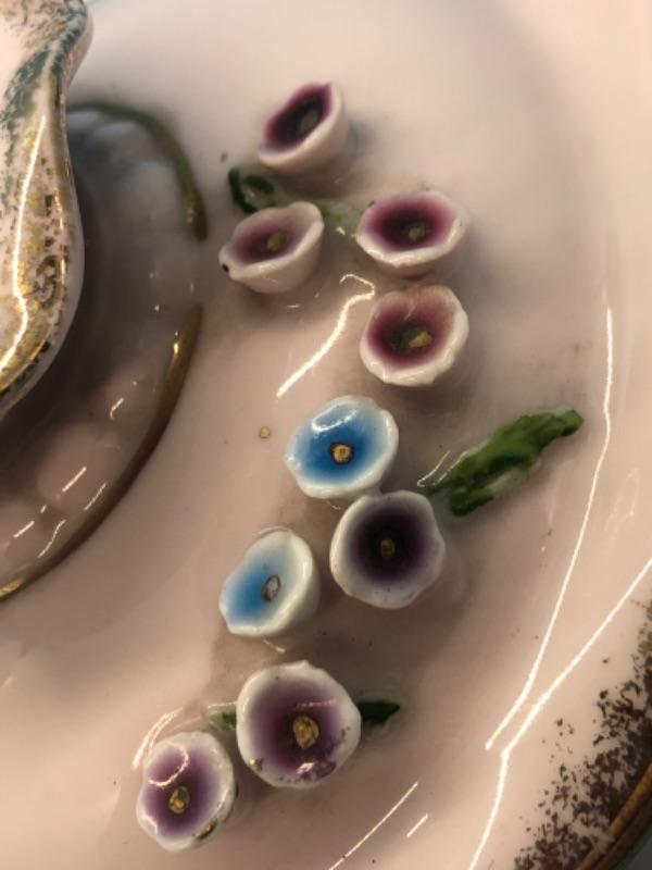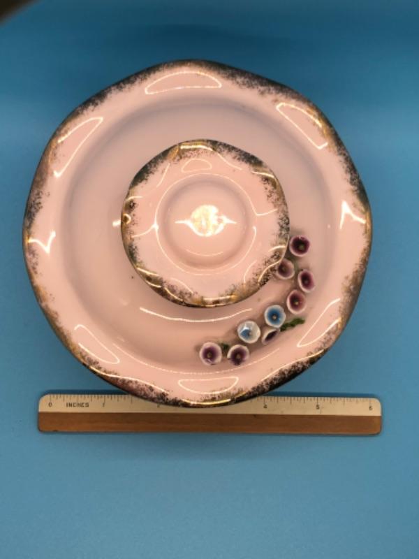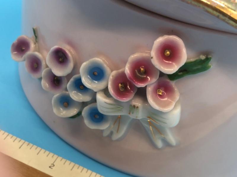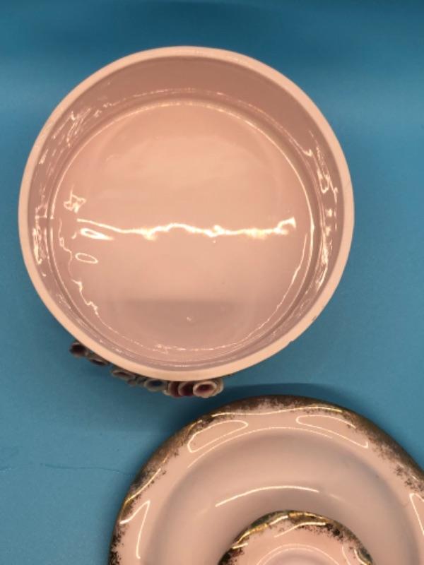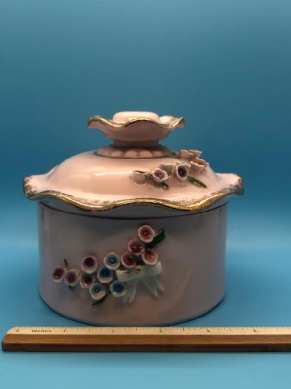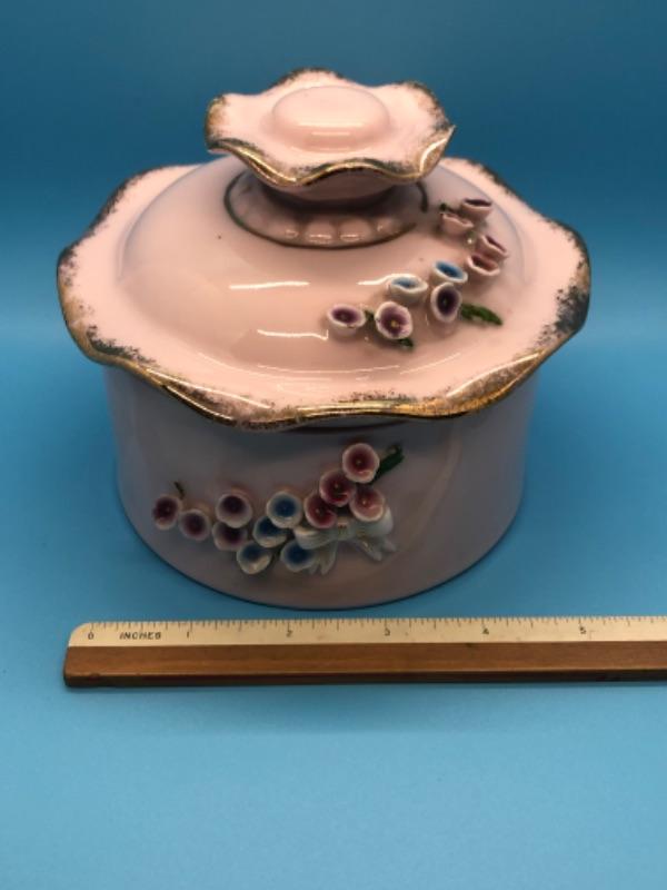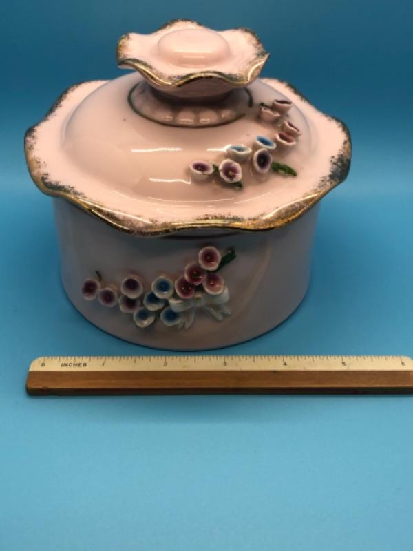 Powder puff or candy dish lidded round pink ceramic w 3D flowers