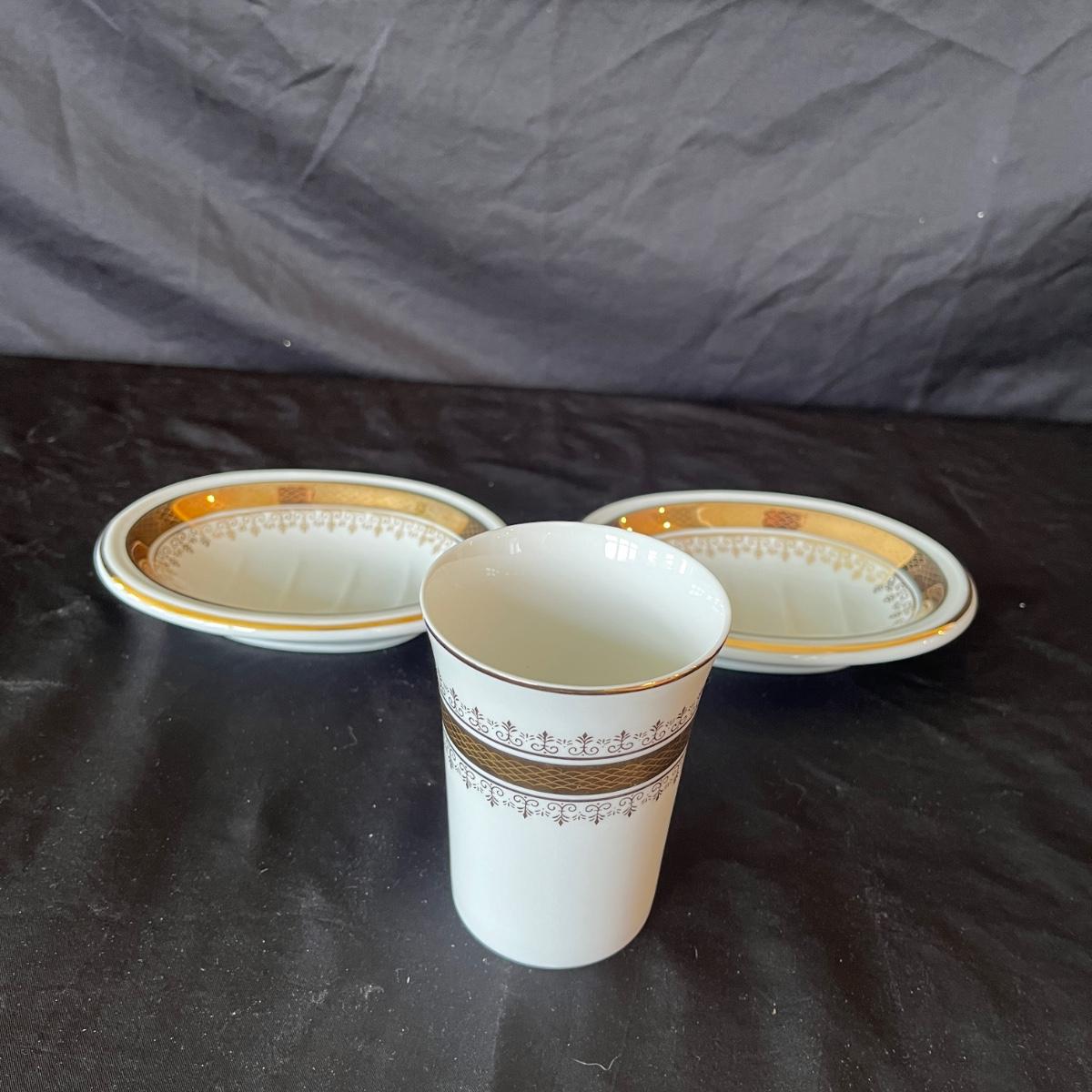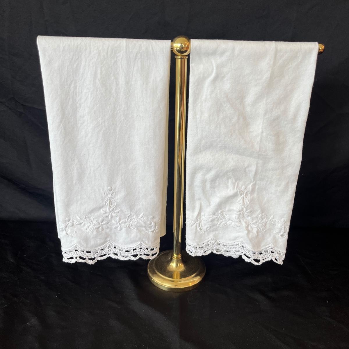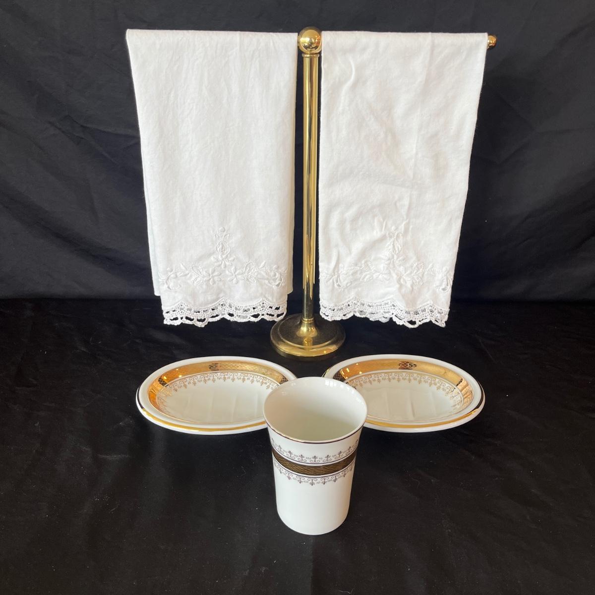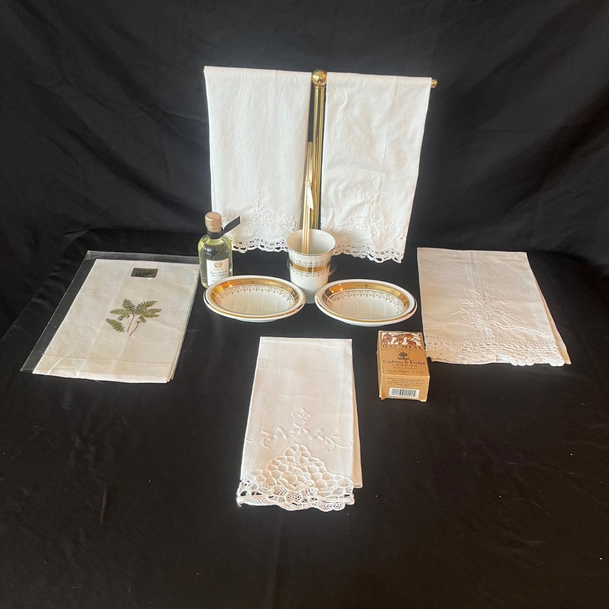 Lot includes a small brass hand towel holder three hand towels, two soap dishes, cup, diffuser liquid and reeds and a pack of paper napkins. Towel holder measures 12” x 12”H.