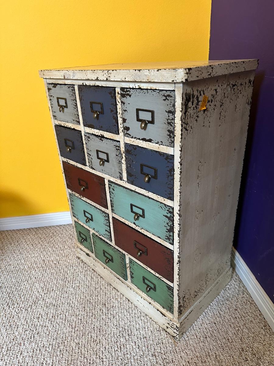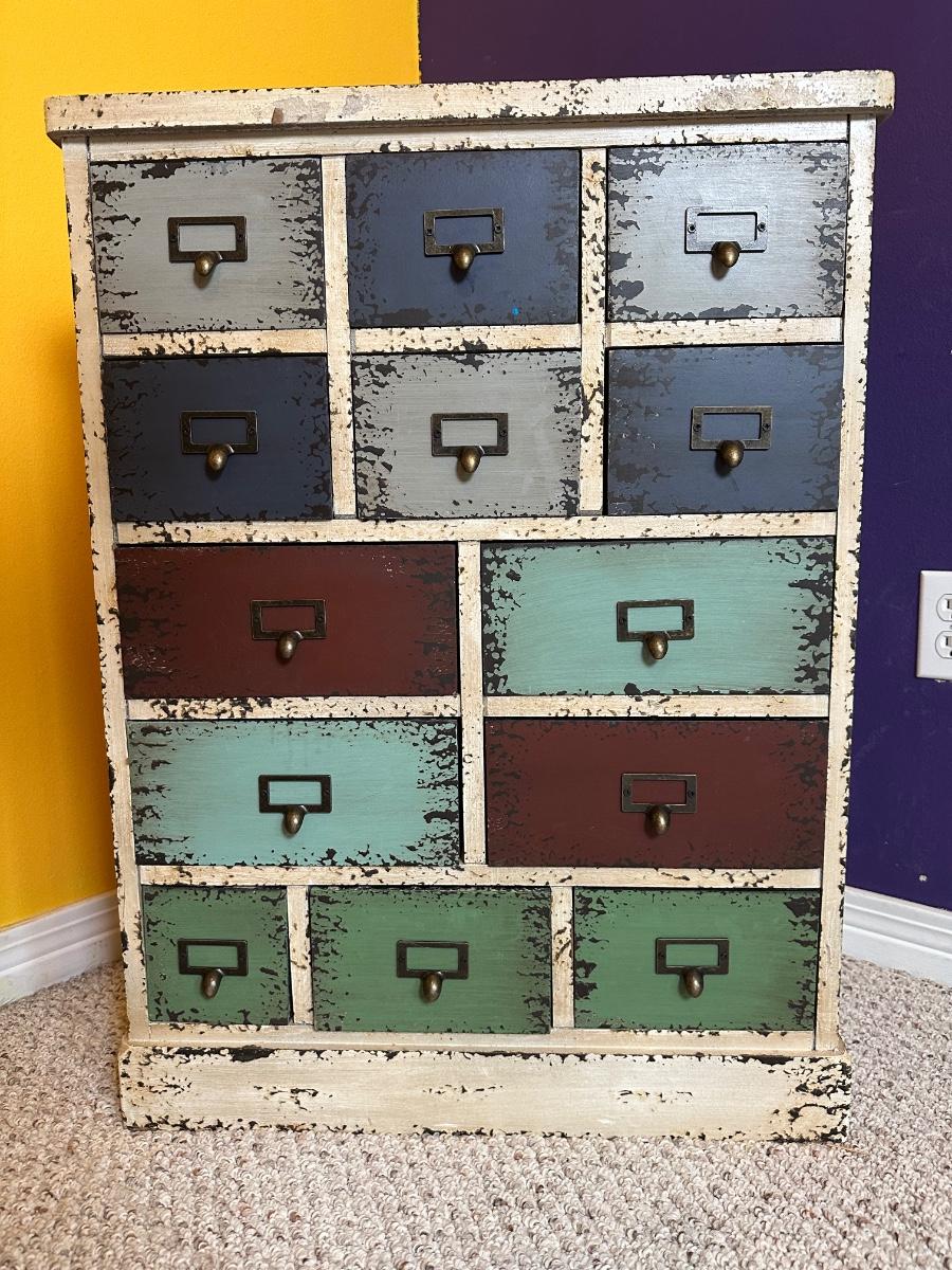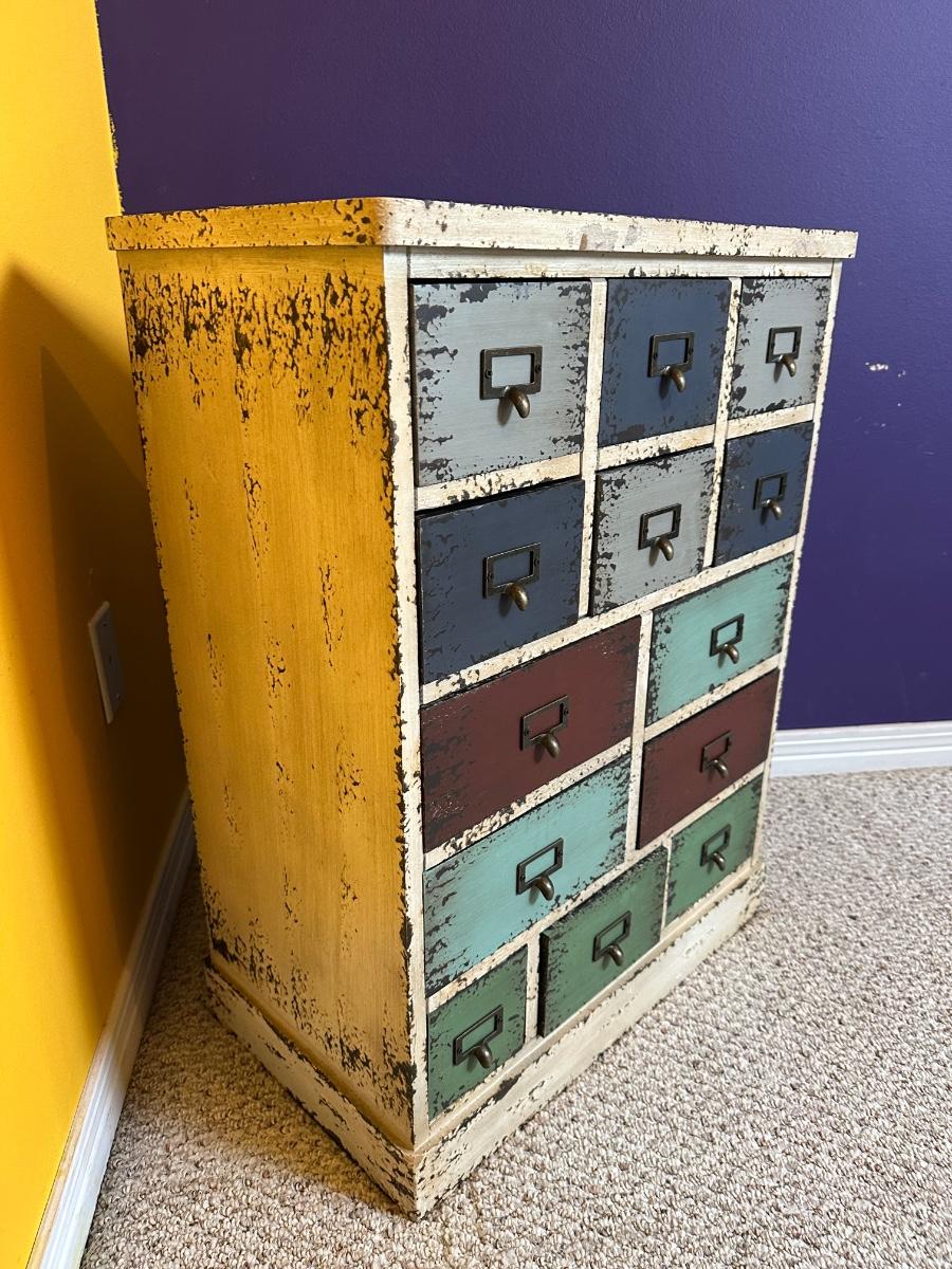 Colorful storage chest by Powell (model 990-333T2, manufactured 2012).