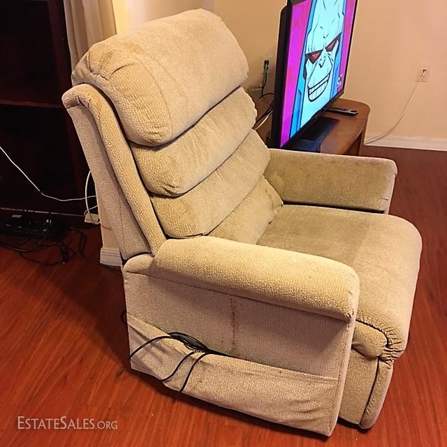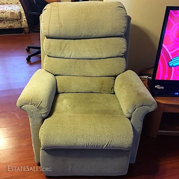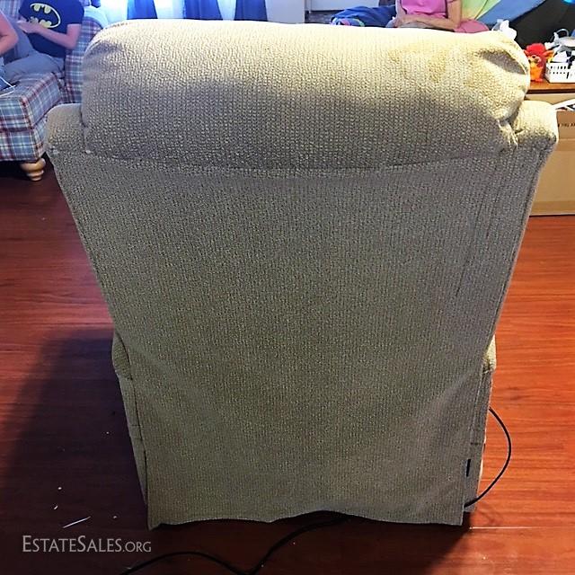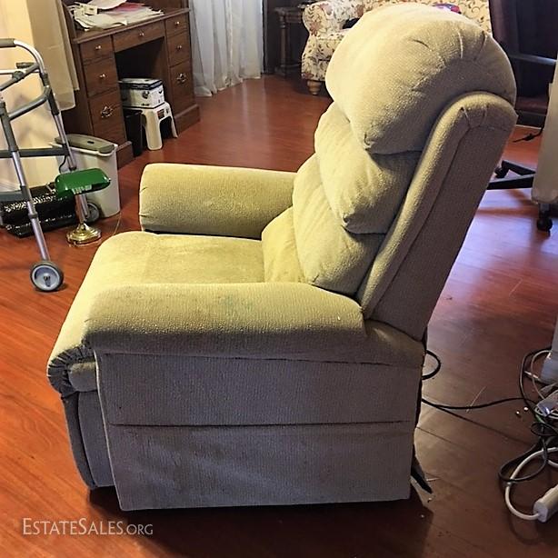 This piece is still operational and is ideal for those who might require assistance with sitting or standing. The piece does have some staining which may be able to be removed. The overall condition of this piece is fair. Dimensions of this piece are as follows: 42" in total height, 34" in depth, 34: in width. The color of this chair is beige despite the green hue seen in our pictures. Any items pictured surrounding this chair are not part of the auction for this item