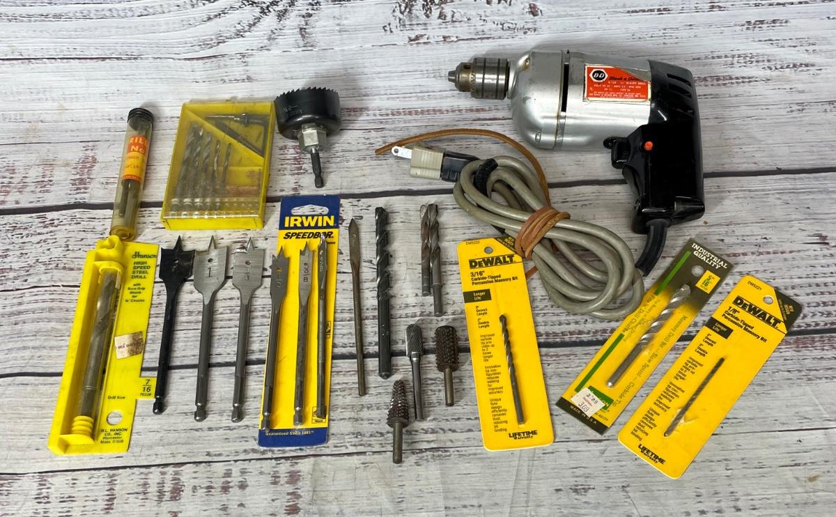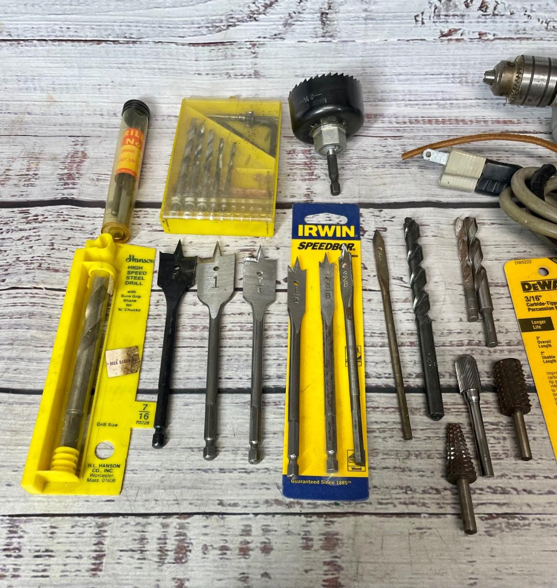 Black and Decker 3/8” drill with accessory lot: 7 speed arbors, 5 high speed drill bits, 4 masonry bits, 3 reamers, 1 box of assorted drill bits and chuck key, 2 1/8” door knob hole saw.