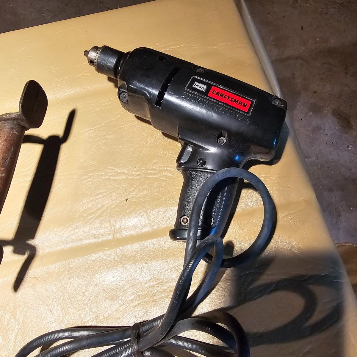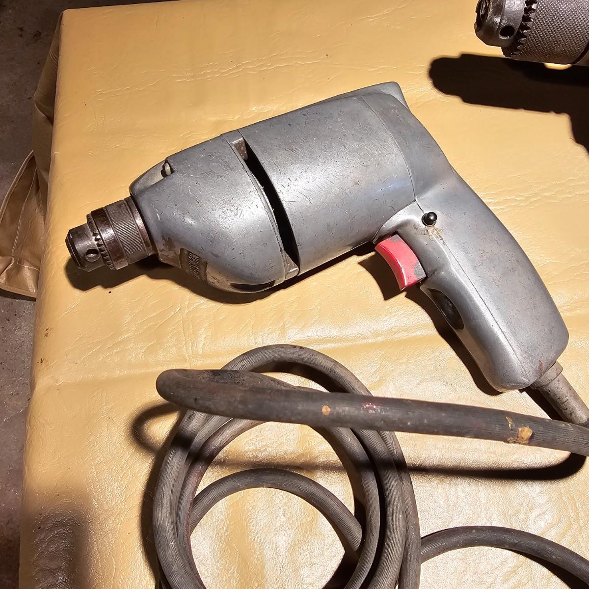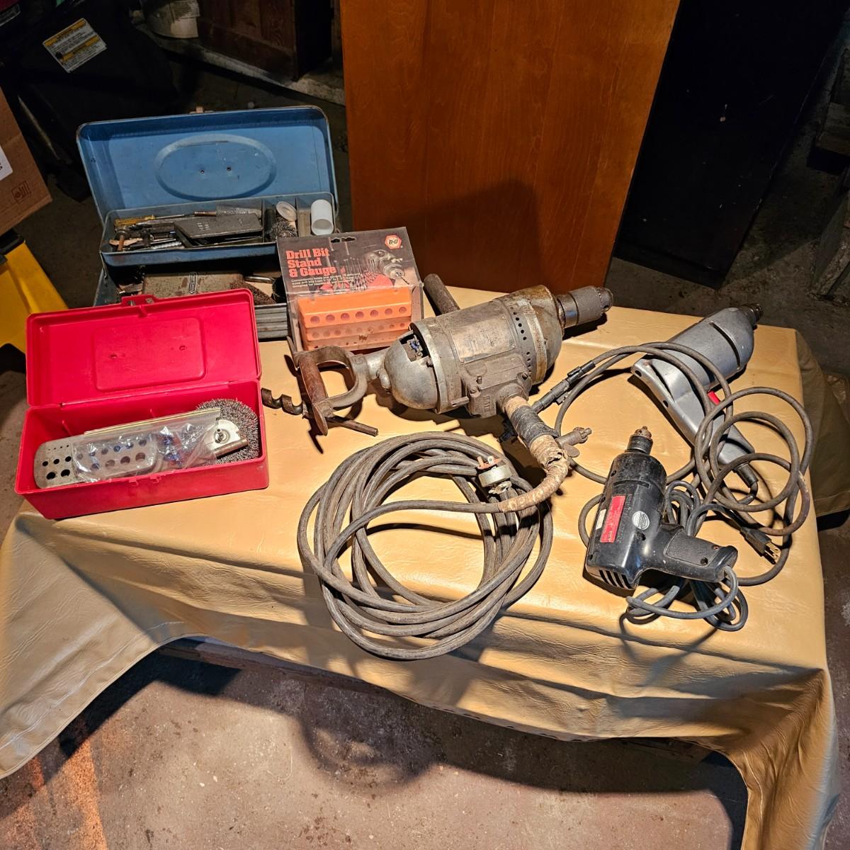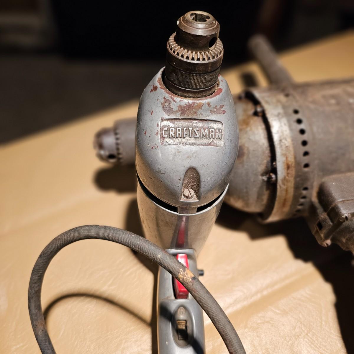 Three vintage drills, two Craftsman 1/4" drills, one has old style metal housing. Third drill is old Westinghouse produced for United States Electrical Tool Co., has top handle and rear grip handle. May possibly be a geared drill. Missing some body plates and needing rewired, see photos for details. All items powered on when plugged in. Also includes various drill bits, wire brushes and more. Shipping available.