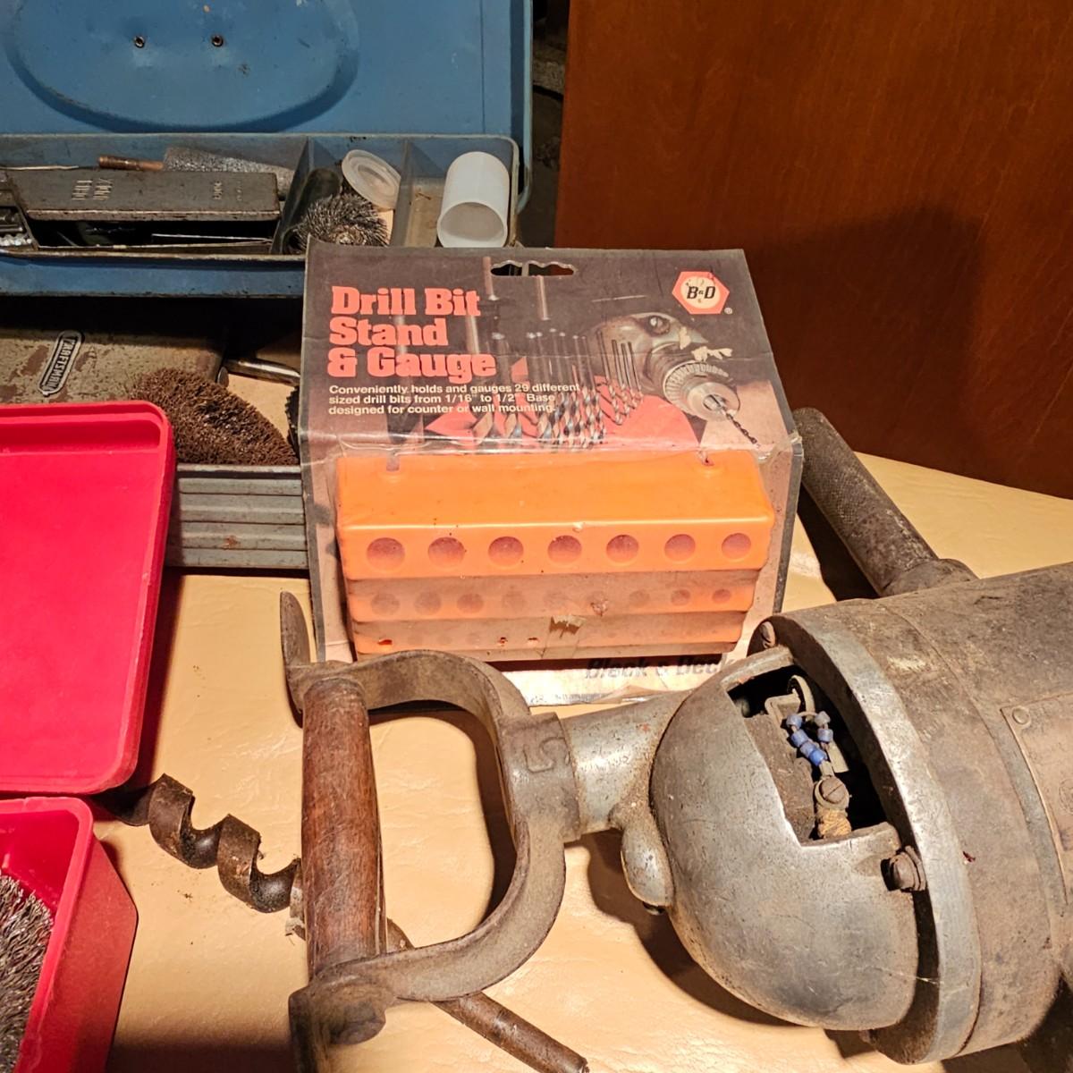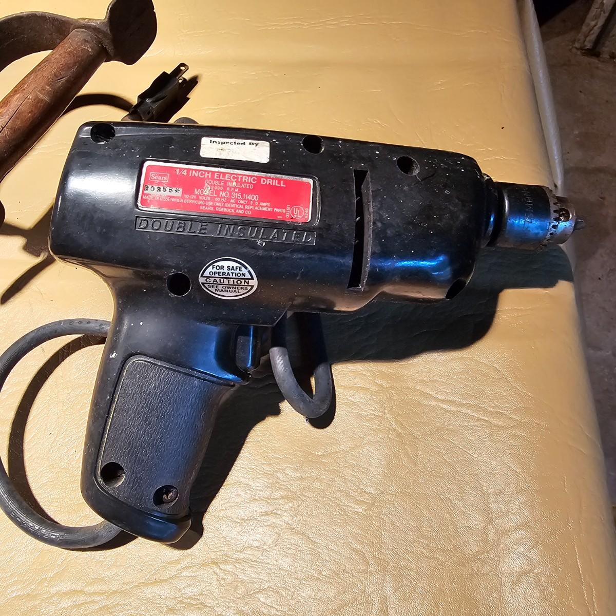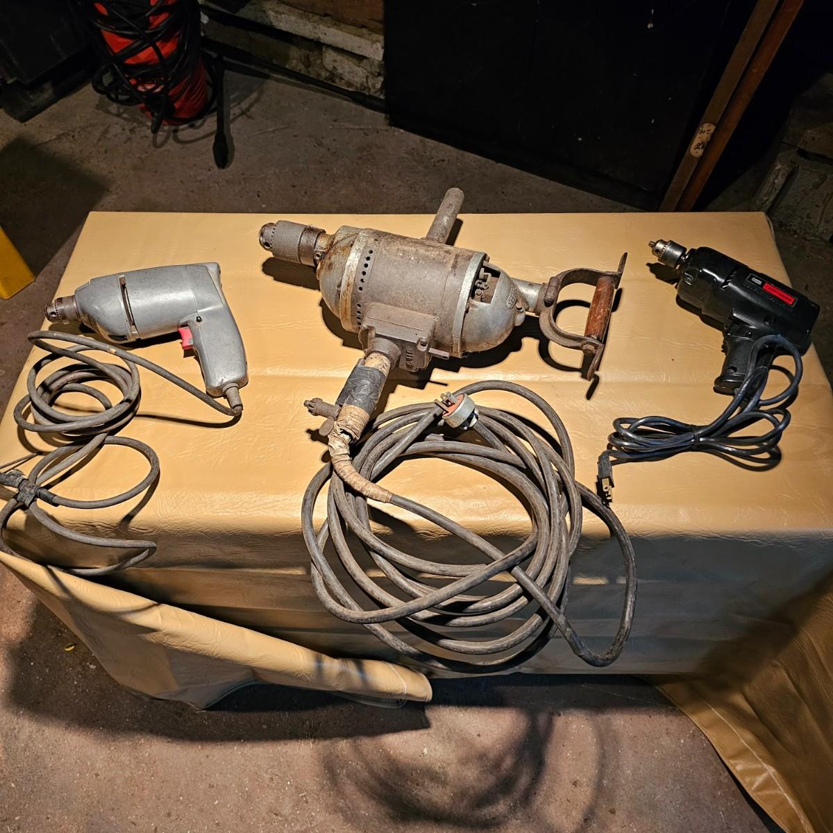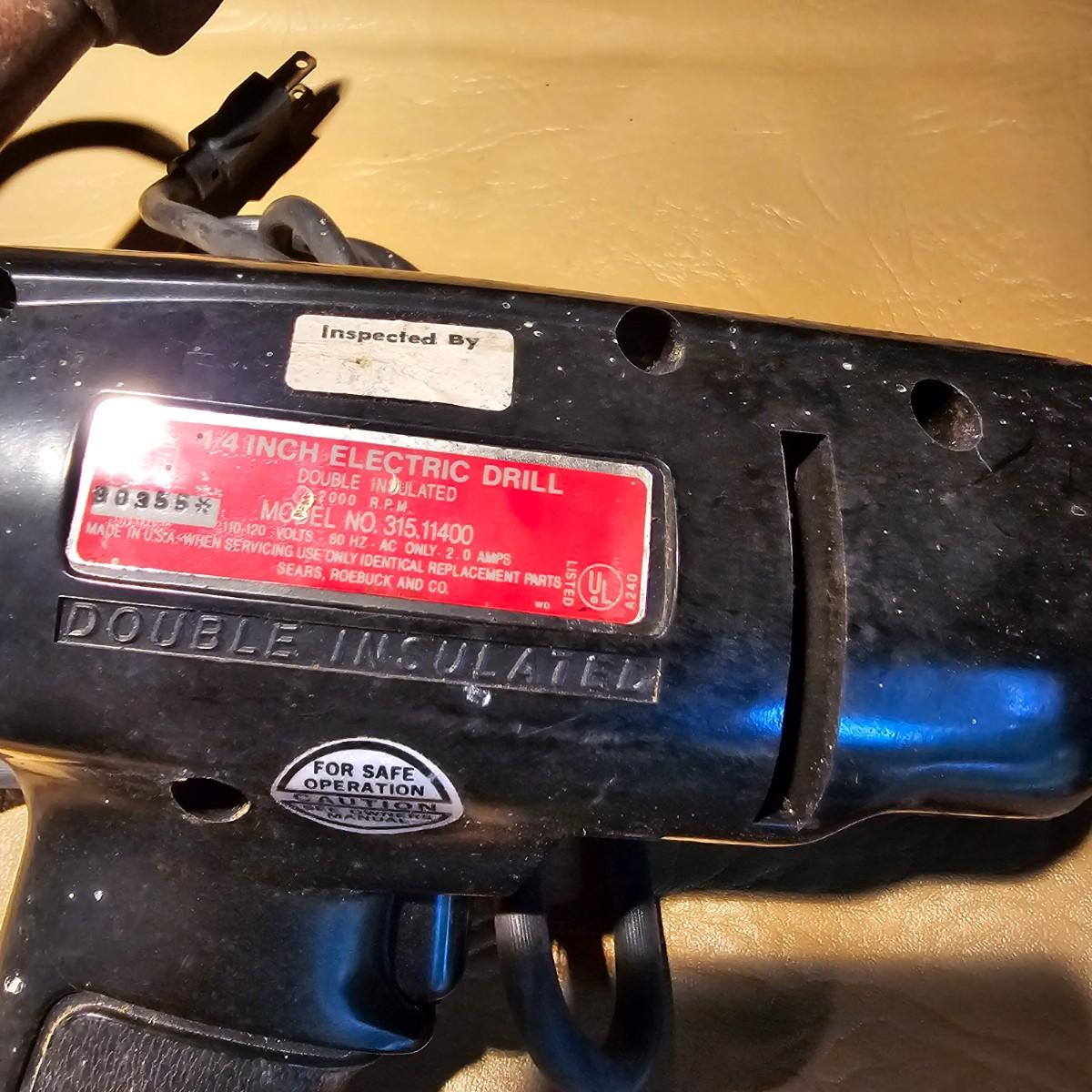 Three vintage drills, two Craftsman 1/4" drills, one has old style metal housing. Third drill is old Westinghouse produced for United States Electrical Tool Co., has top handle and rear grip handle. May possibly be a geared drill. Missing some body plates and needing rewired, see photos for details. All items powered on when plugged in. Also includes various drill bits, wire brushes and more. Shipping available.