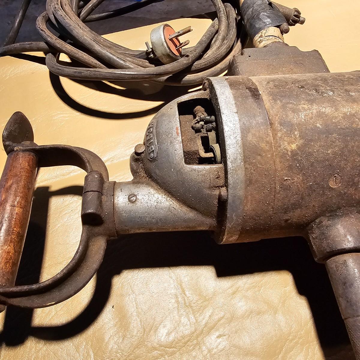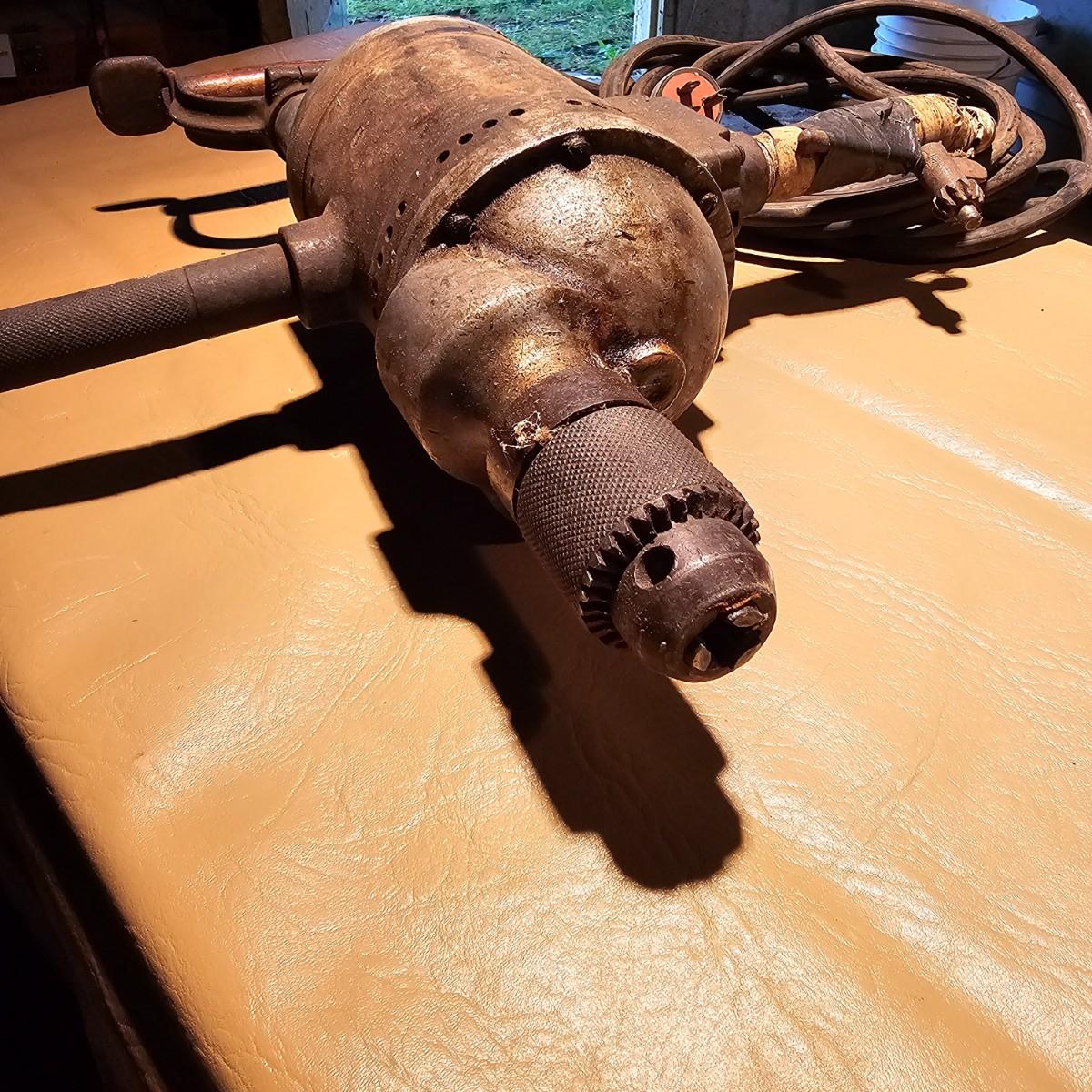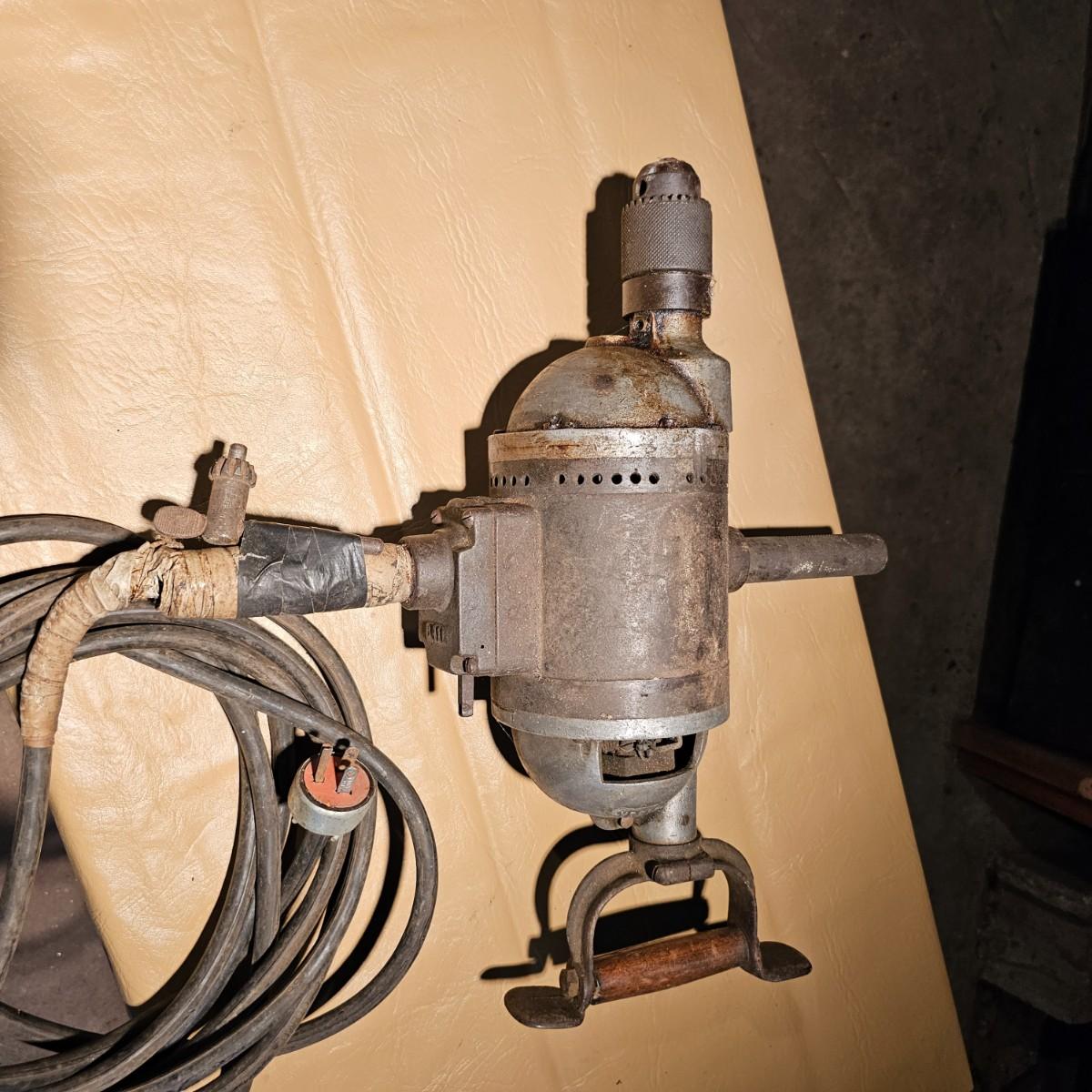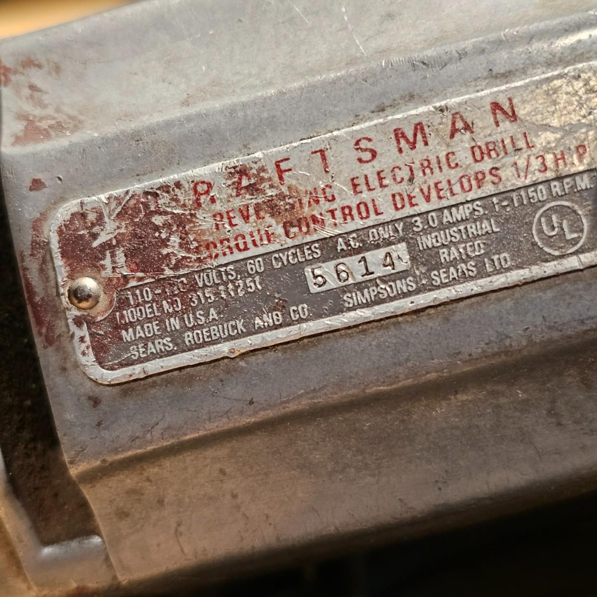 Three vintage drills, two Craftsman 1/4" drills, one has old style metal housing. Third drill is old Westinghouse produced for United States Electrical Tool Co., has top handle and rear grip handle. May possibly be a geared drill. Missing some body plates and needing rewired, see photos for details. All items powered on when plugged in. Also includes various drill bits, wire brushes and more. Shipping available.