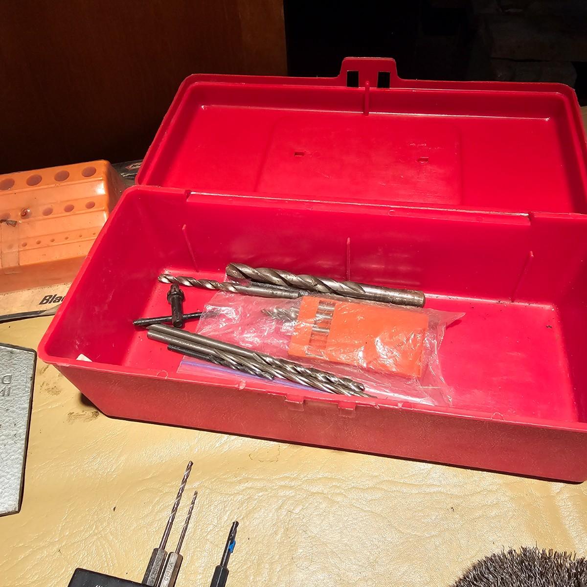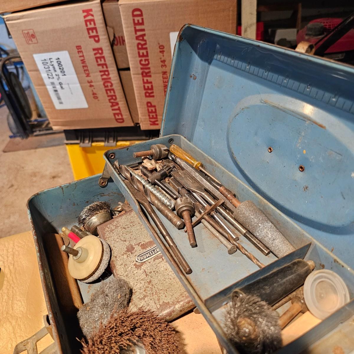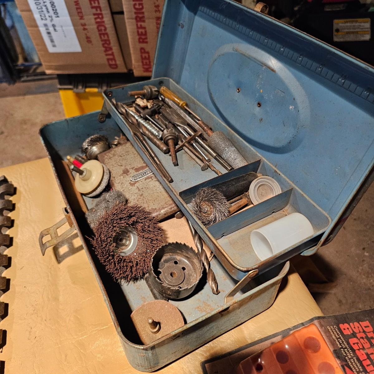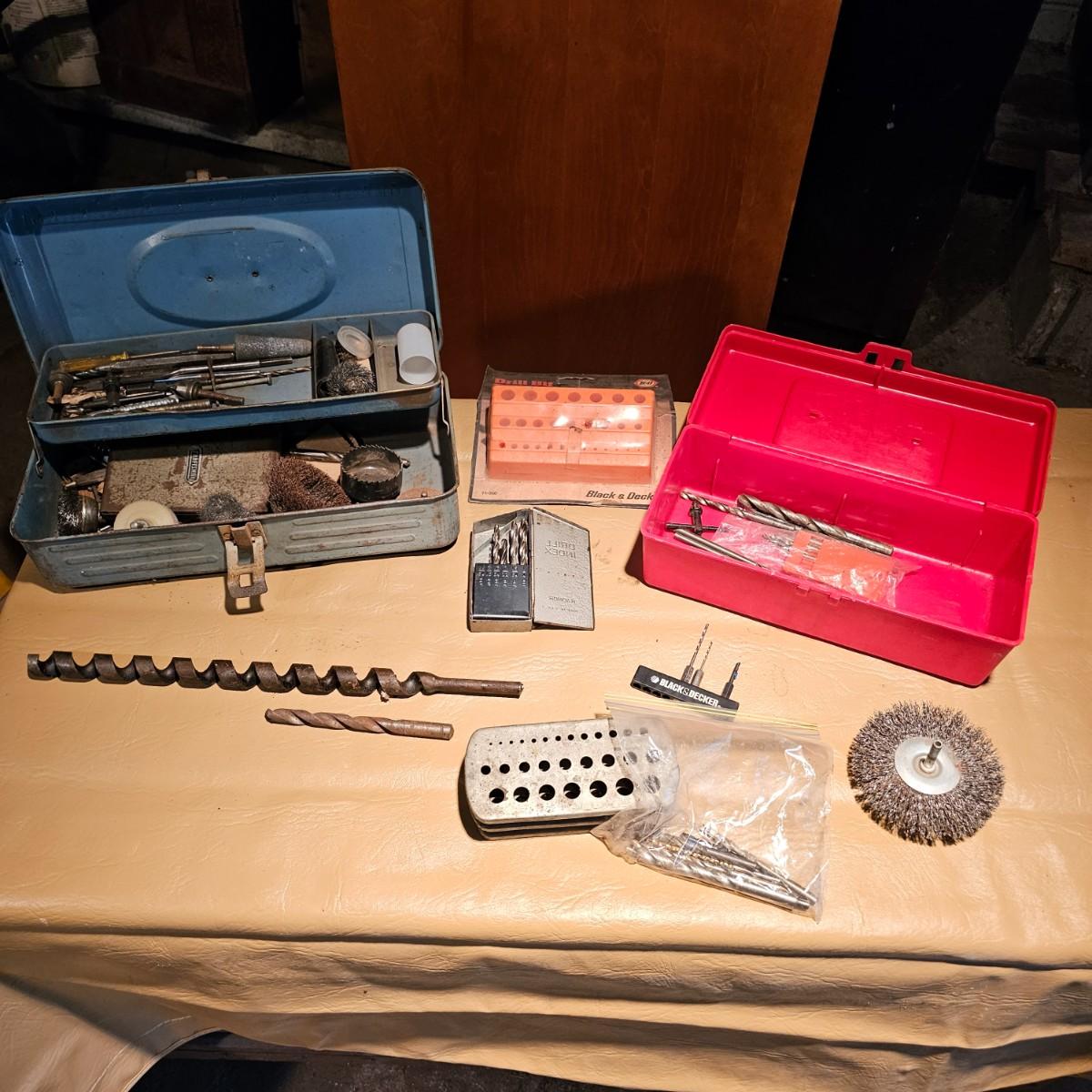 Three vintage drills, two Craftsman 1/4" drills, one has old style metal housing. Third drill is old Westinghouse produced for United States Electrical Tool Co., has top handle and rear grip handle. May possibly be a geared drill. Missing some body plates and needing rewired, see photos for details. All items powered on when plugged in. Also includes various drill bits, wire brushes and more. Shipping available.