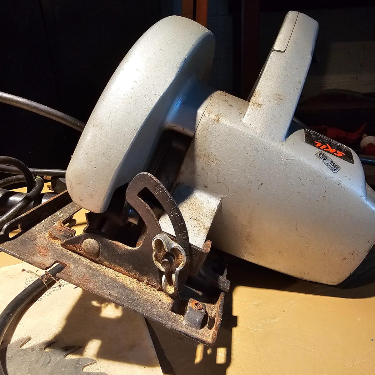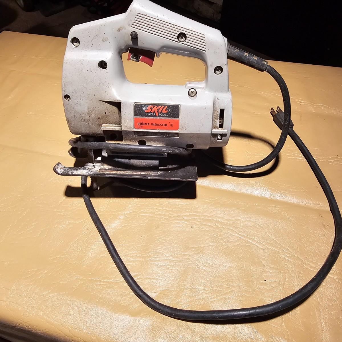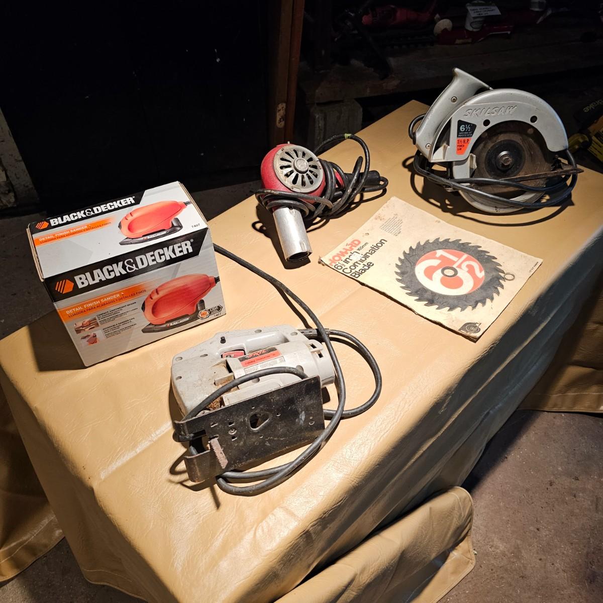 Four small powered hand tools. One Black & Decker detail finish sander, NIB. One vintage 1500w heat gun. One 6.5" Skilsaw circular saw with extra blade, and one Skil jigsaw. All items powered on when plugged in. See photos for details. Shipping available.