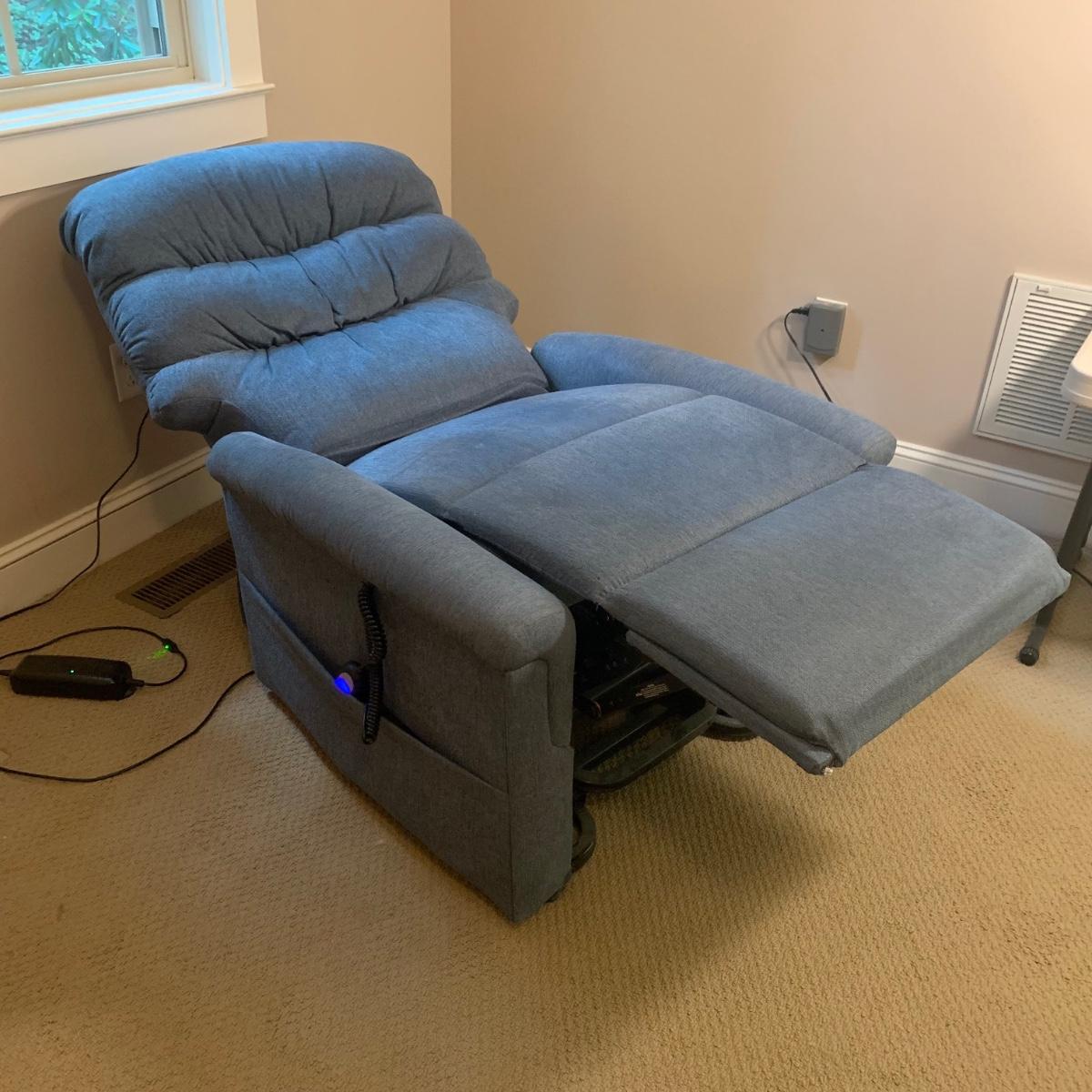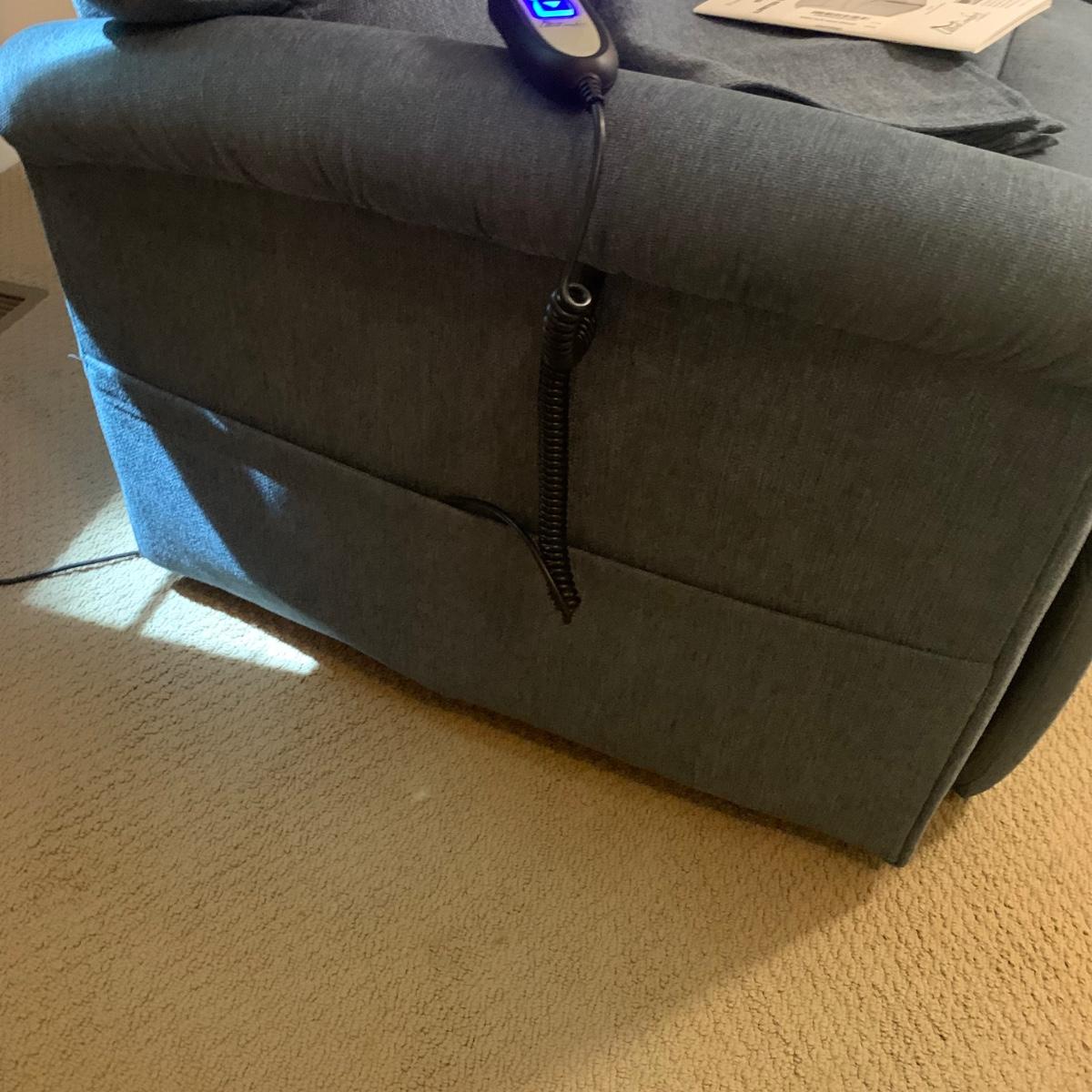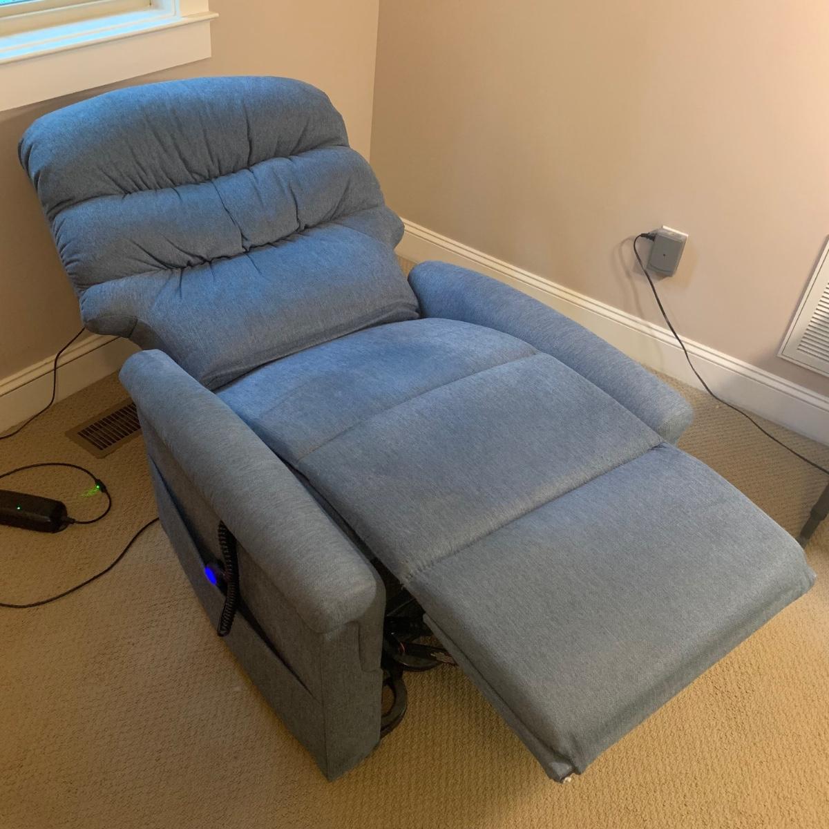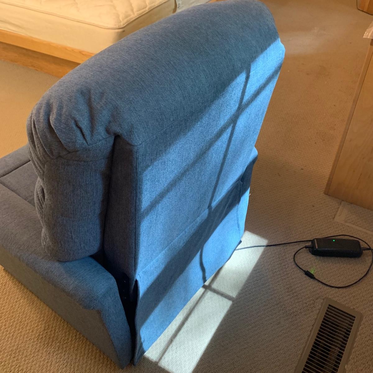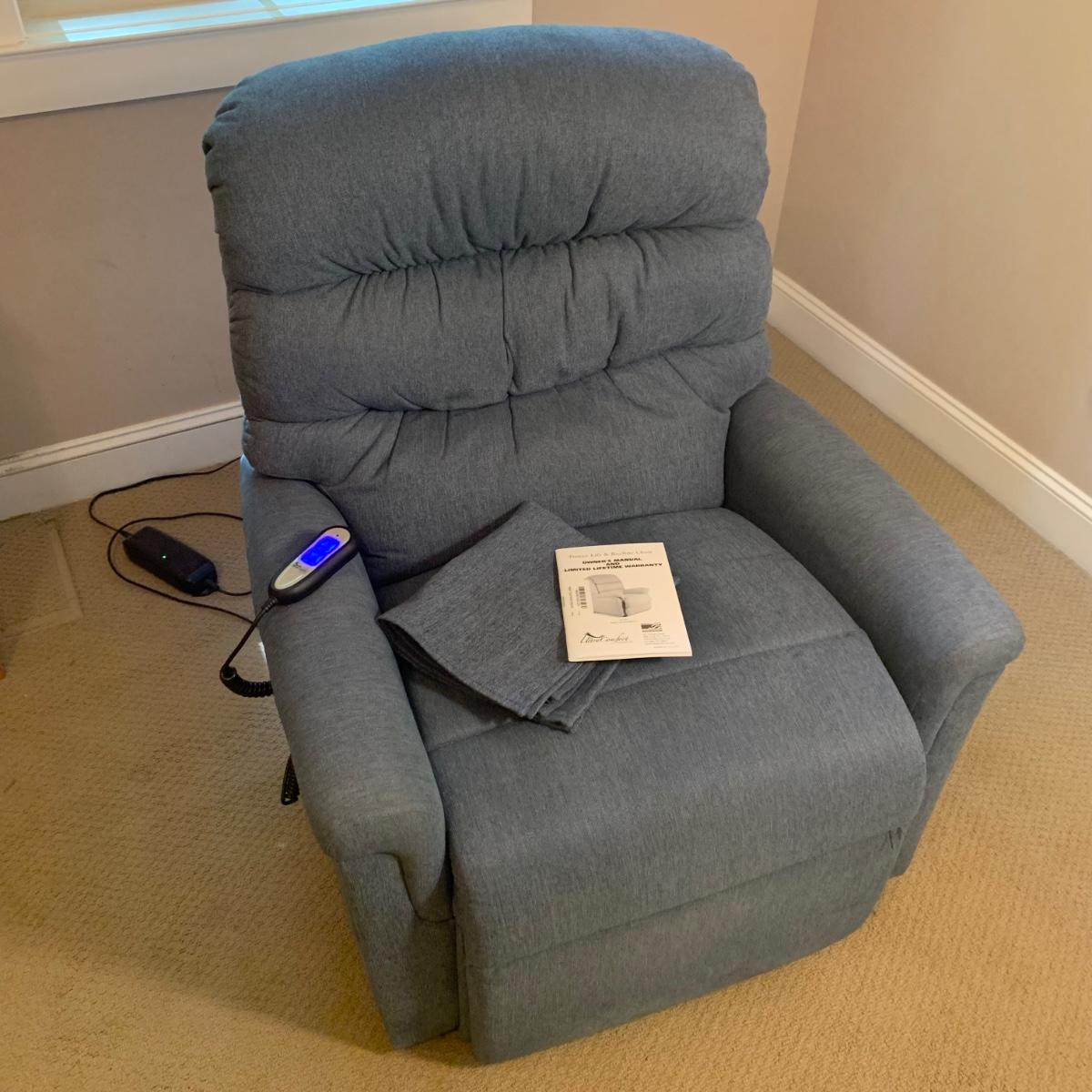 Electric power lift and recliner chair from UltraComfort America. Chair is covered in soft fabric with a denim color. Armrest and headrest protective fabric is included, as well as the Owner’s Manual. In its upright position, chair measures 34” x 32” x 39”H, with a seat height of 20”. Reclined, it is approximately 61” long. Chair powered on when plugged in and appears to function properly.