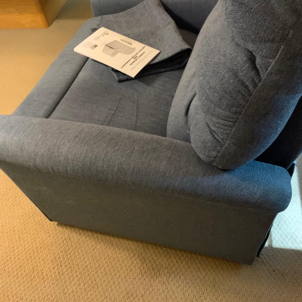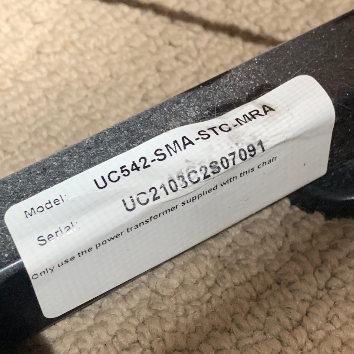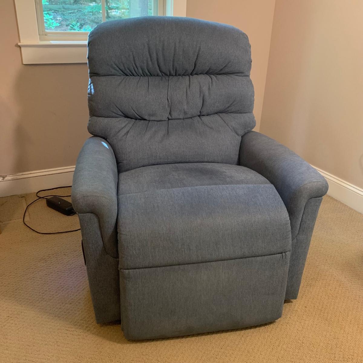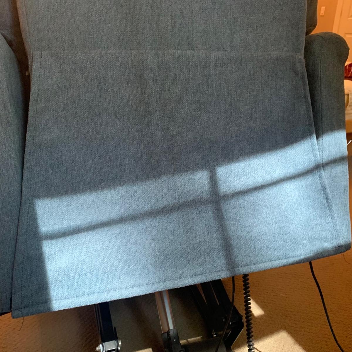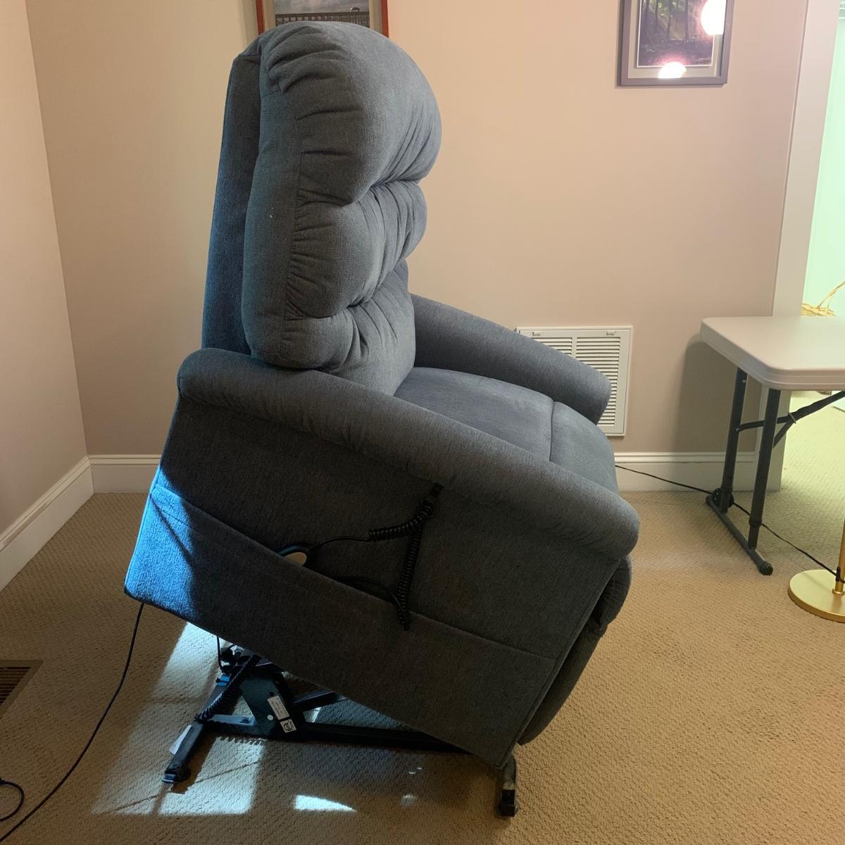 Electric power lift and recliner chair from UltraComfort America. Chair is covered in soft fabric with a denim color. Armrest and headrest protective fabric is included, as well as the Owner’s Manual. In its upright position, chair measures 34” x 32” x 39”H, with a seat height of 20”. Reclined, it is approximately 61” long. Chair powered on when plugged in and appears to function properly.