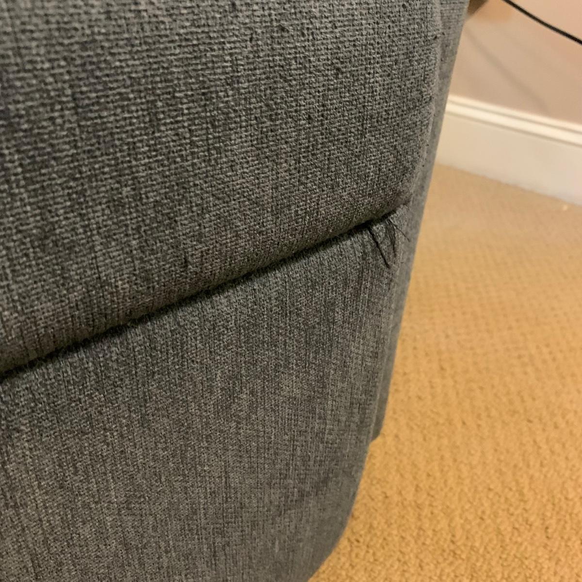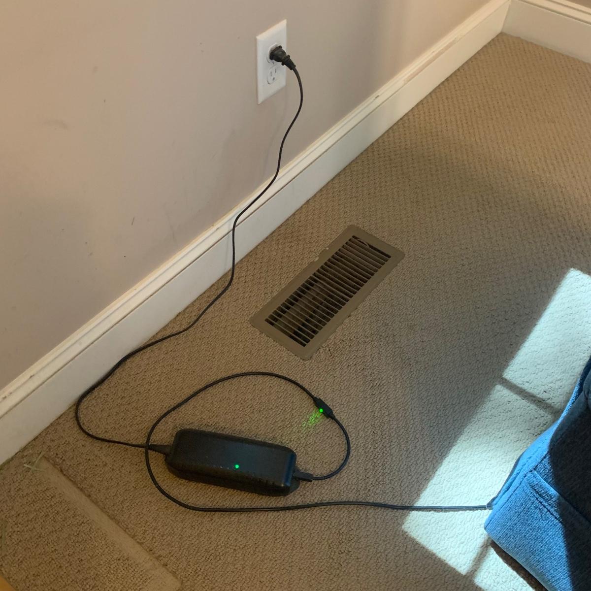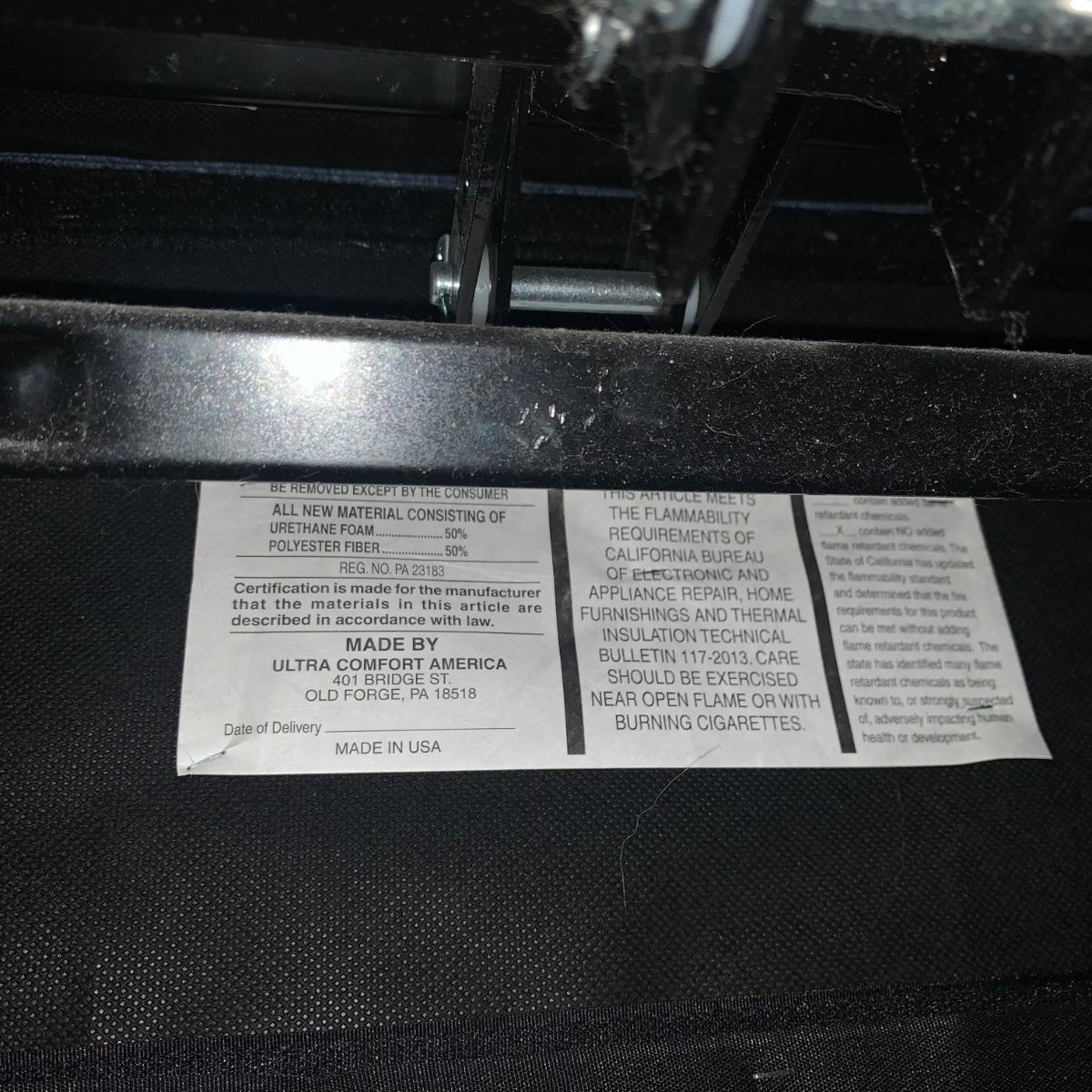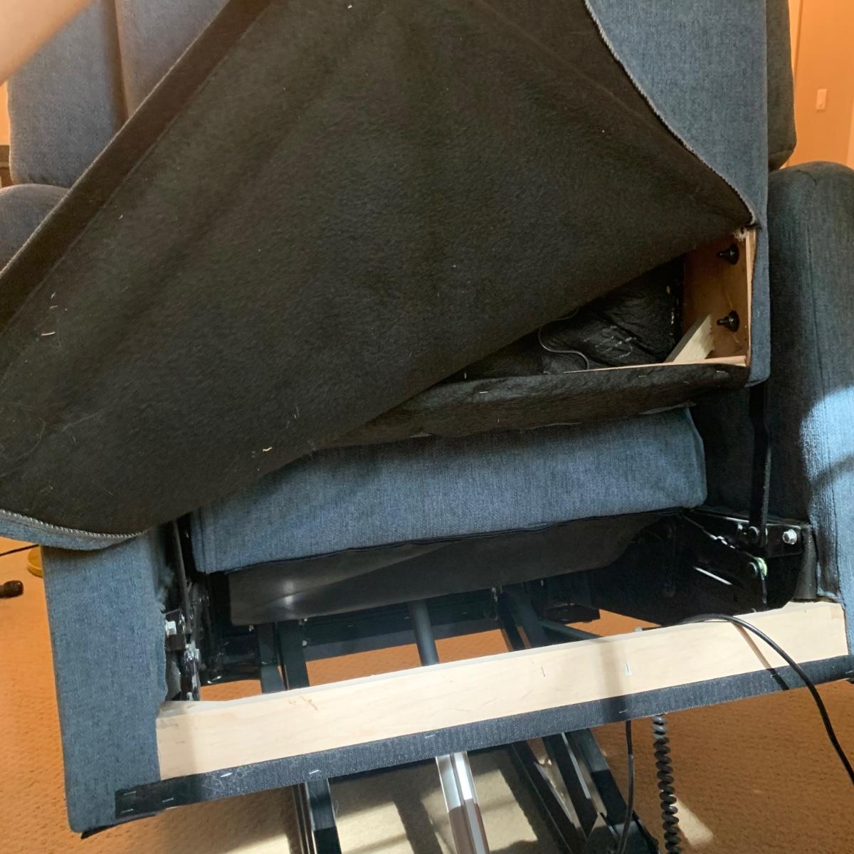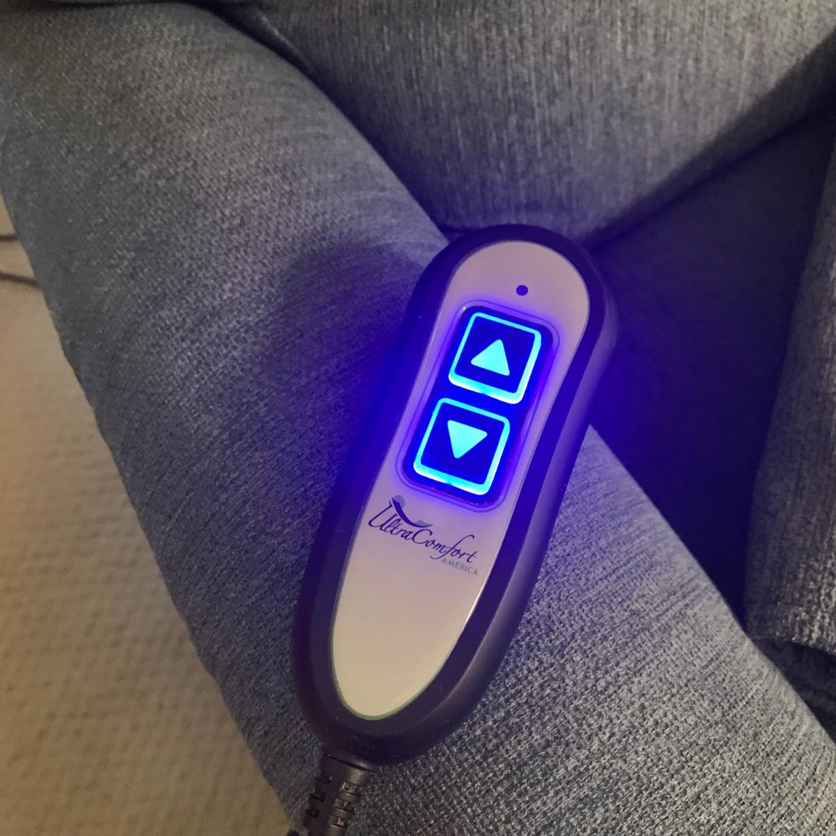 Electric power lift and recliner chair from UltraComfort America. Chair is covered in soft fabric with a denim color. Armrest and headrest protective fabric is included, as well as the Owner’s Manual. In its upright position, chair measures 34” x 32” x 39”H, with a seat height of 20”. Reclined, it is approximately 61” long. Chair powered on when plugged in and appears to function properly.