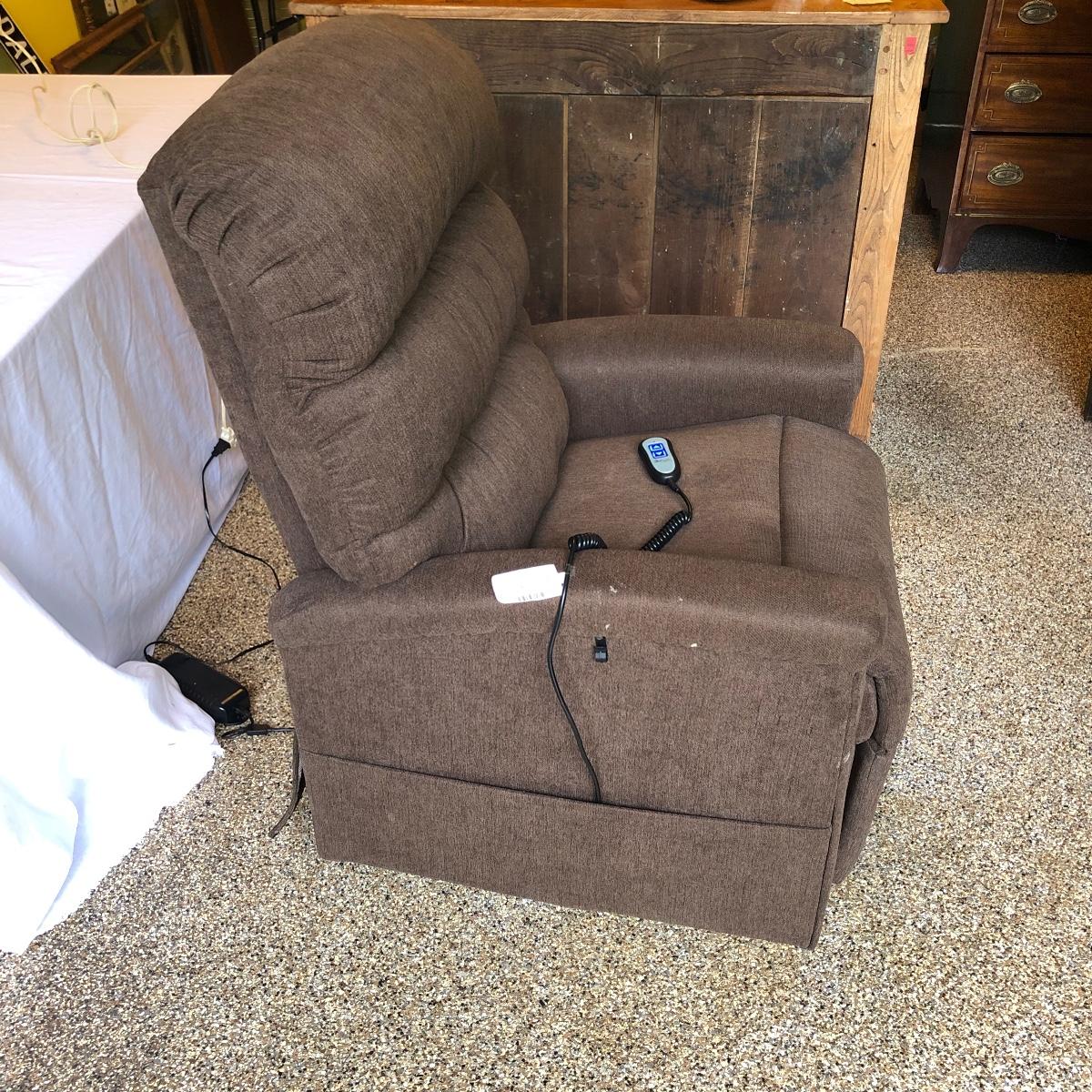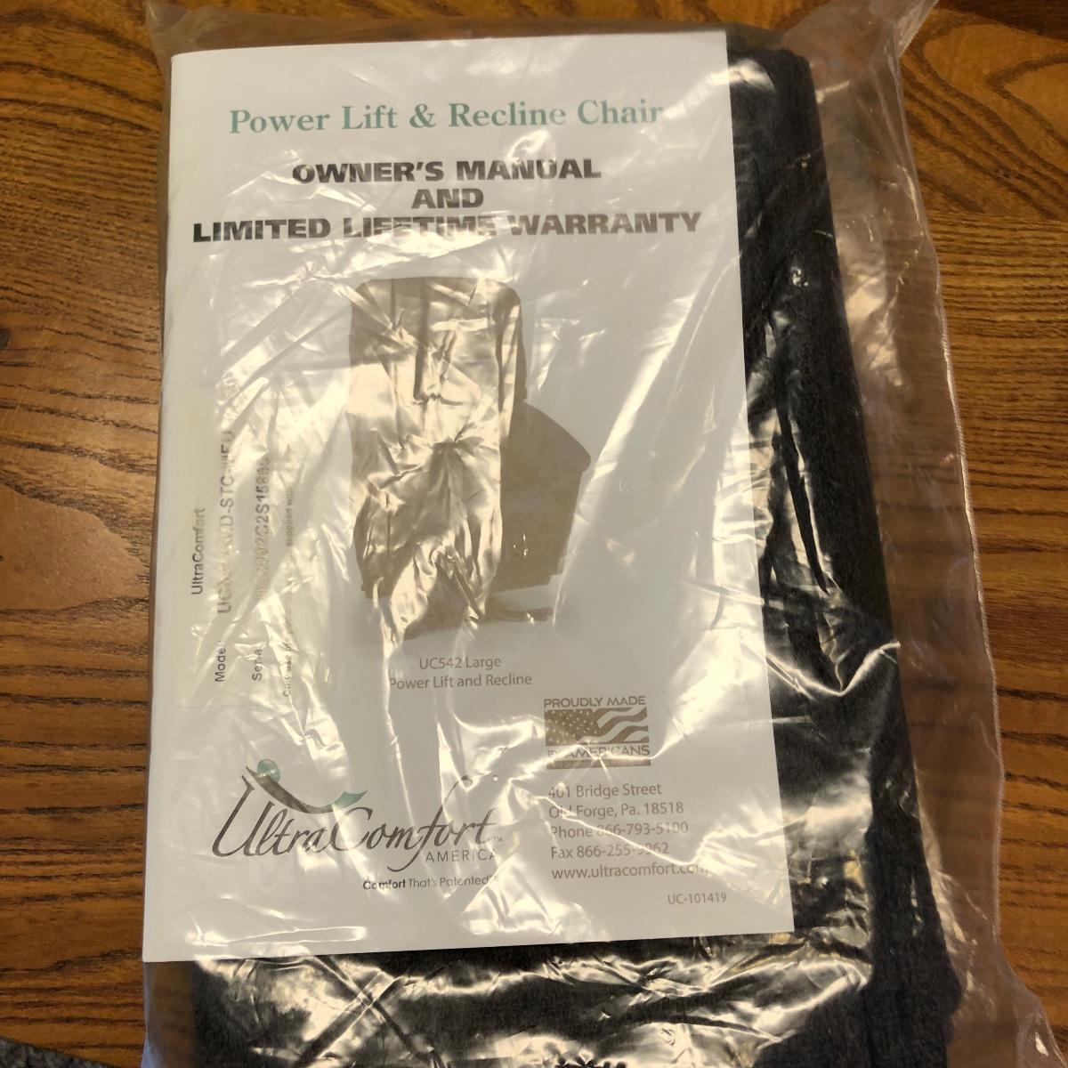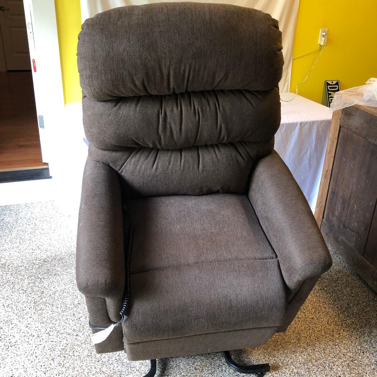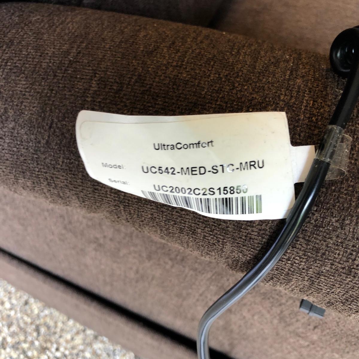Lot includes fabric Ultra Comfort Power lift and recline chair that worked when tested and appears to be almost new but has a few marks on fabric, see pictures. Chair measures 32” x 36” x 44”. Bring help item is substantial.