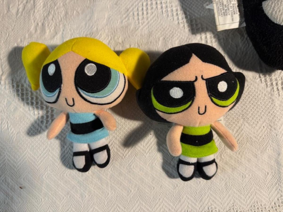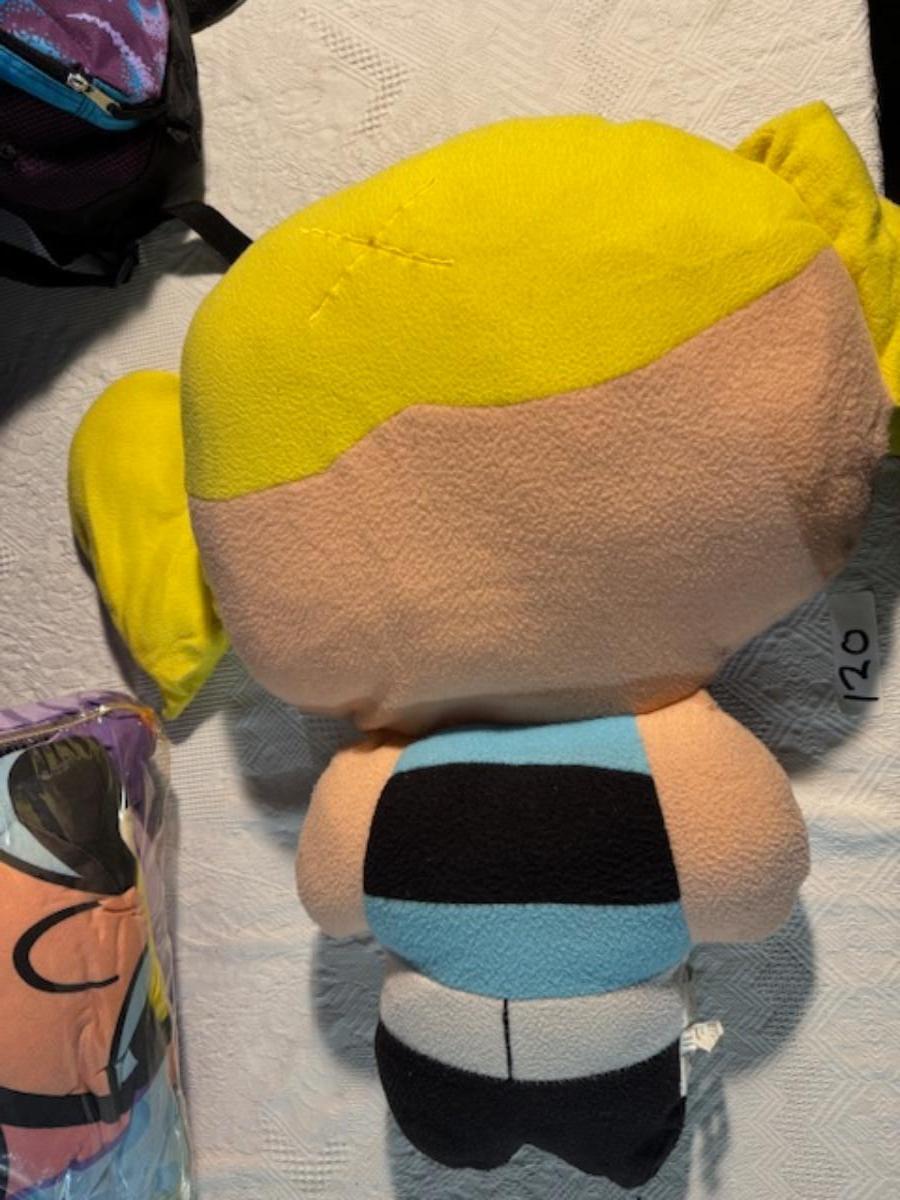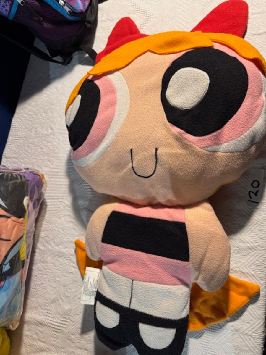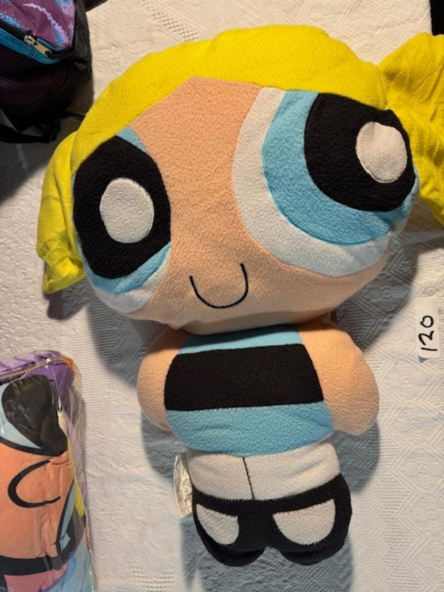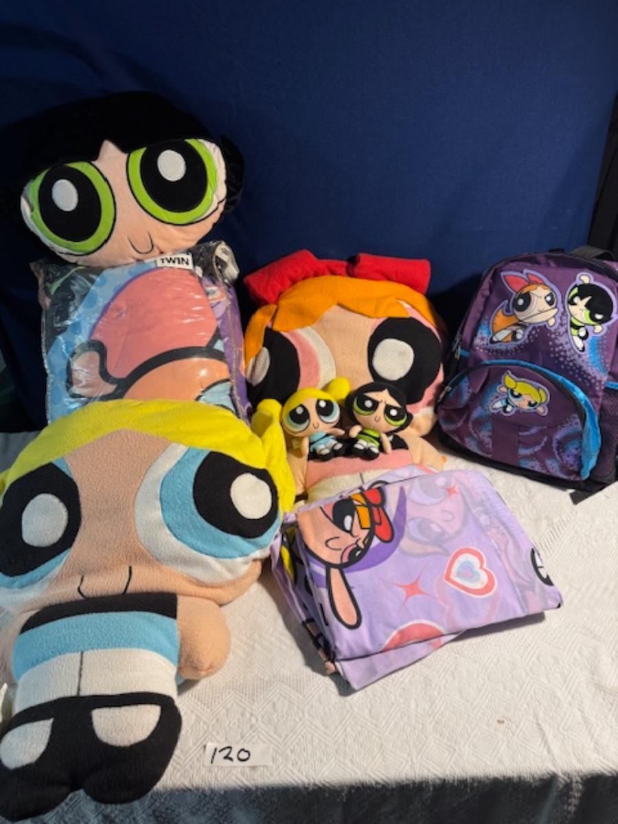 1. Power Puff Girls stuffed dolls approx. 36" tip to tip x 18". 2. approx. 32" ear to ear and 26" tip to tip. 3. head approx. 18" x 12". 4. 2x small 8" x 6.5". 5. Backpack approx. 18" x 14". 6. Twin blanket, twin sheet set.