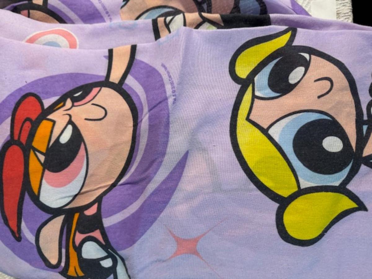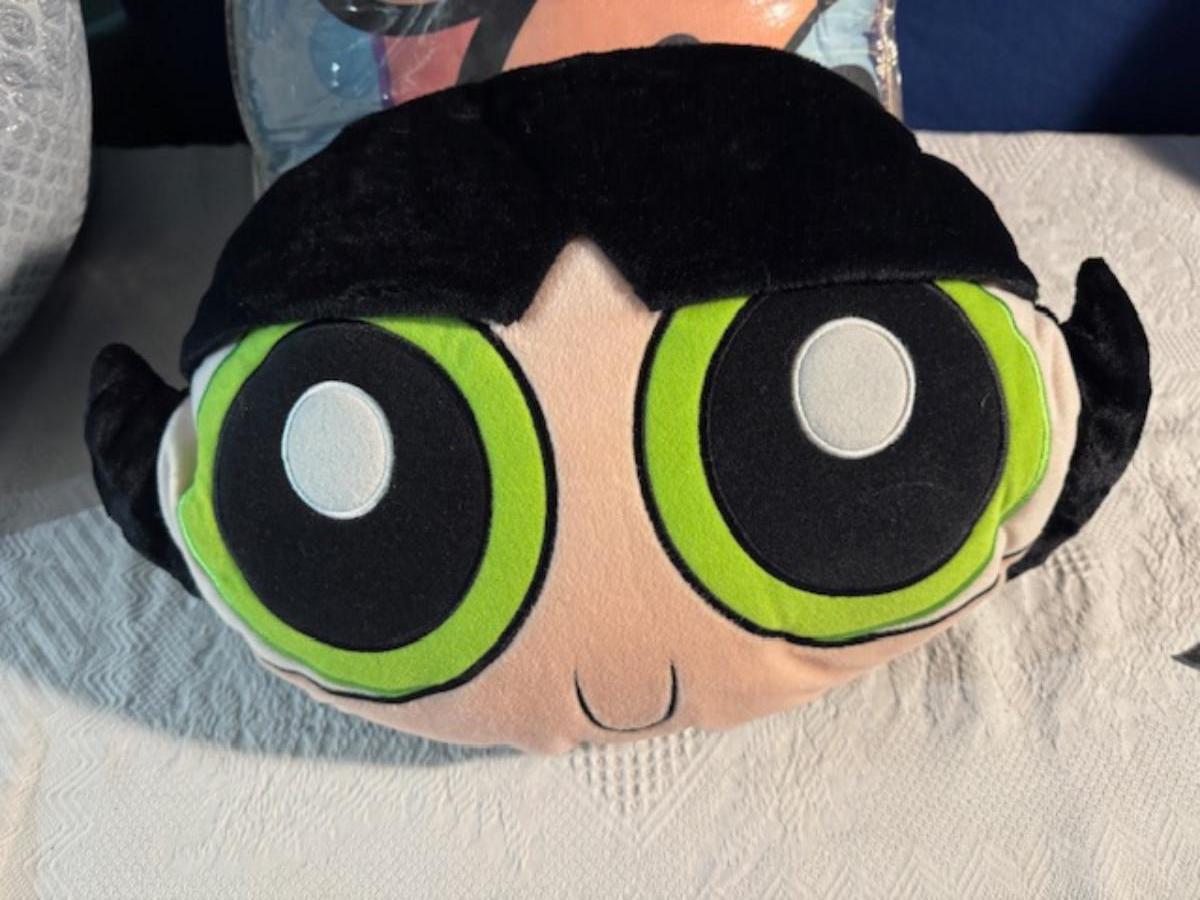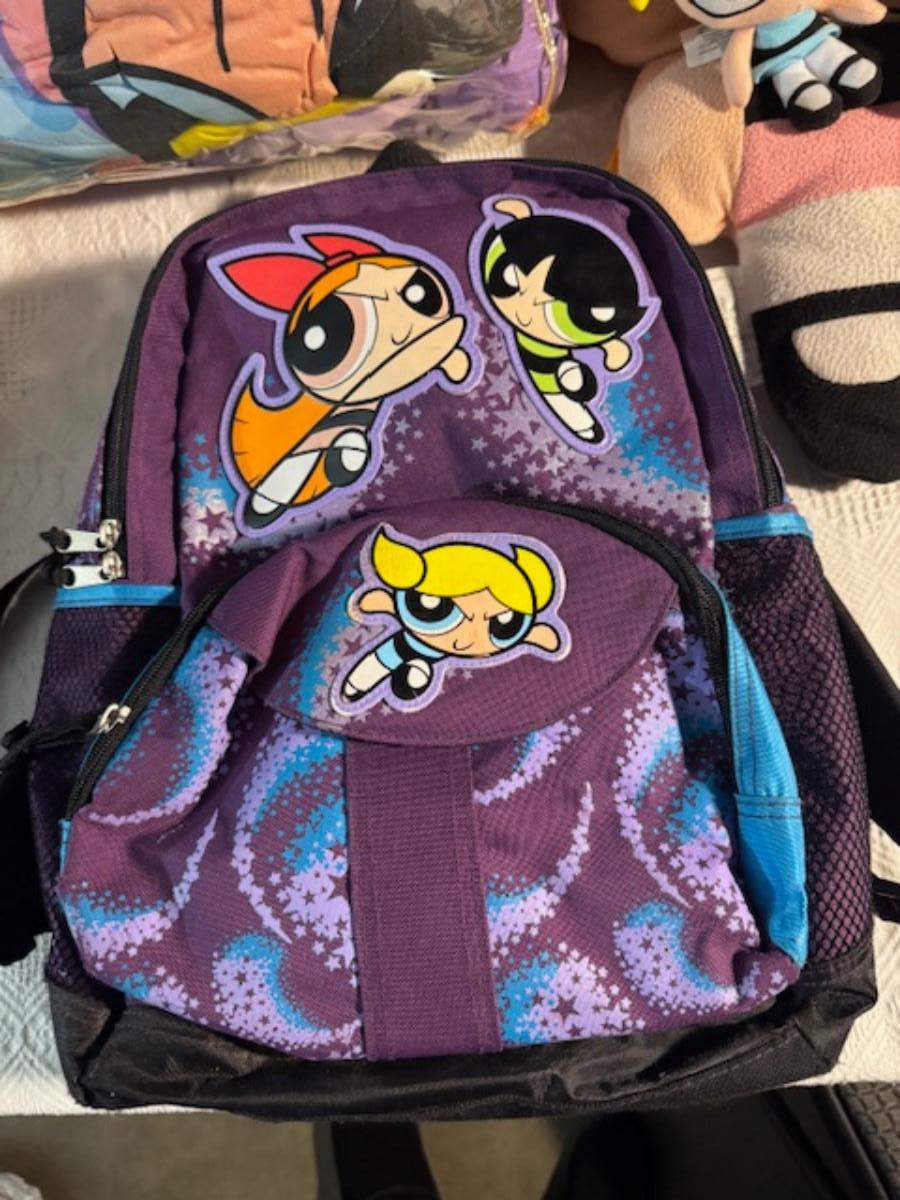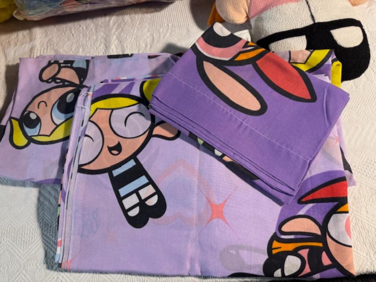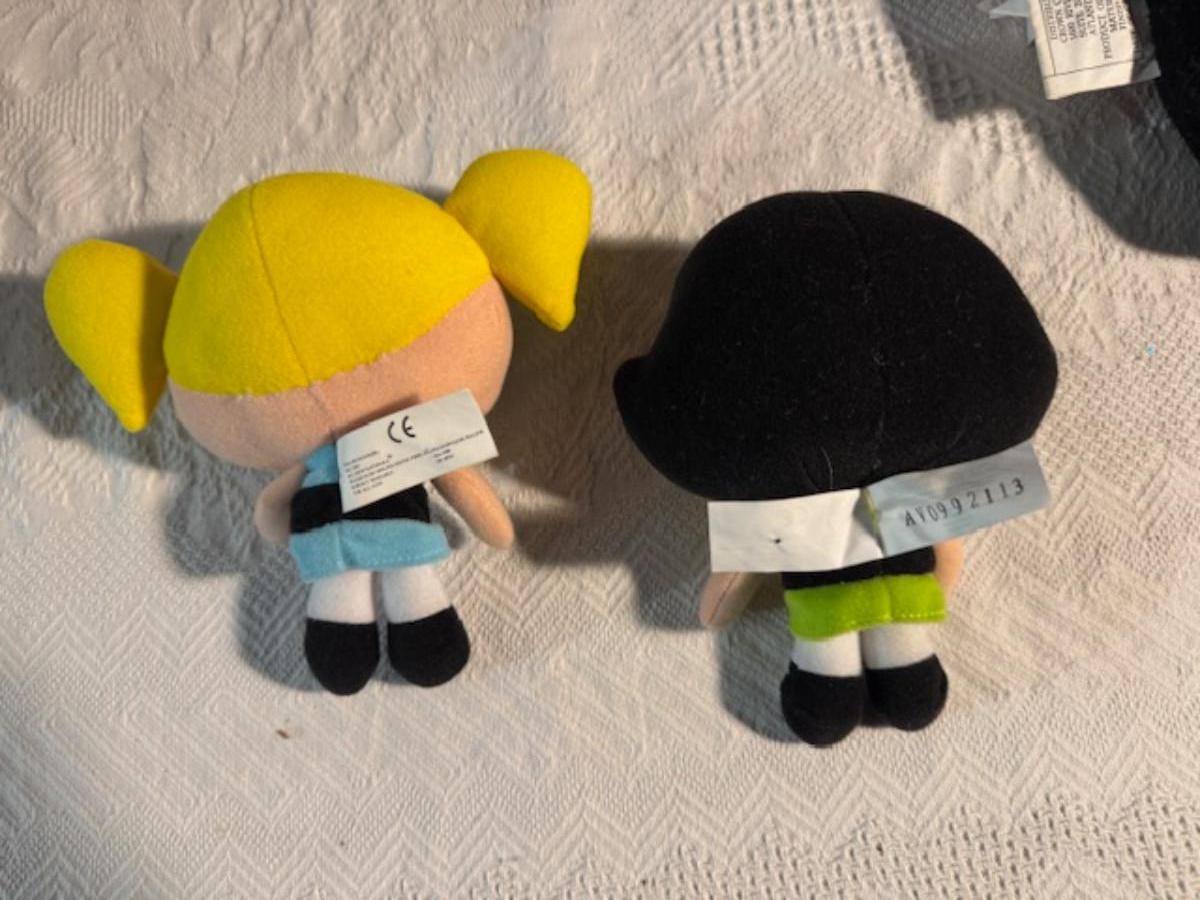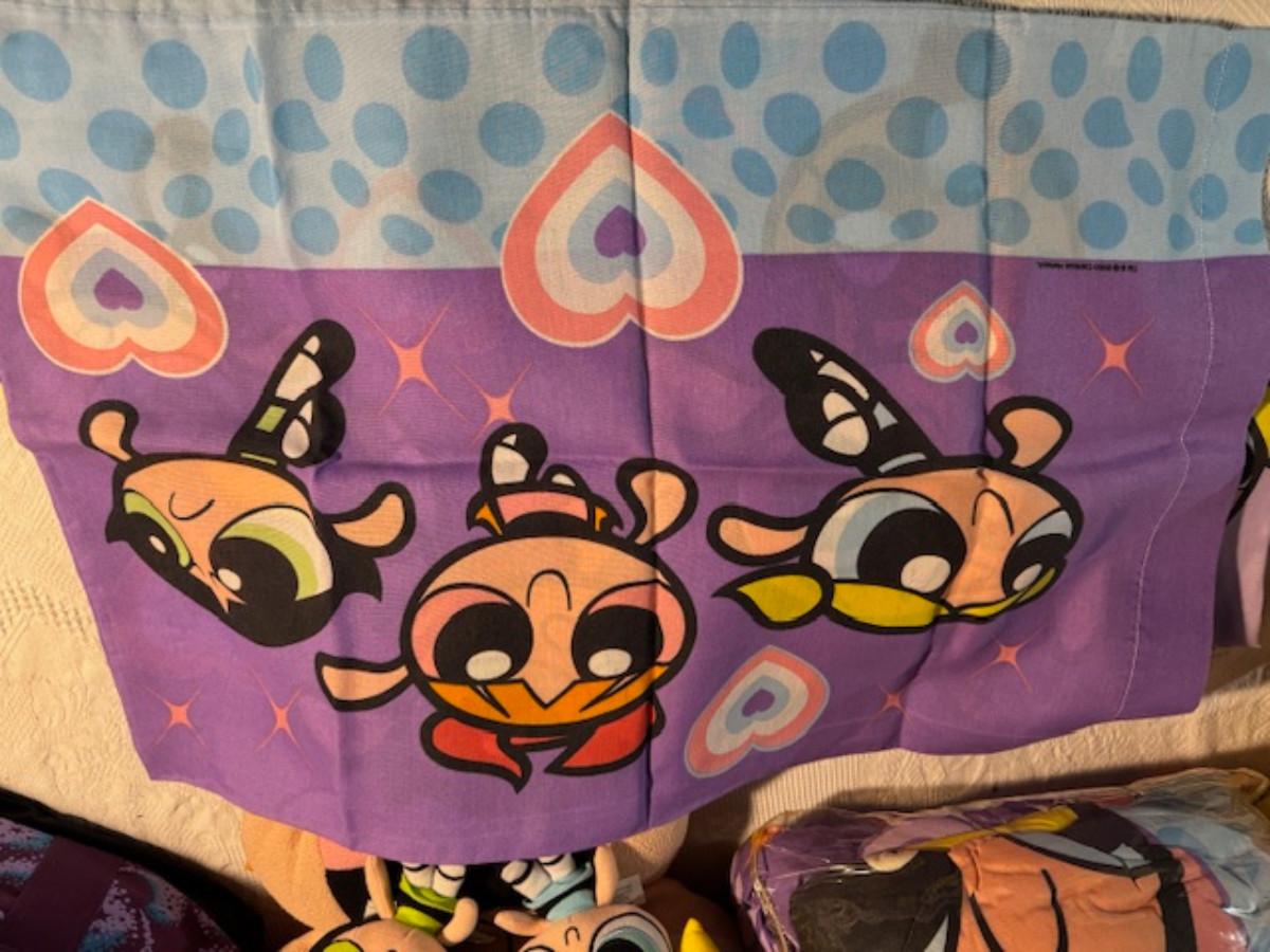 1. Power Puff Girls stuffed dolls approx. 36" tip to tip x 18". 2. approx. 32" ear to ear and 26" tip to tip. 3. head approx. 18" x 12". 4. 2x small 8" x 6.5". 5. Backpack approx. 18" x 14". 6. Twin blanket, twin sheet set.
