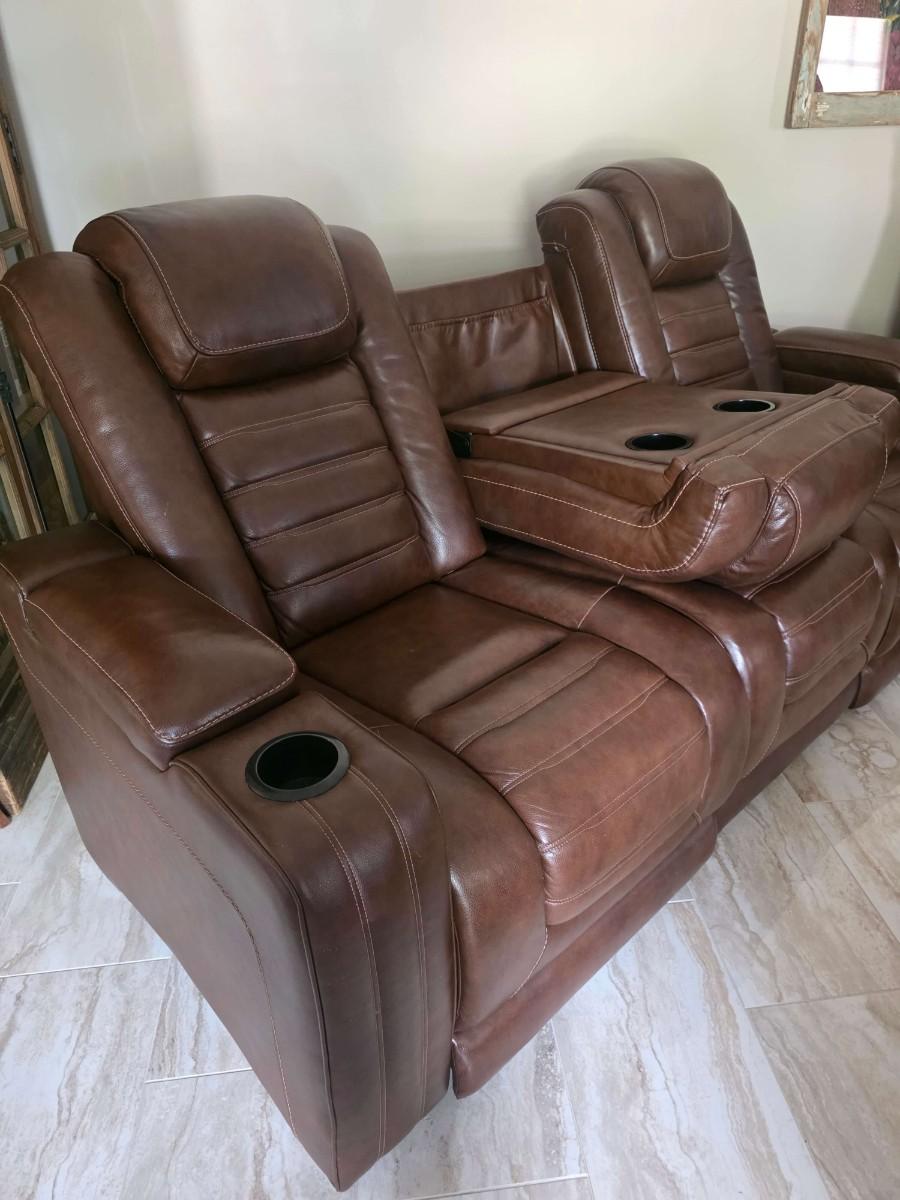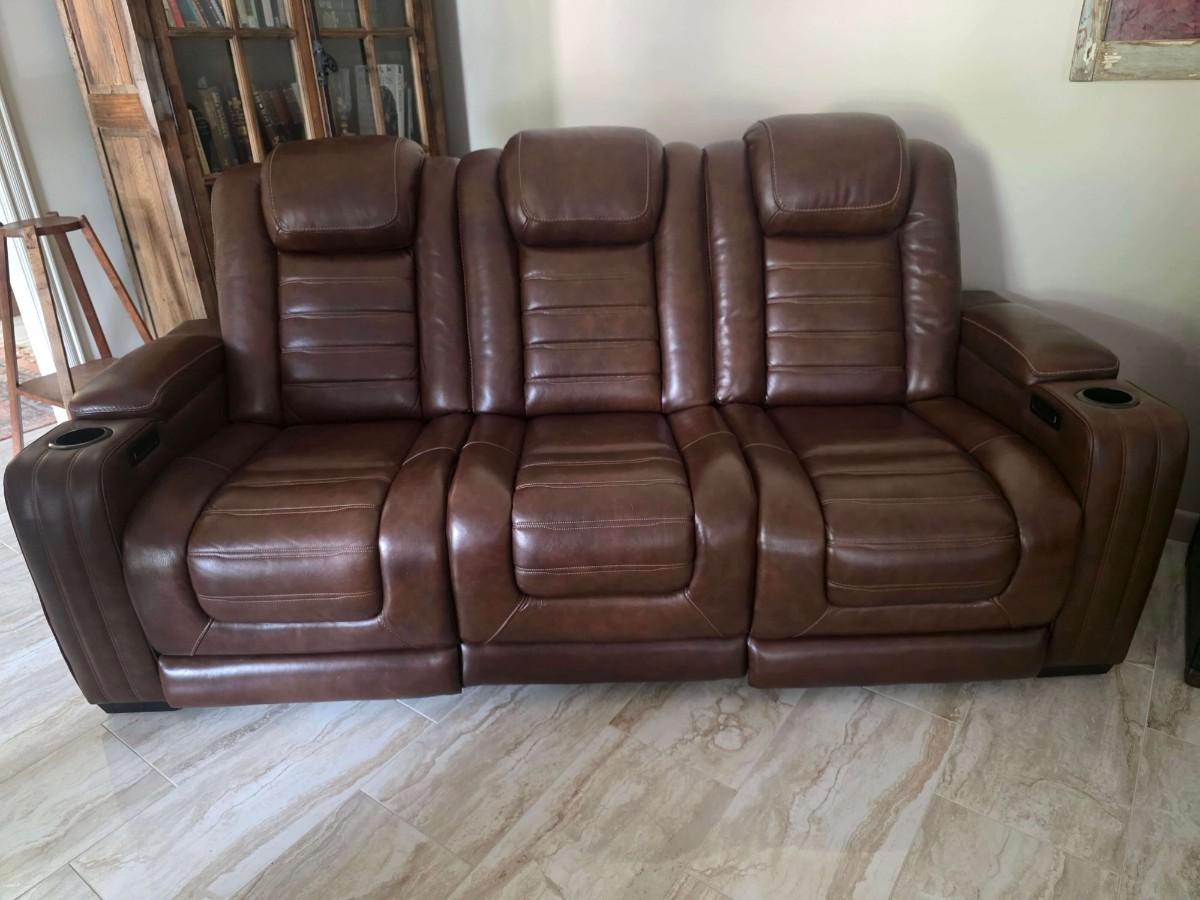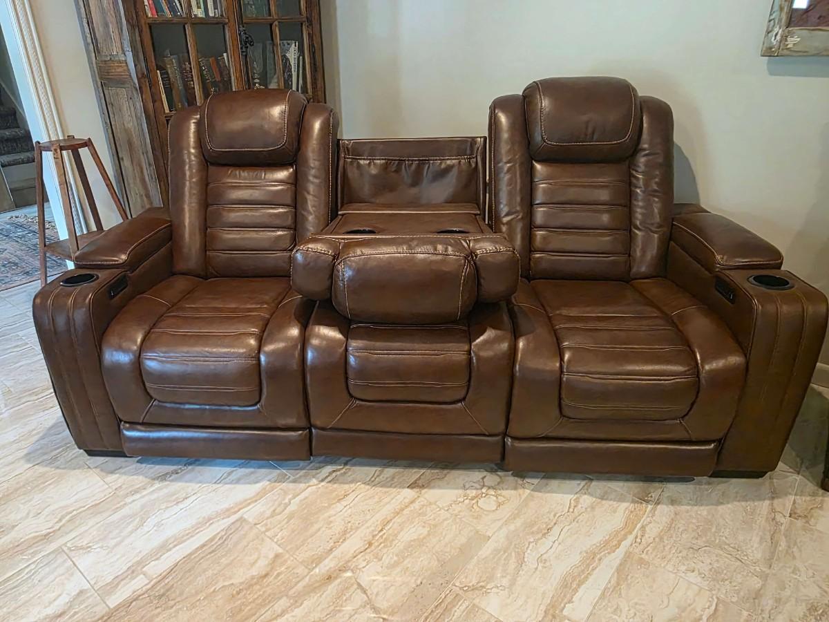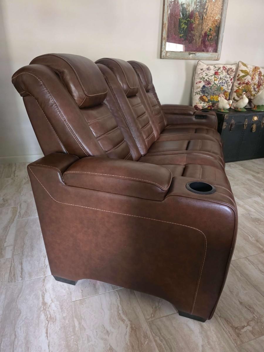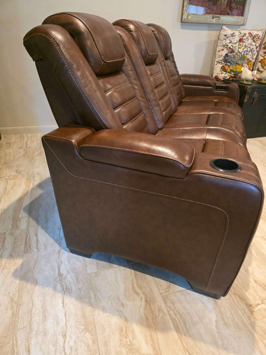 Ashley Backtrack Power Reclining Sofa features dual-sided recliners, one touch power control with adjustable positions, adjustable headrest and zero-draw USB plug-in, air massage system with 3 settings: steady, pulse, and wave with automatic 20 minute shutoff feature, heated seat element, zero-gravity extended ottoman to improve circulation, combination leather and faux leather upholstery, middle seat with flip-down table and 2 cup holders & hidden armrest storage.