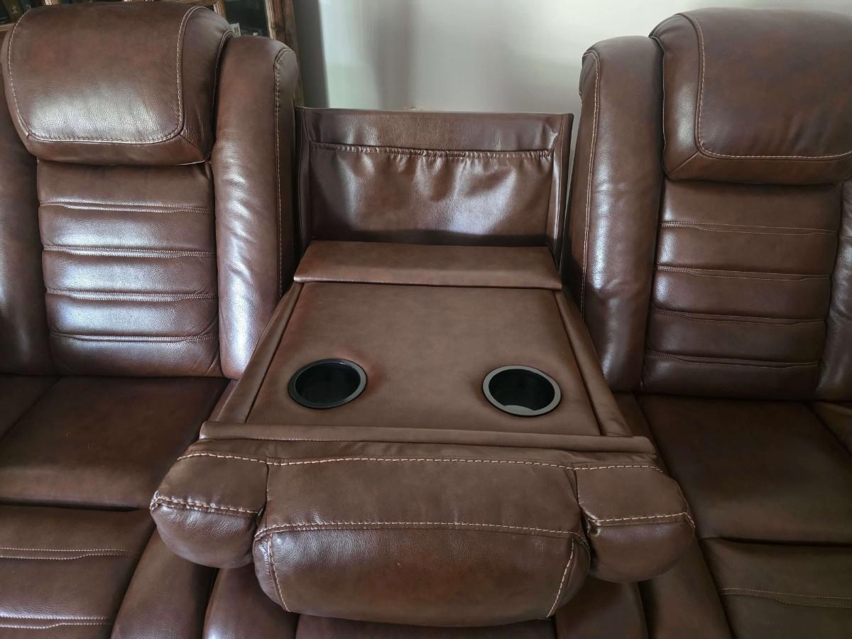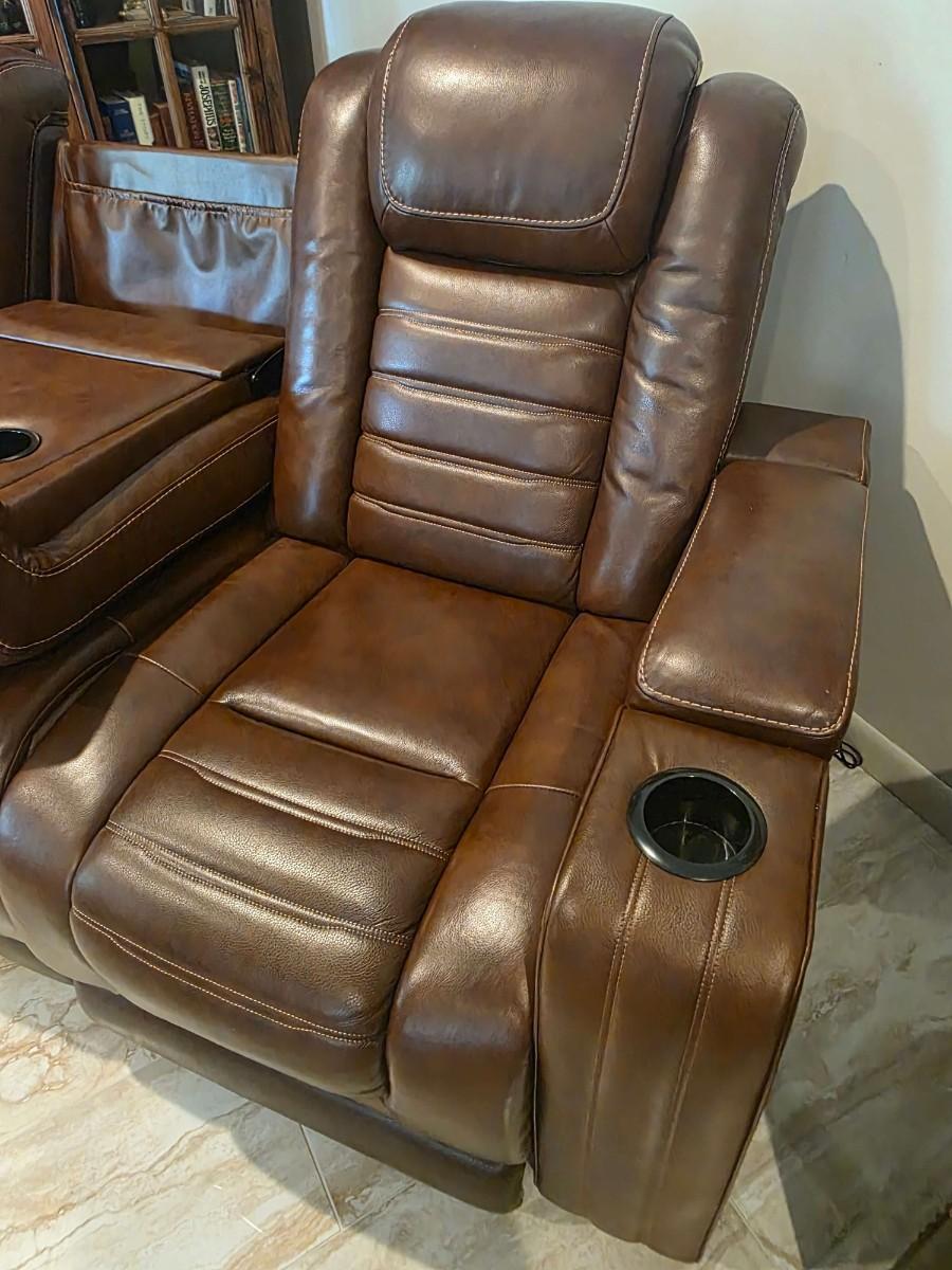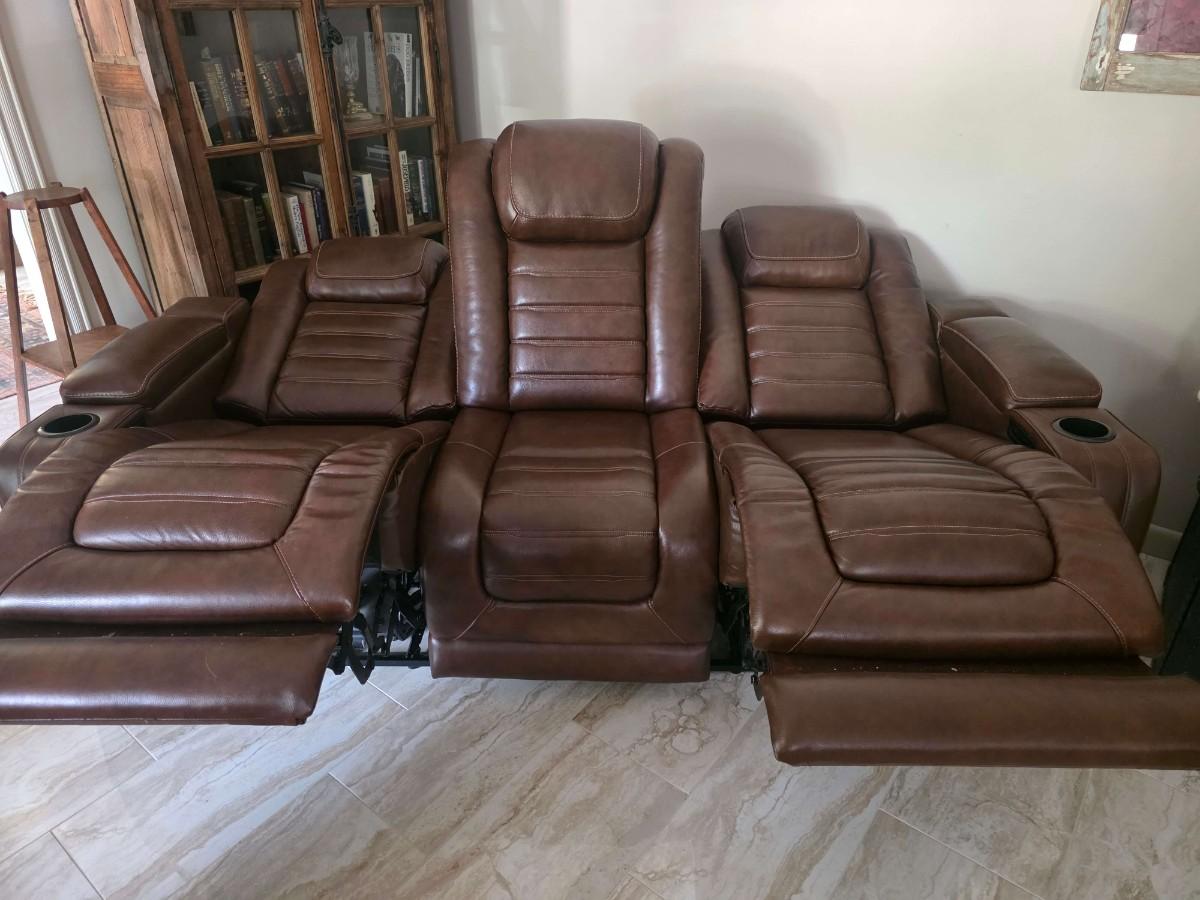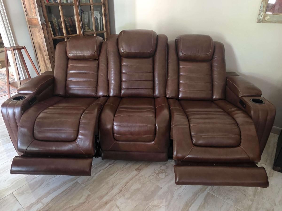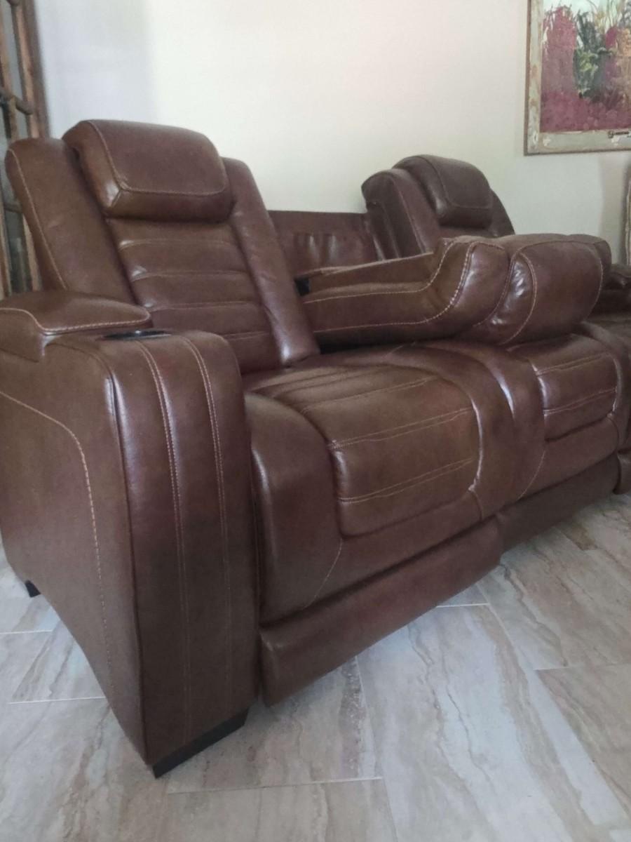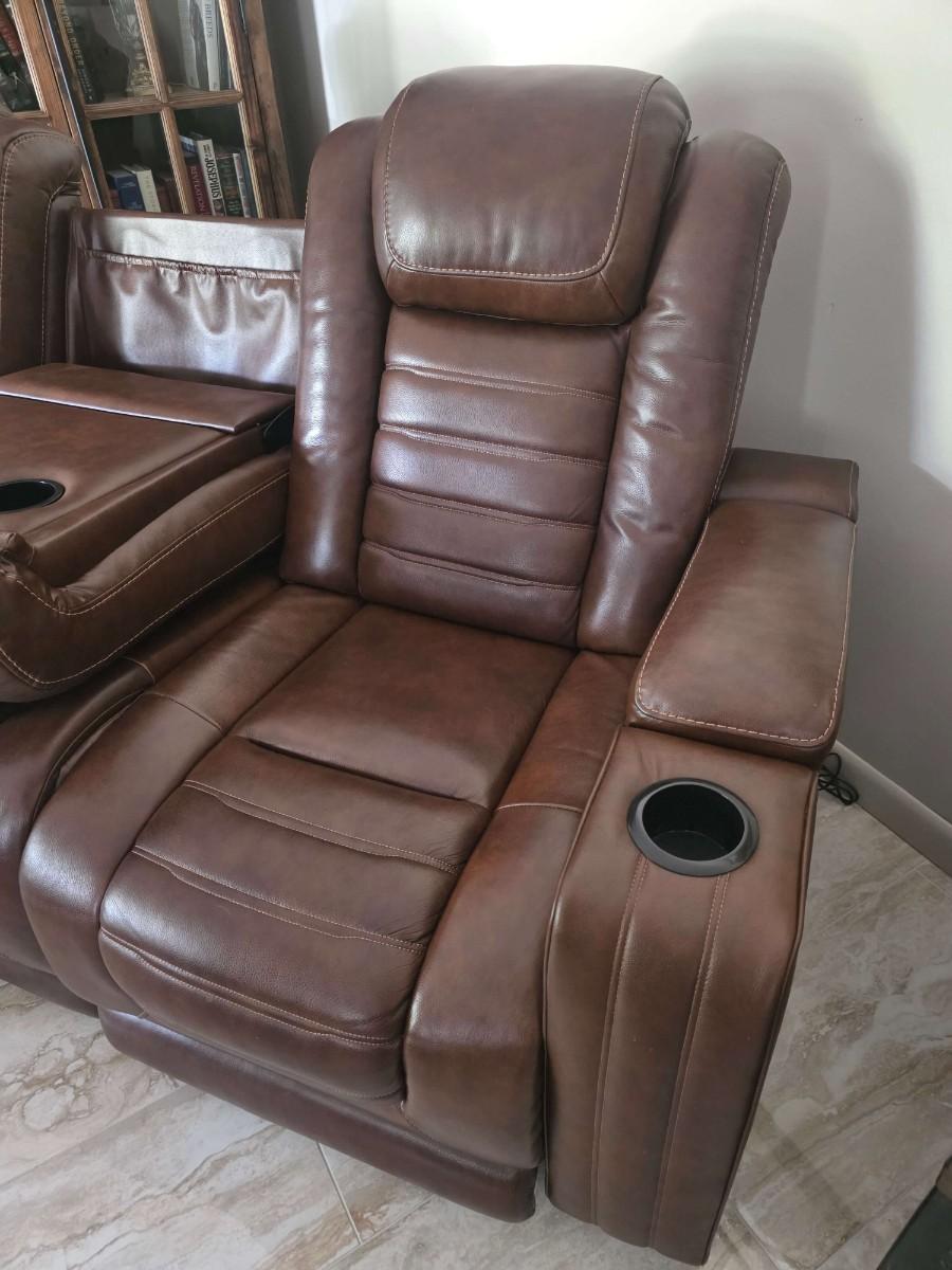 Ashley Backtrack Power Reclining Sofa features dual-sided recliners, one touch power control with adjustable positions, adjustable headrest and zero-draw USB plug-in, air massage system with 3 settings: steady, pulse, and wave with automatic 20 minute shutoff feature, heated seat element, zero-gravity extended ottoman to improve circulation, combination leather and faux leather upholstery, middle seat with flip-down table and 2 cup holders & hidden armrest storage.