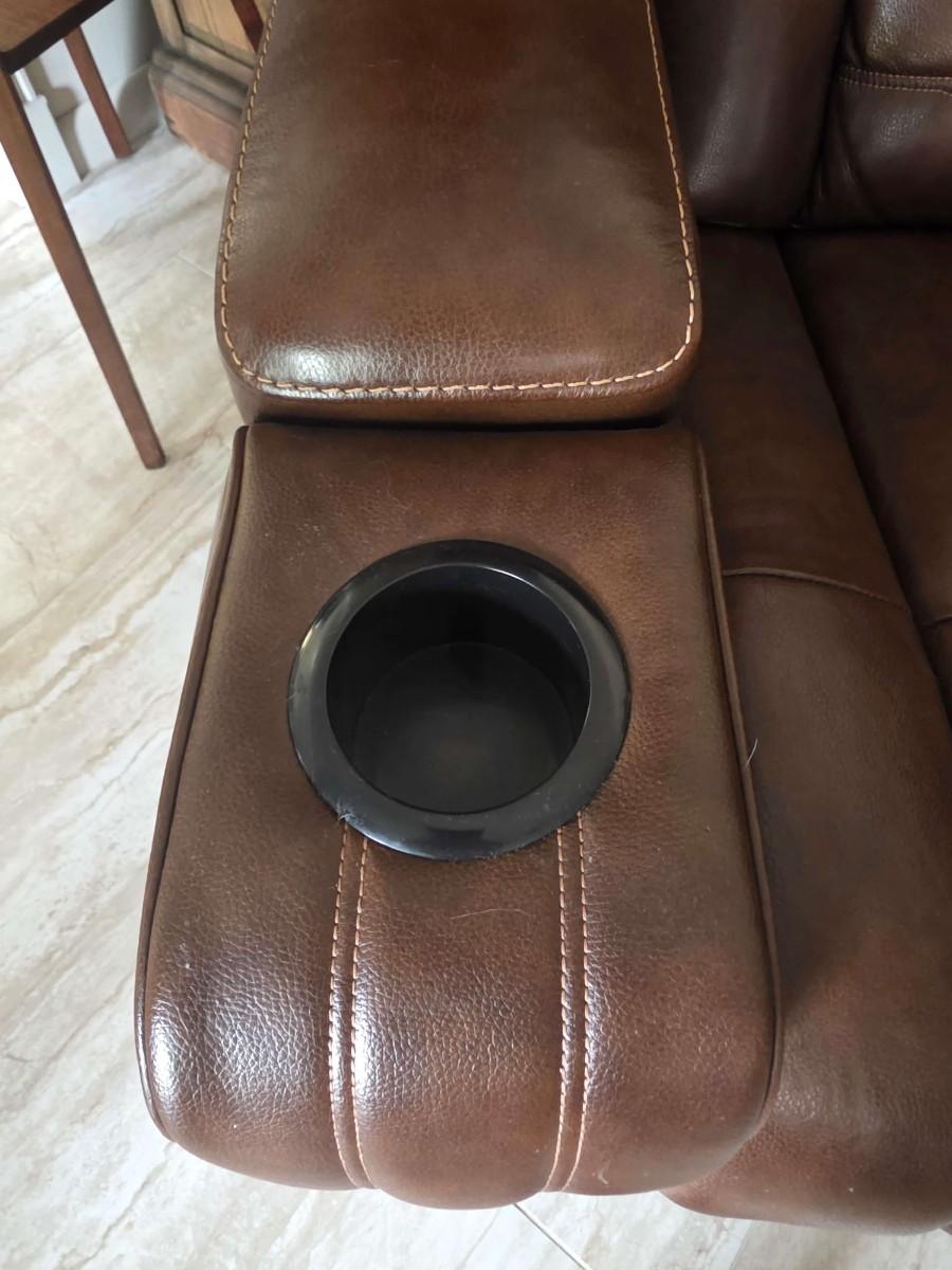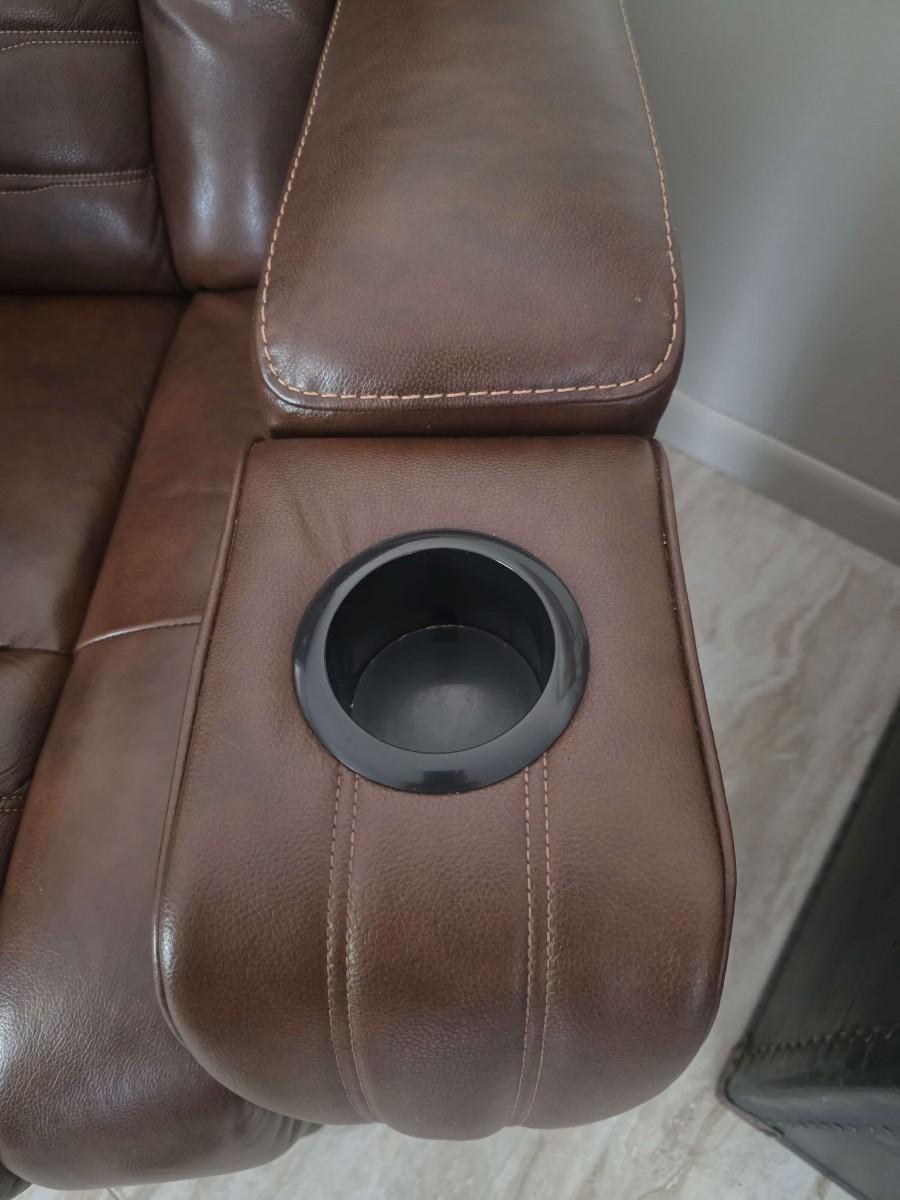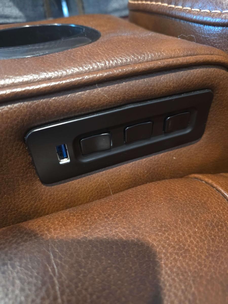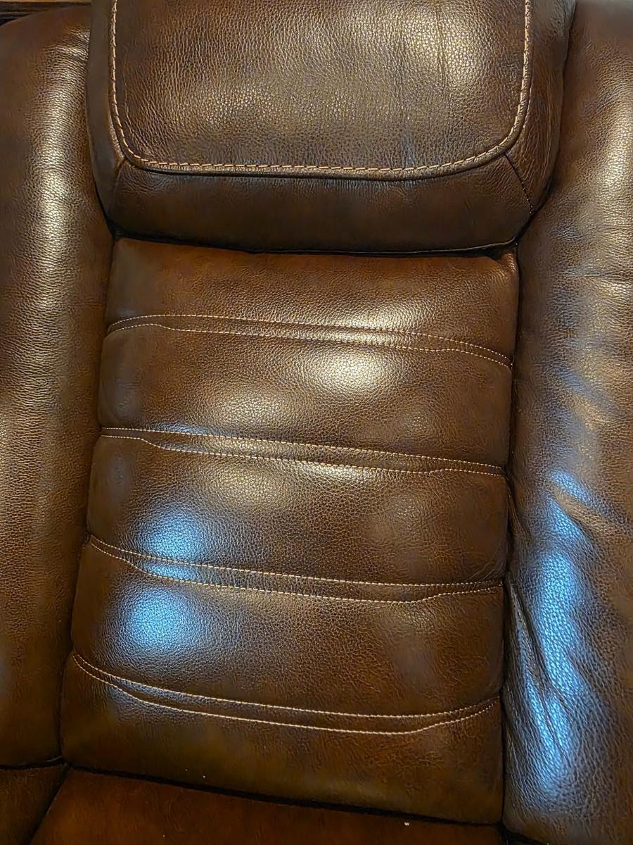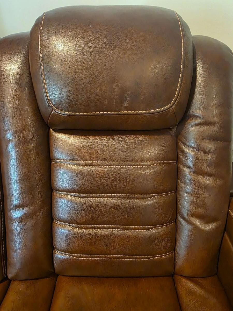 Ashley Backtrack Power Reclining Sofa features dual-sided recliners, one touch power control with adjustable positions, adjustable headrest and zero-draw USB plug-in, air massage system with 3 settings: steady, pulse, and wave with automatic 20 minute shutoff feature, heated seat element, zero-gravity extended ottoman to improve circulation, combination leather and faux leather upholstery, middle seat with flip-down table and 2 cup holders & hidden armrest storage.