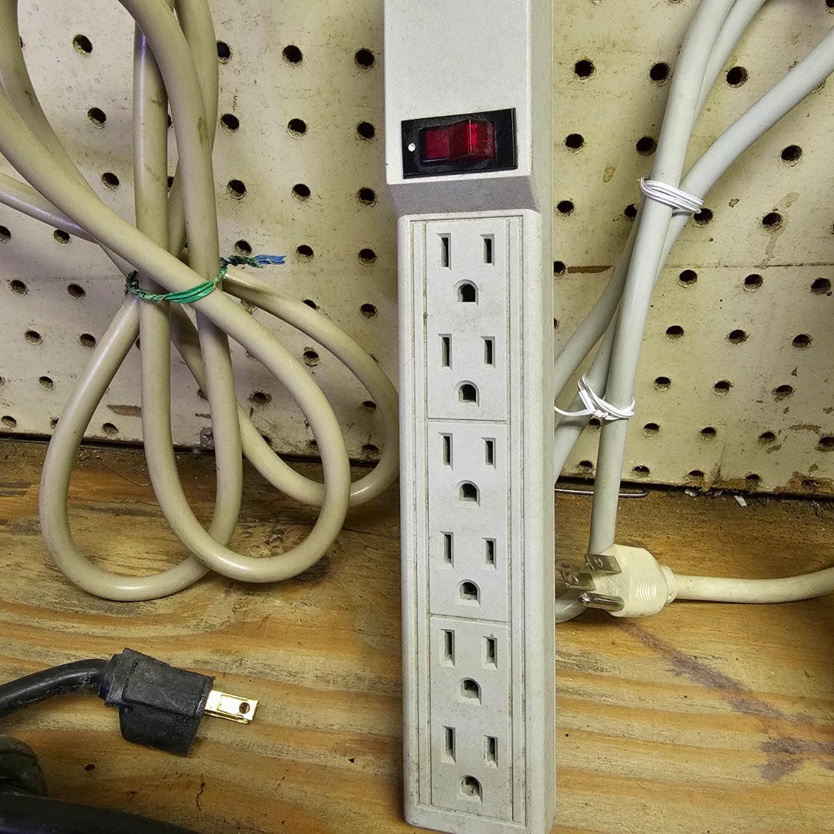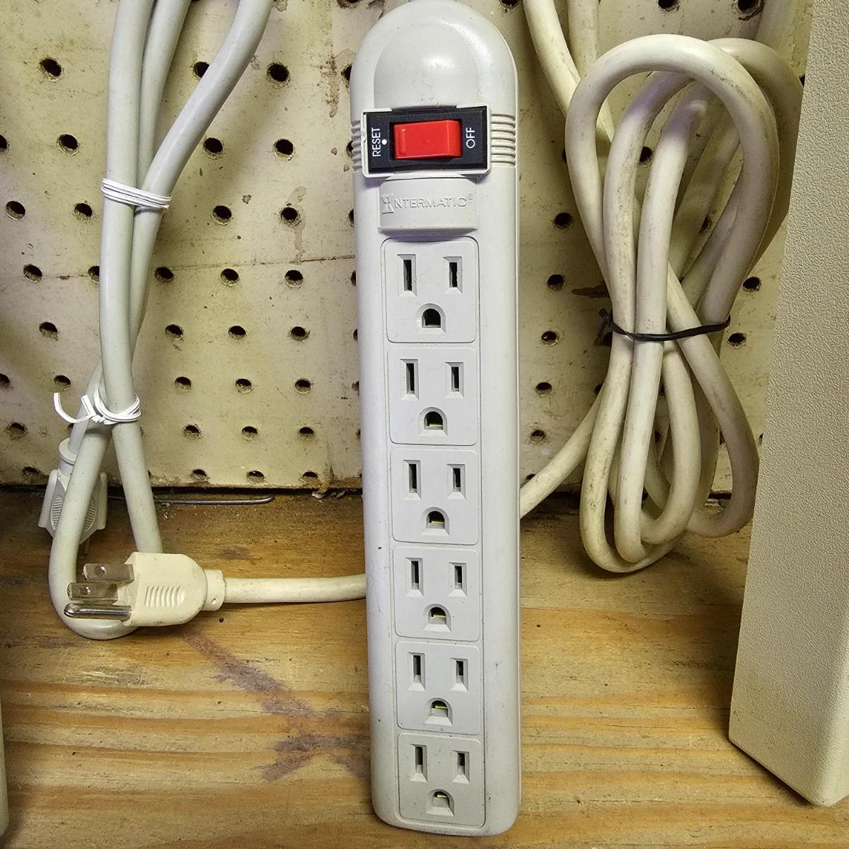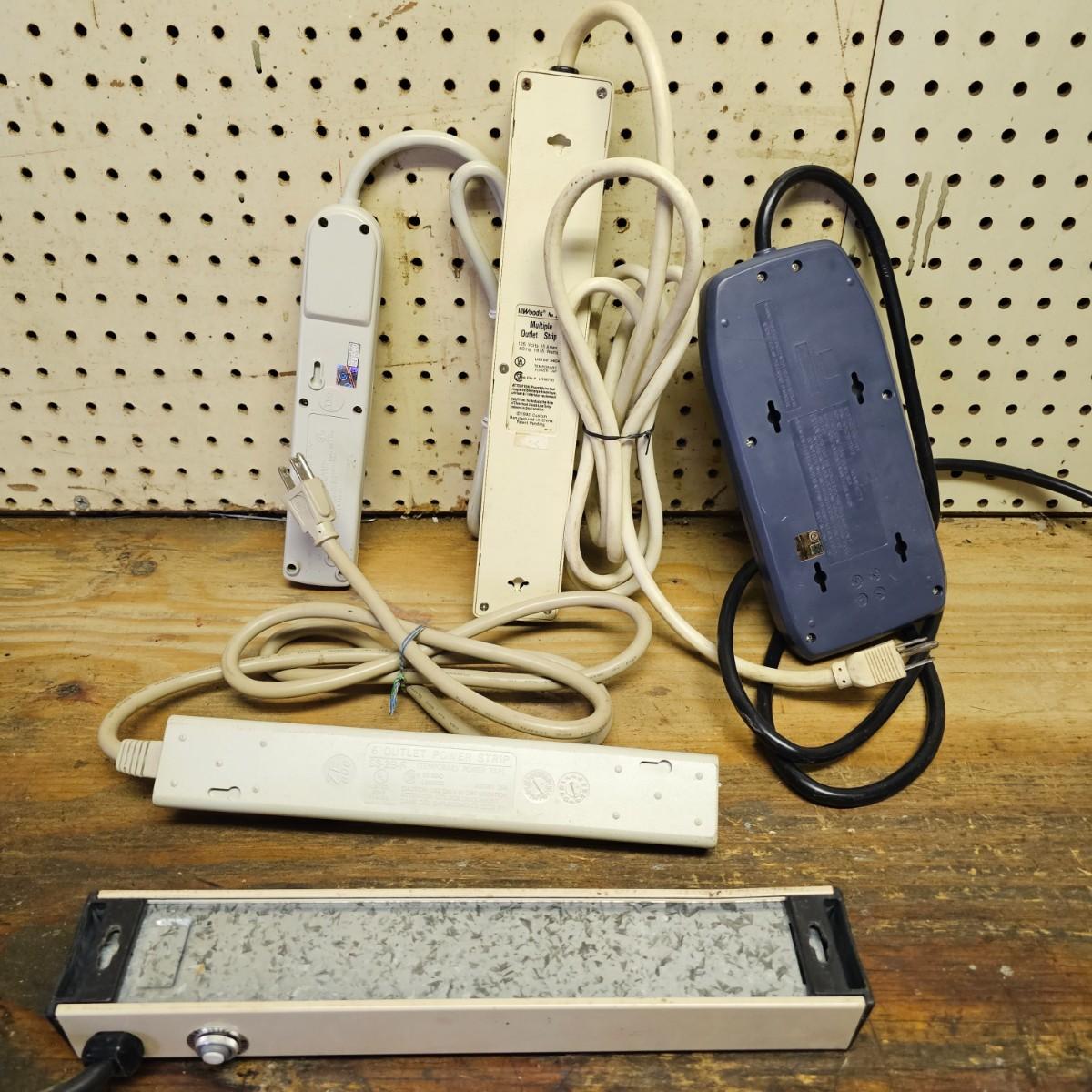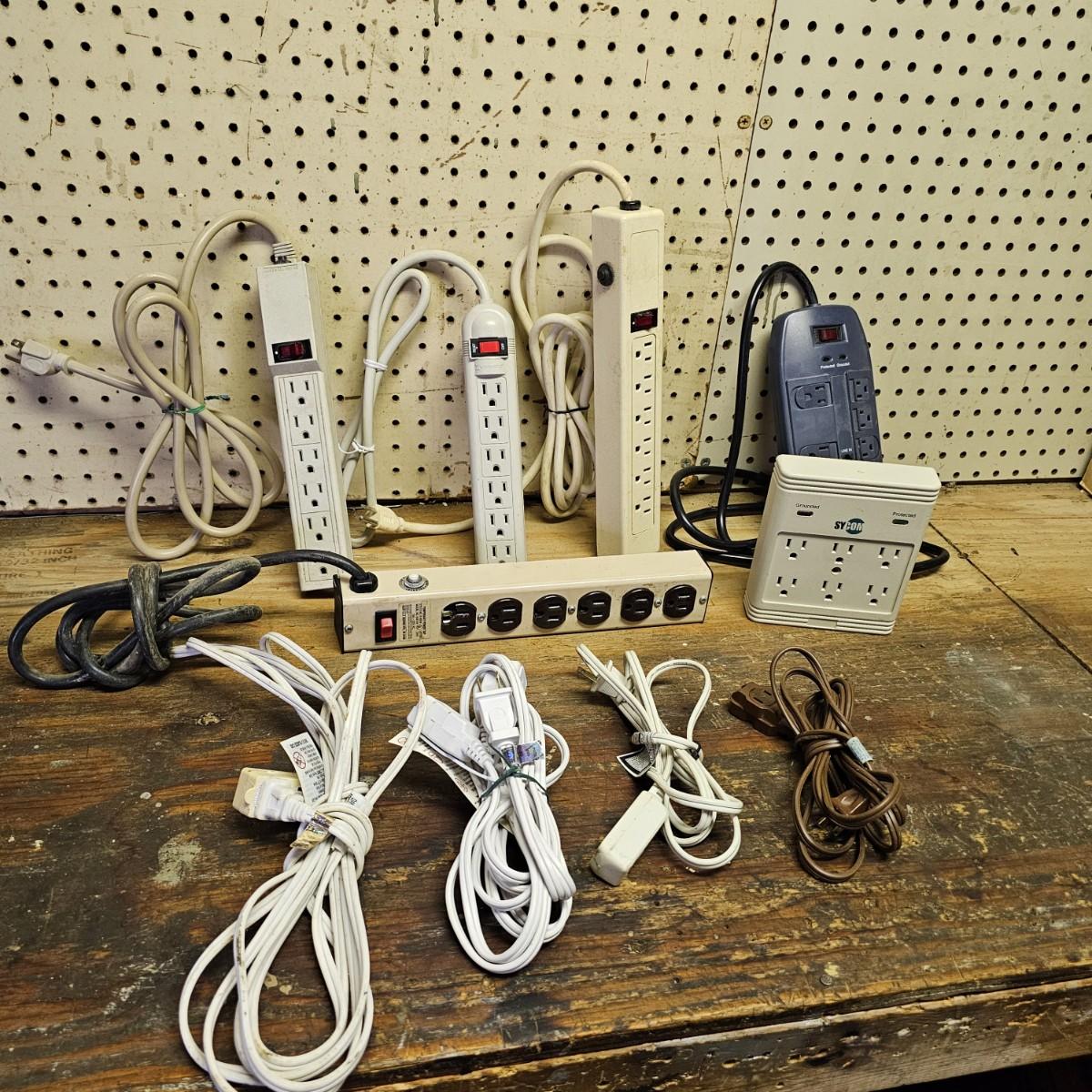 Five power strips, one wall outlet multiplier, and four extension cords. Power strips have six to eight outlets. All powered on when plugged in. One item has a cracked outlet, see photos for details. Shipping available.