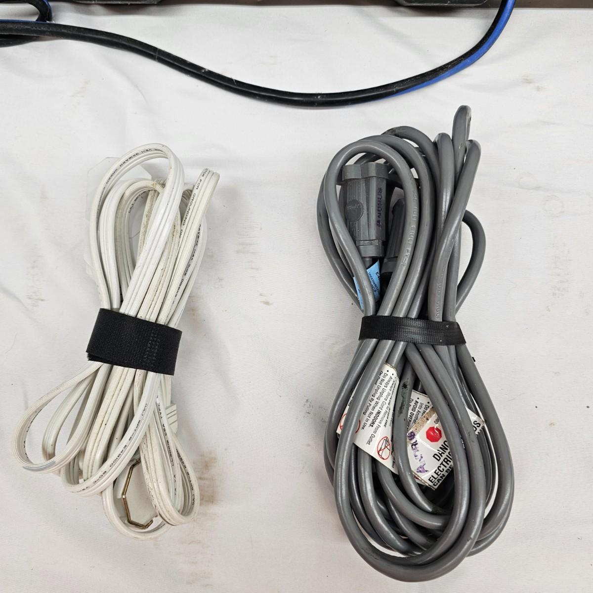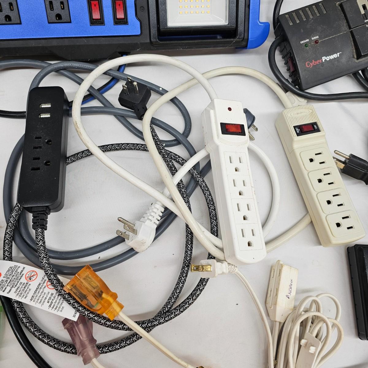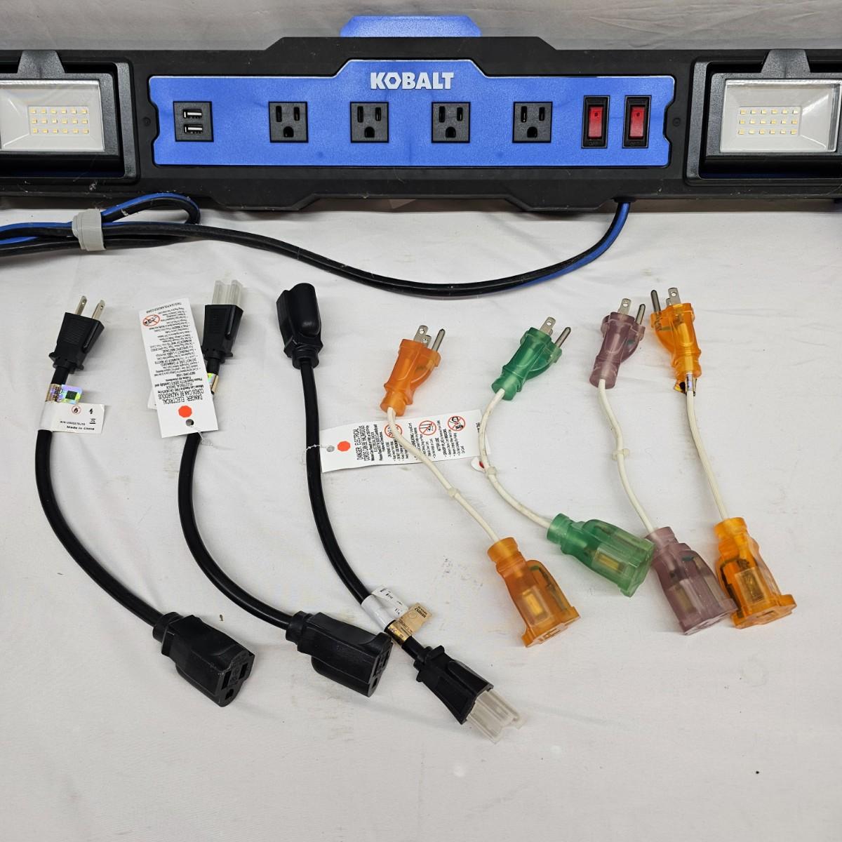Eleven different sizes and styles of power strips, some with short two-foot cords and others with six-foot cords. Large Kobalt item measures 28" x 2.5" x 5"H, has tiltable LED lights in each end plus USB charging. Other items are shorter extension pieces, items with flat plugs and others. None were tested. See photos for details. Local pickup only.
