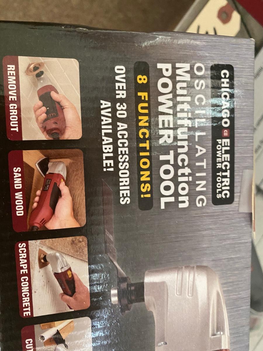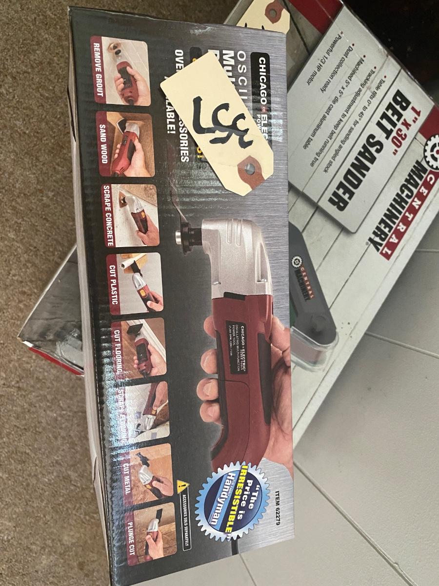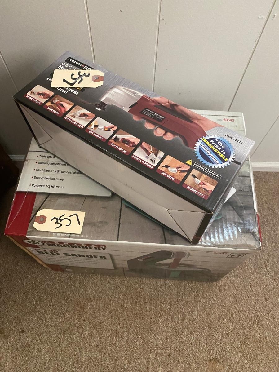 Central machinery belt sander new in box, Chicago electric oscillatinf multifunction power tool new in box, vintage cash box, carftsman bit set