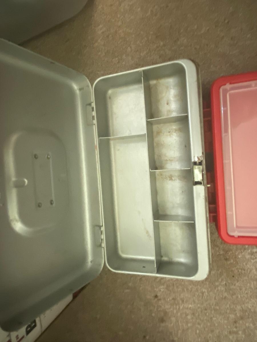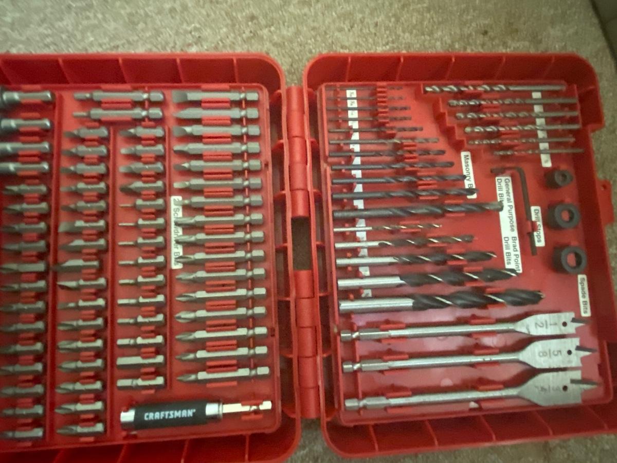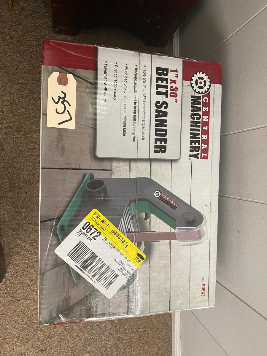 Central machinery belt sander new in box, Chicago electric oscillatinf multifunction power tool new in box, vintage cash box, carftsman bit set