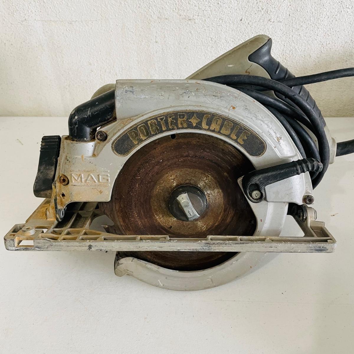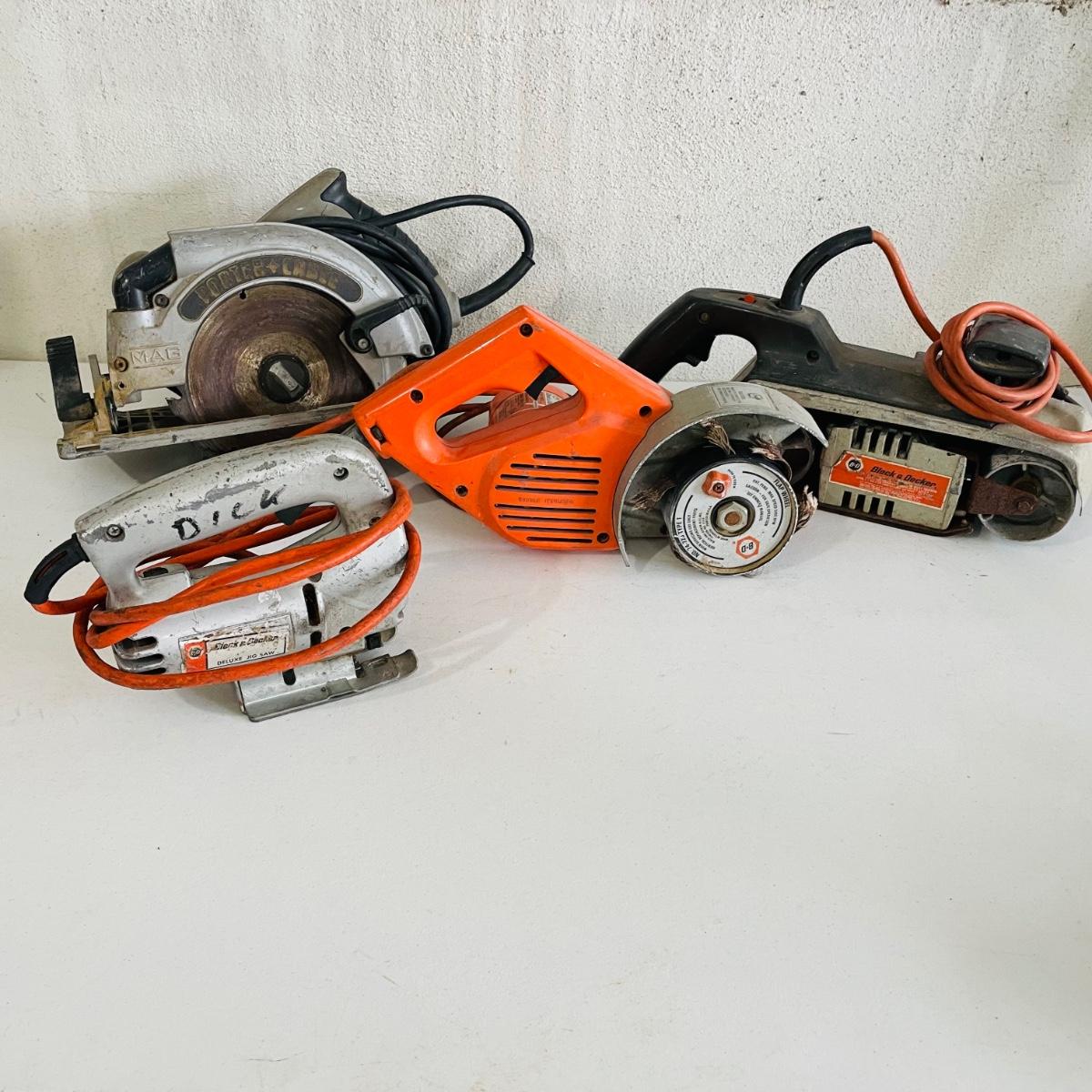 Lot includes an assortment of power tools all in good working condition. A Porter Cable Circular Saw 7 1/4” heavy duty 120v. Circular saw model #423MAG. A Black & Decker deluxe jig saw, a Black & Decker belt sander & a Black & Decker work wheel.