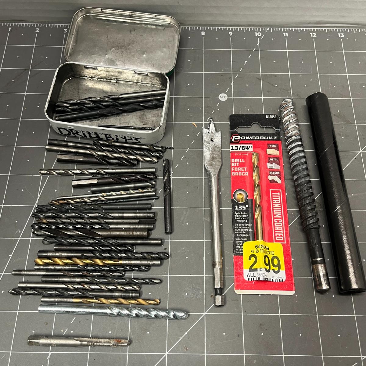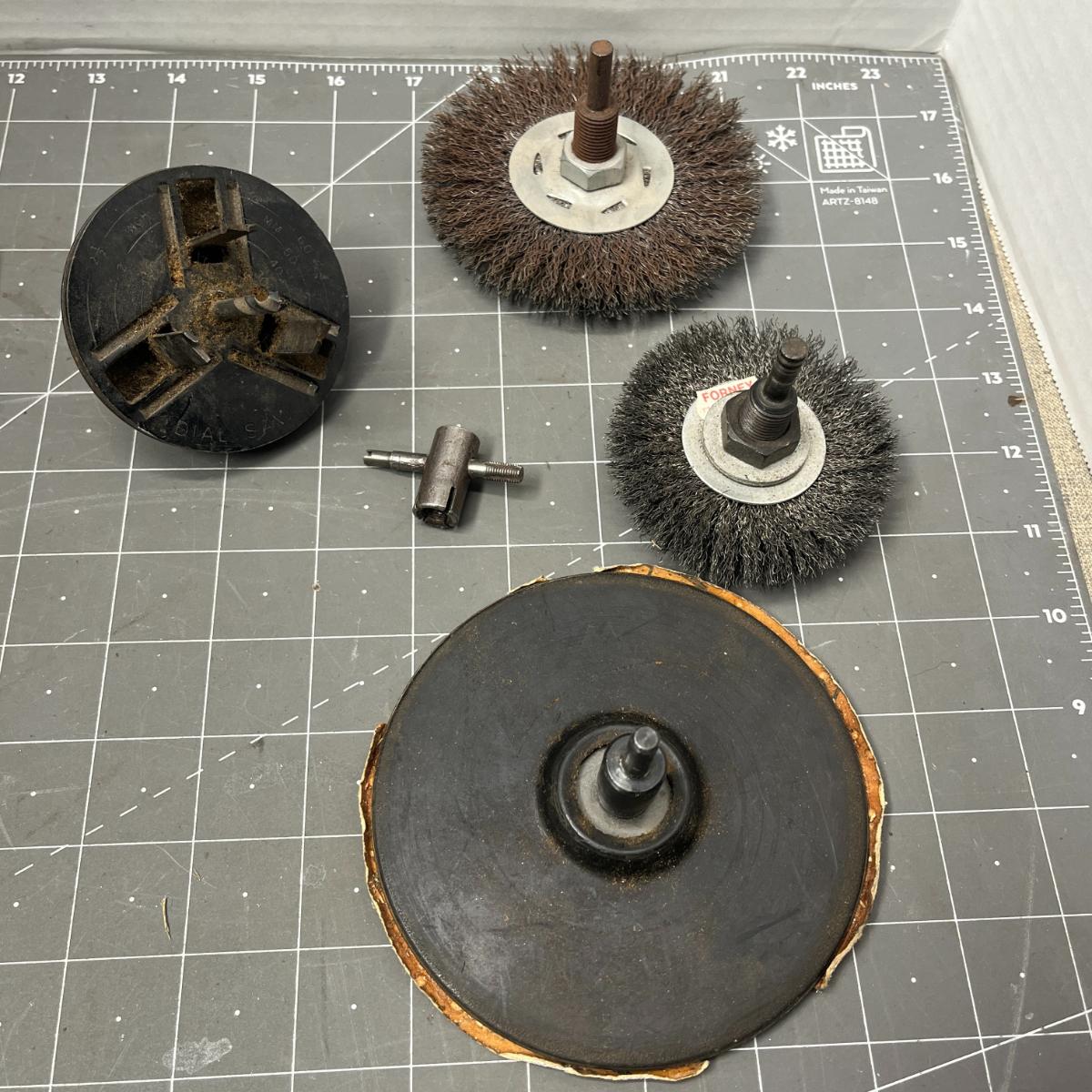 Assorted drill bits and wire wheels for metal, wood, and DIY projects.