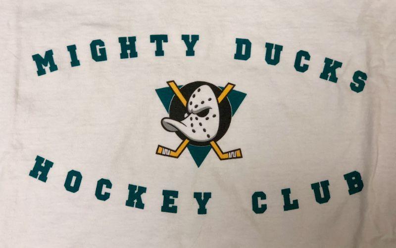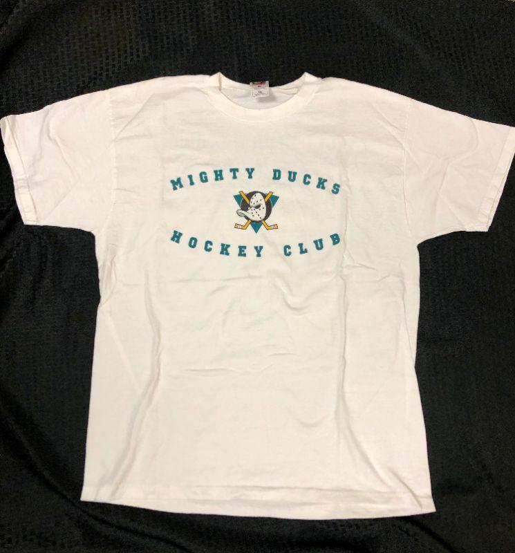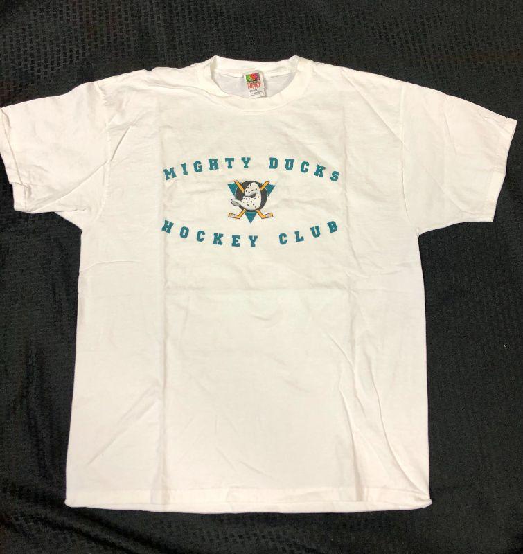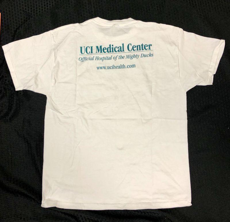 Pair of vintage Mighty Ducks Hockey Club & UCI Medical Center promo t-shirts. The Anaheim Ducks were first called the Mighty Ducks until around 2005 when Disney sold the team. Shirts are unworn, size XL.