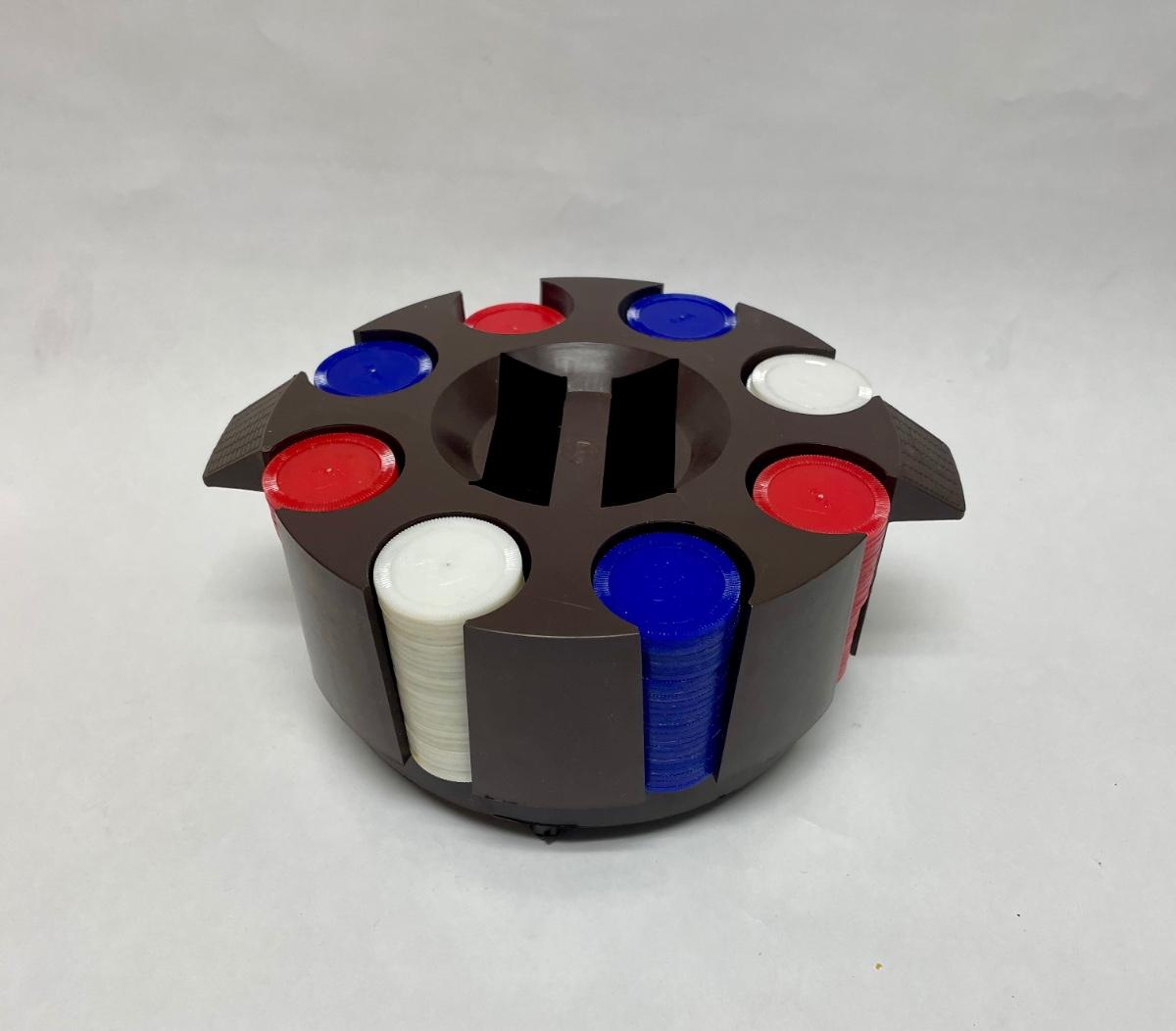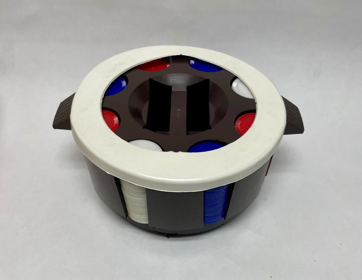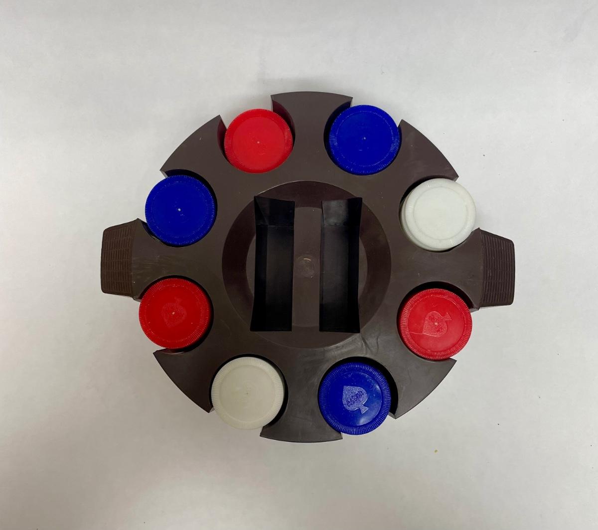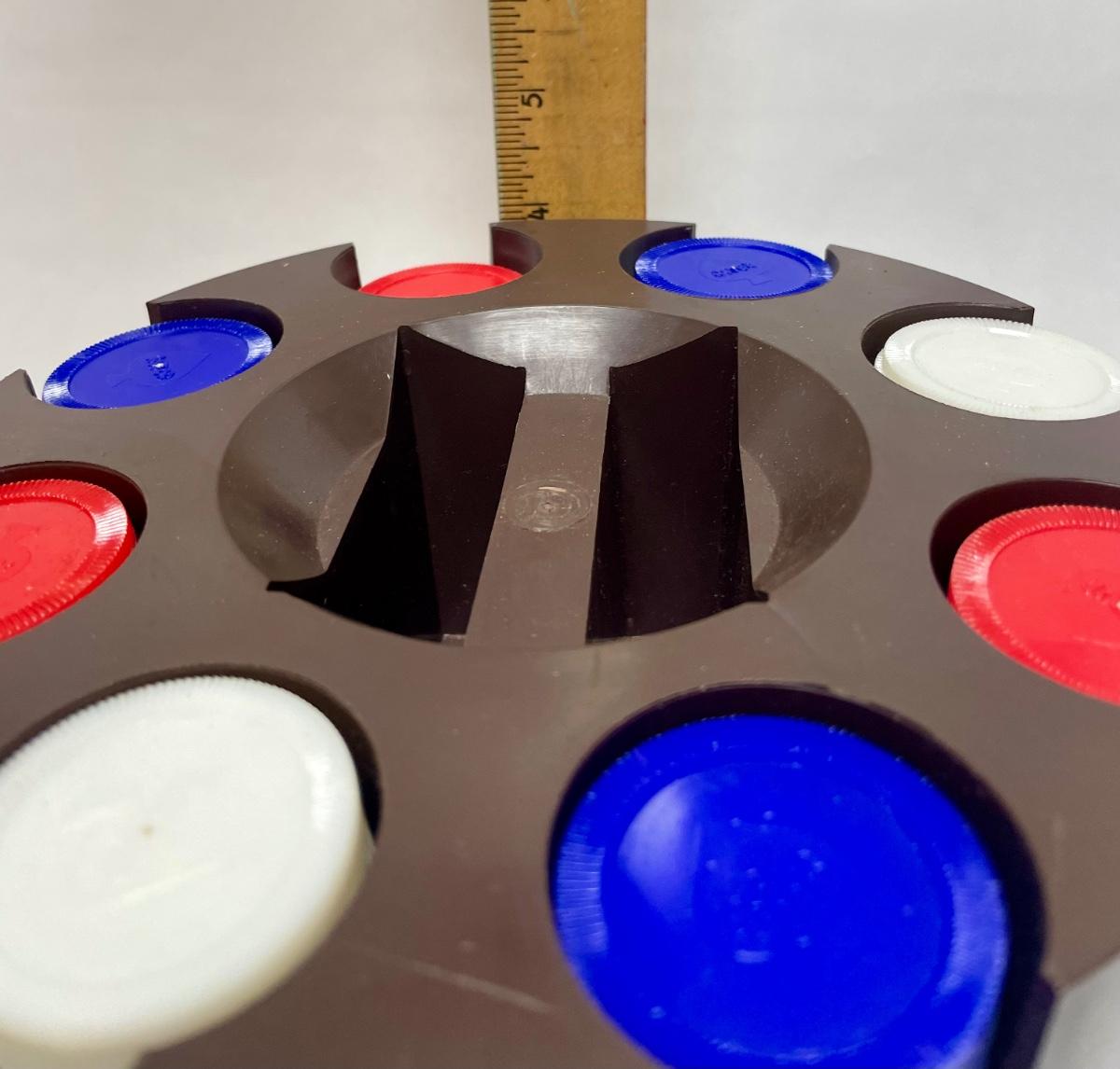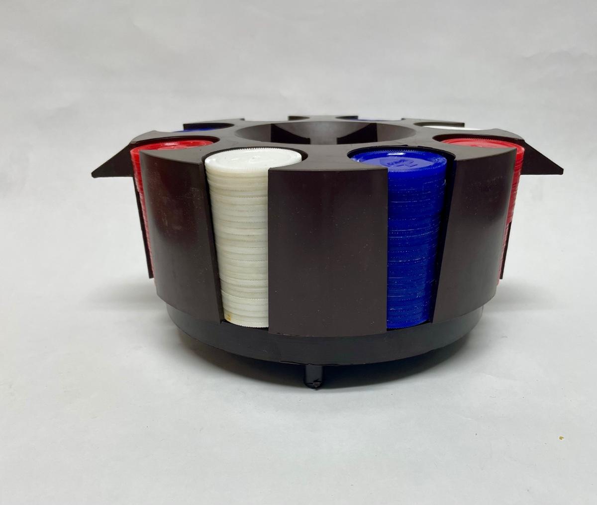 Vintage plastic revolving poker chip rack by Astor. Brown plastic with red, white and blue chips. Has original box and a snap-on ring that holds the chips in place. Excellent condition, a great vintage find.