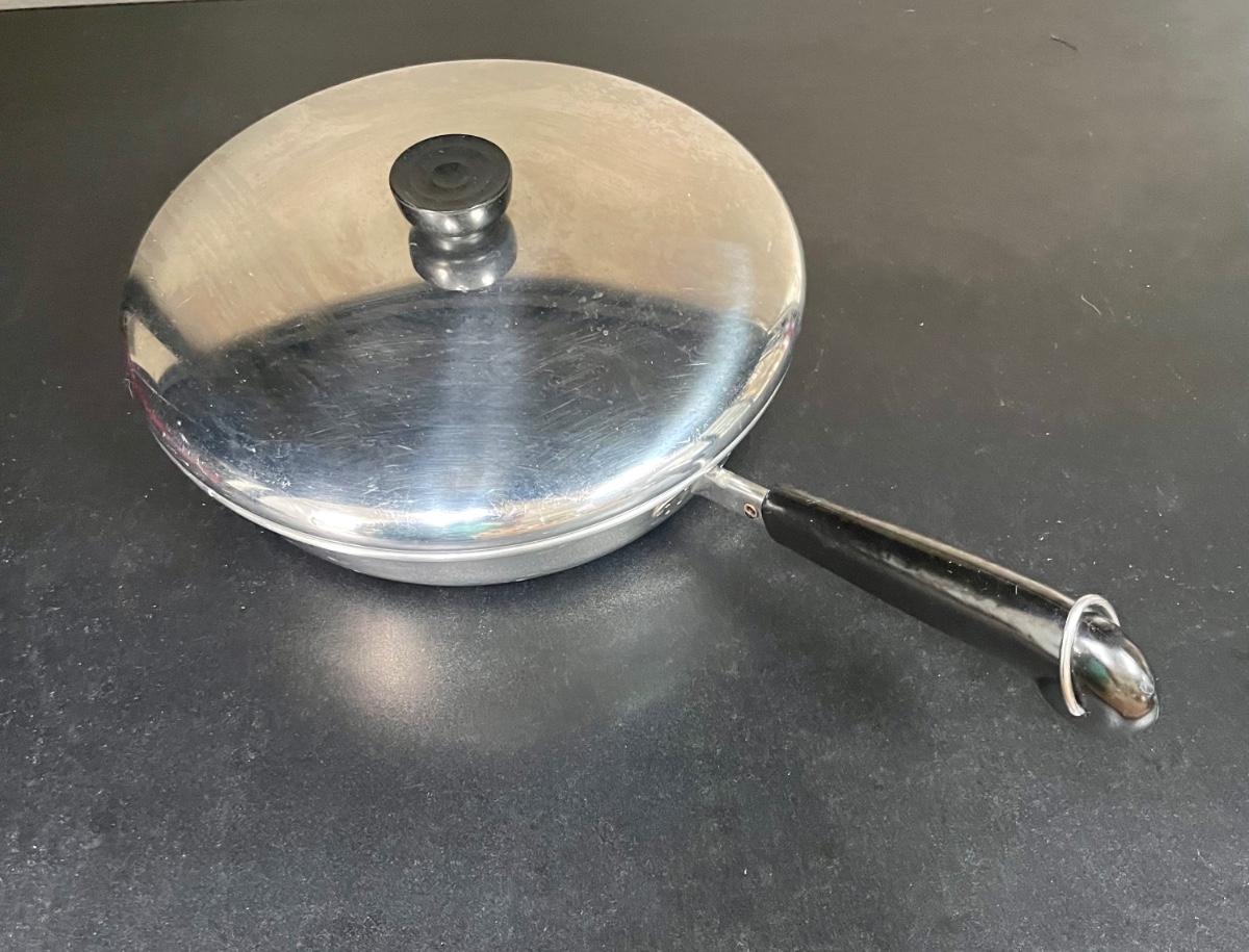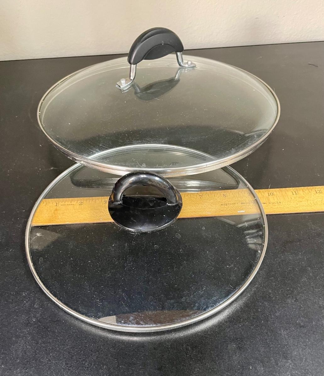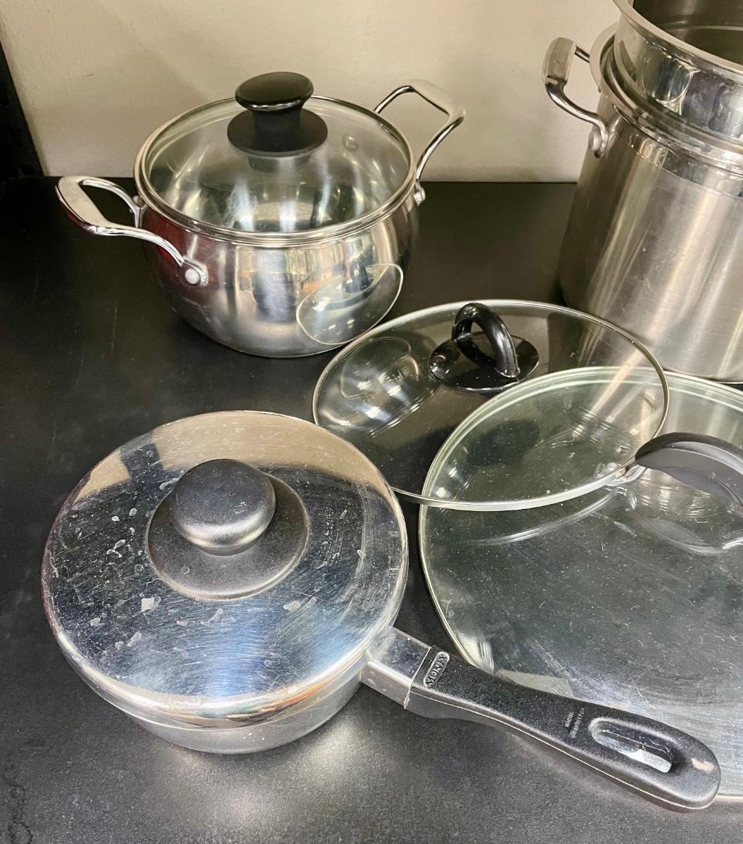 Pots and pans by Tramontina, Palm, RevereWare, Monix. 6 quart pot with steamer basket and lid, clear-lidded 2-handled medium pot, 8" pot with lid, 6" pot with lid, 10" fry pan with lid, 2 extra large clear lids. All in good used condition.