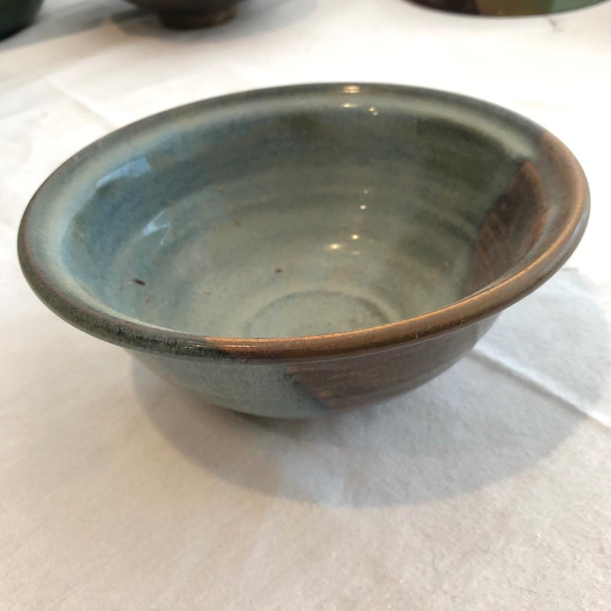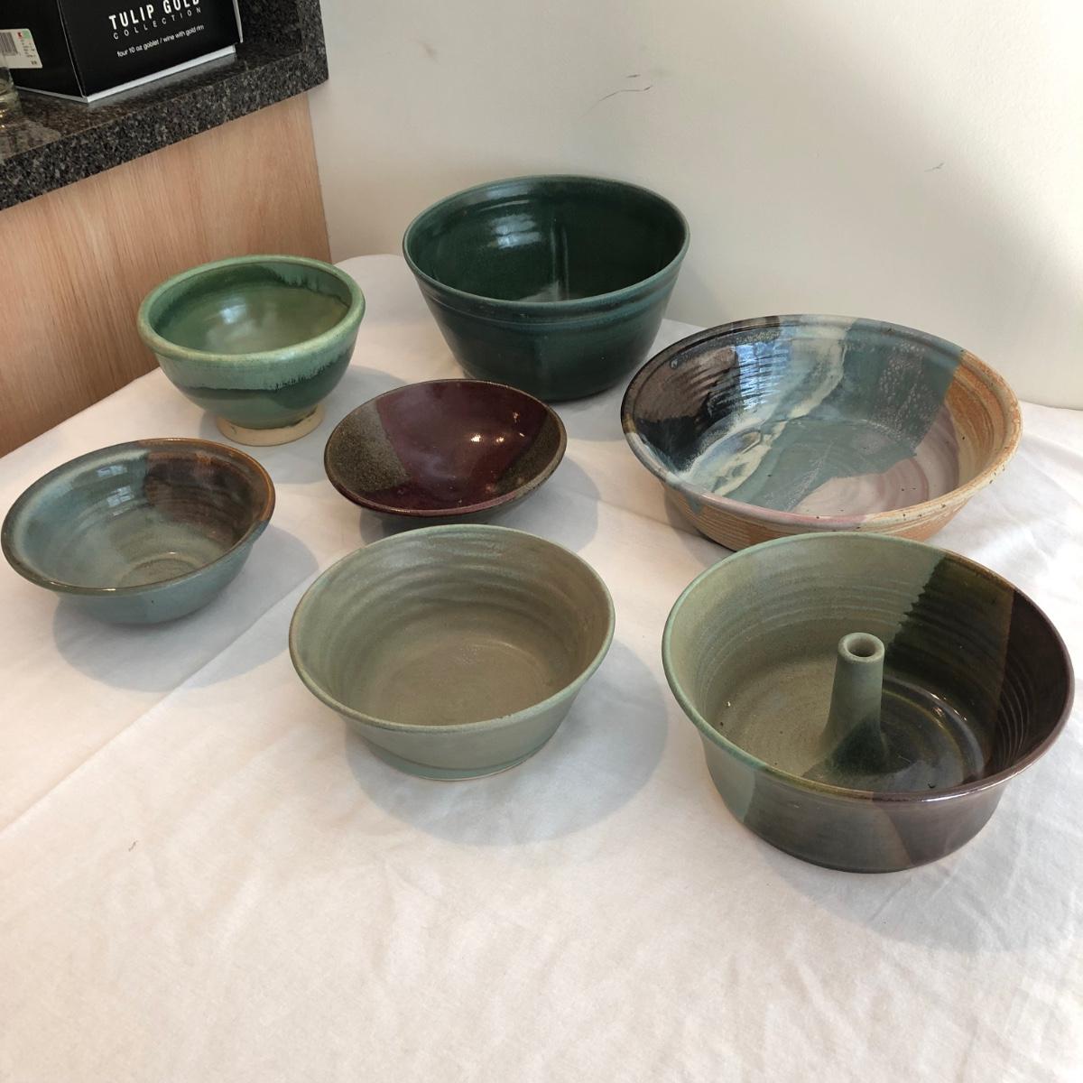 Every bowl in this collection of handmade pottery is signed as pictured. This collection of 7 bowls includes a bundt cake/apple baker. The bundt cake bowl, with the ceramic core piece measures 8” in diameter and is about 4” tall. Two of the bowls are signed Down Home Pottery, Seagrove, NC. Shipping available.