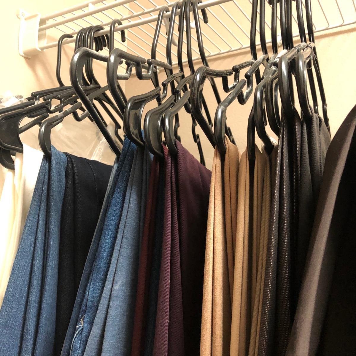 In this collection of more than 33 pairs of women’s pants some of the pants are new with tags. Most are size 16, but there are a few size 14, 18, and 38. Black dress pants, blue jeans, mauve jeans, and khaki, brown, and white colored pants are included. These pants have been stored neatly on hangers. Brands include Gloria Vanderbilt, Amanda, Christopher and Banks, Kim Rogers, and many more. Three pairs still have tags on them. Shipping available.