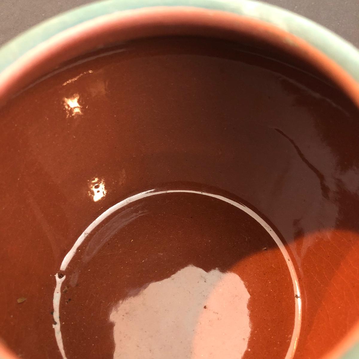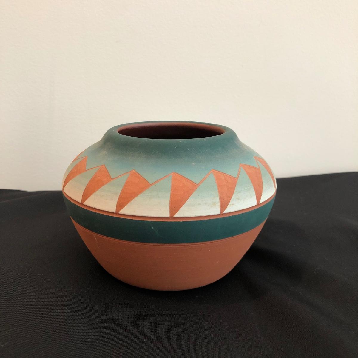 This Southwest style pottery vase is signed Deb Worsham Sioux. It measures 5.5” in diameter and is about 3.75” tall. The exterior has matte green glaze with handcarved graphic details on red clay. The interior of the vase is clear gloss over red clay. Some small light scuff marks are visible on the exterior of the vase that are not very noticeable. Shipping available.