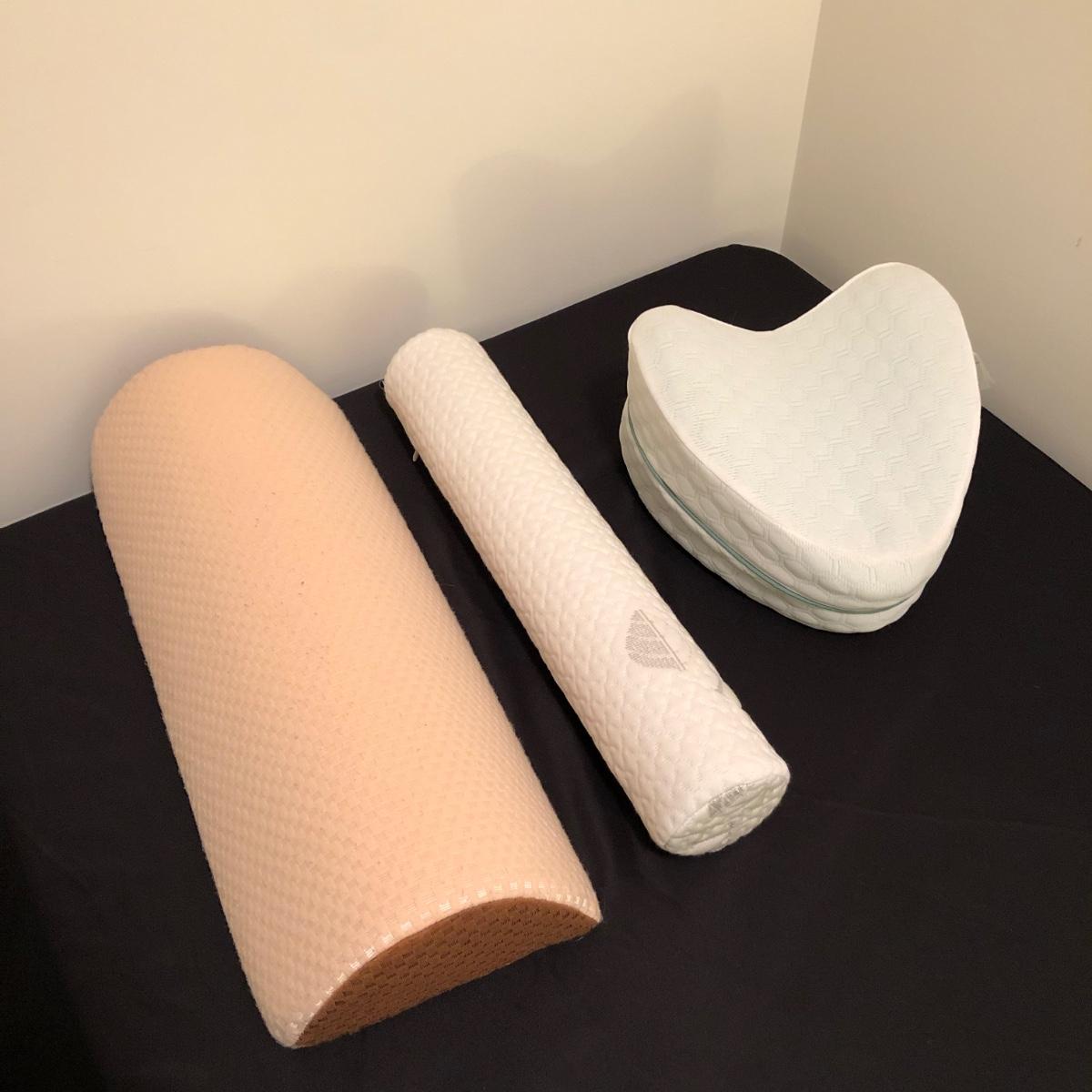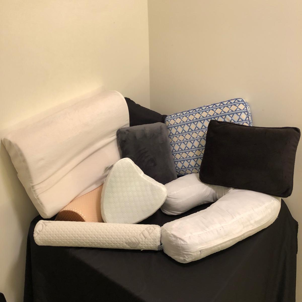 This assortment of 9 orthopedic pillows includes 7 memory foam pillows. The blue and yellow patterned pillow measures 15“ x 3“ x 11.5“. The fabric of the pillows may have some light pet hair but no noticeable smell. Shipping available.