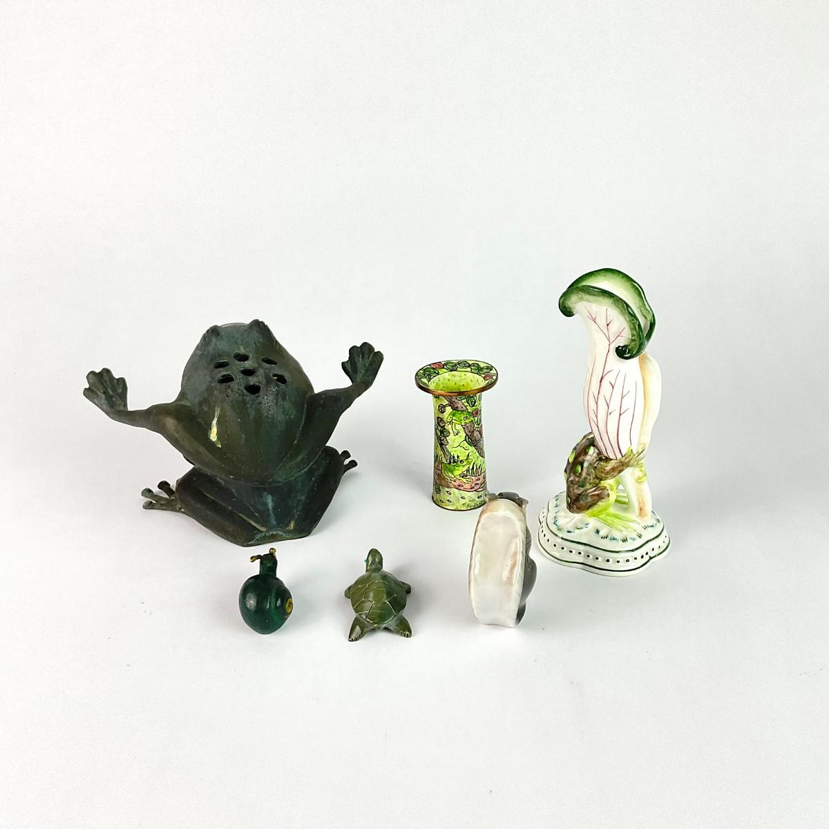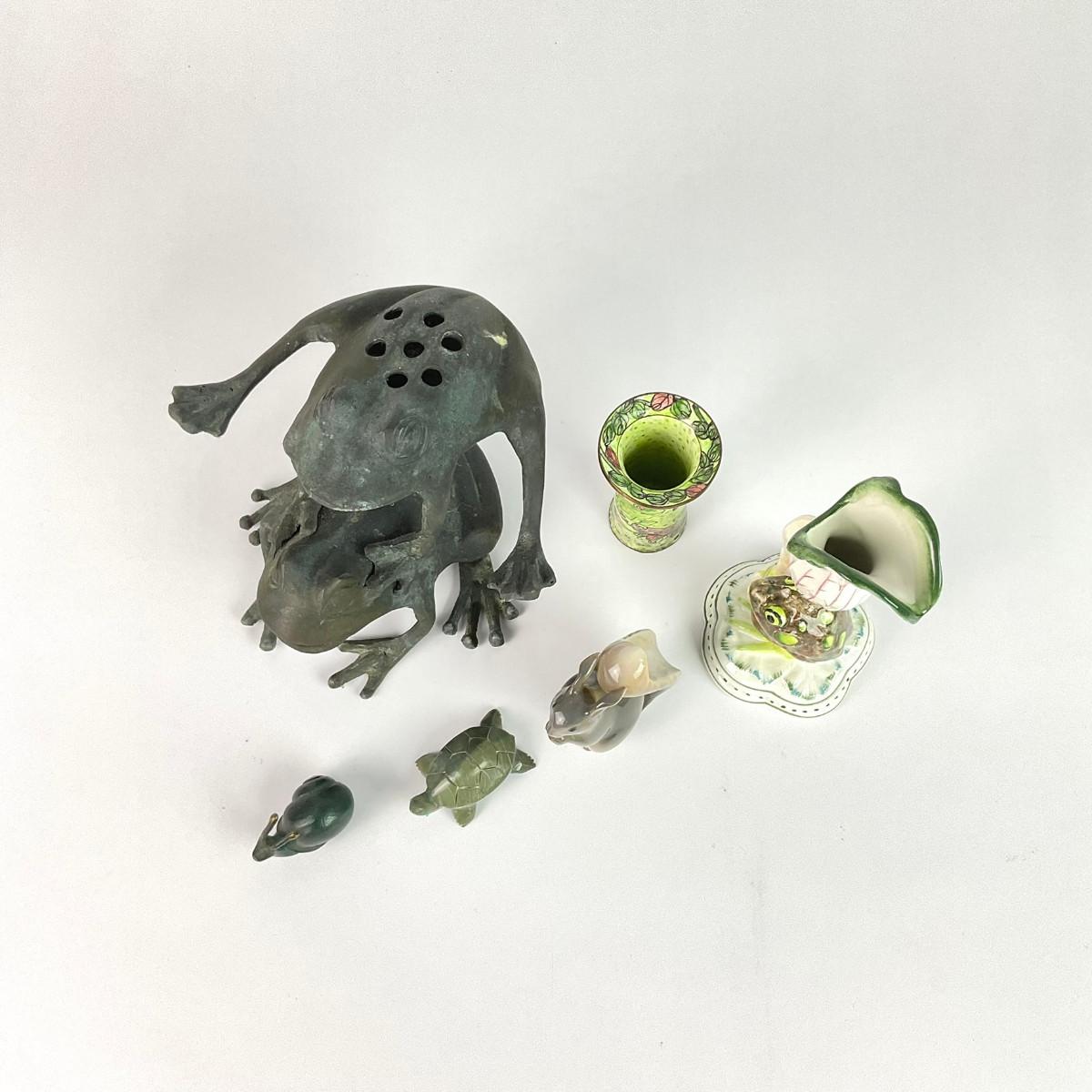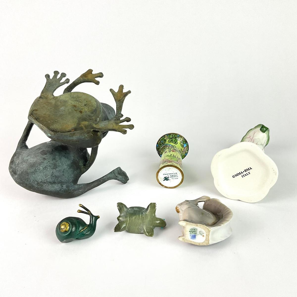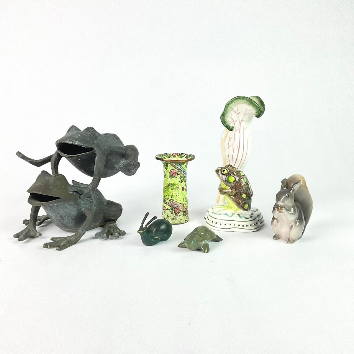 Leaping frogs made of iron flower stair holder (6.5" long x 6.5" deep x 4.5" high), two small hand-painted flower vases, one squirrel, one snail, one turtle, one frog vase (3" diameter x 6" high)