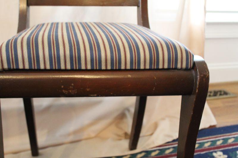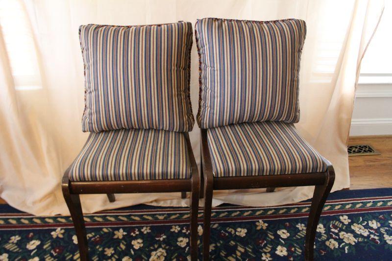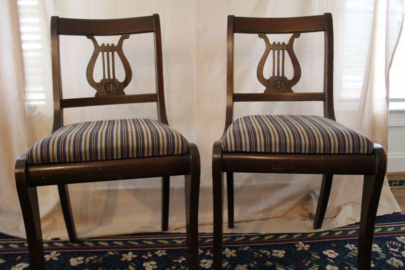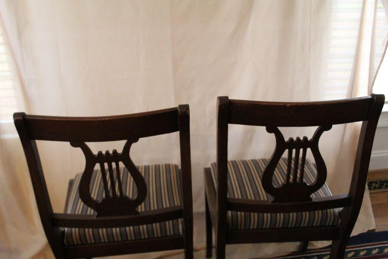 Pr lyre back chairs, 2 accent pillows 33t 16d navy,wine,tan stripe seats shows
