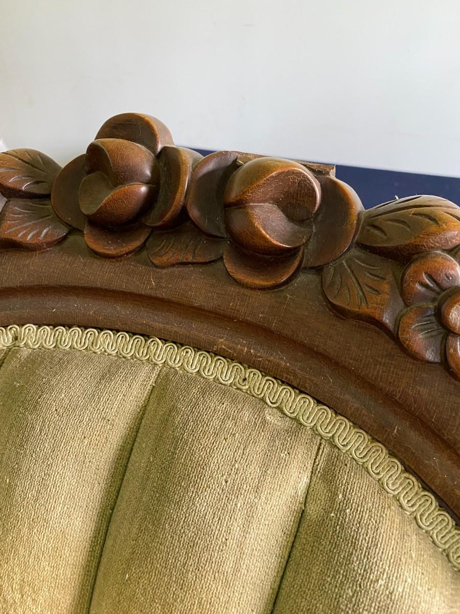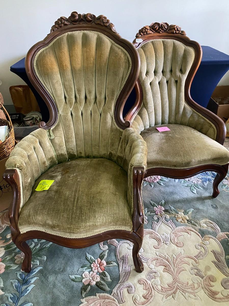 Pr of Victorian Style Chiairs, Green Velvet Upholstry, One Chip Off Top of One Chair, Have Piece