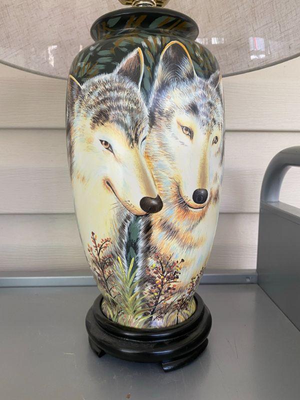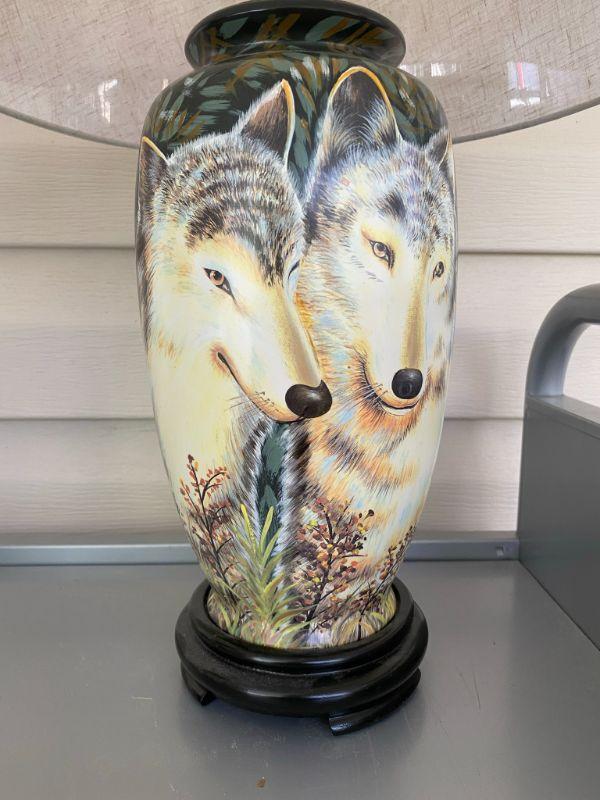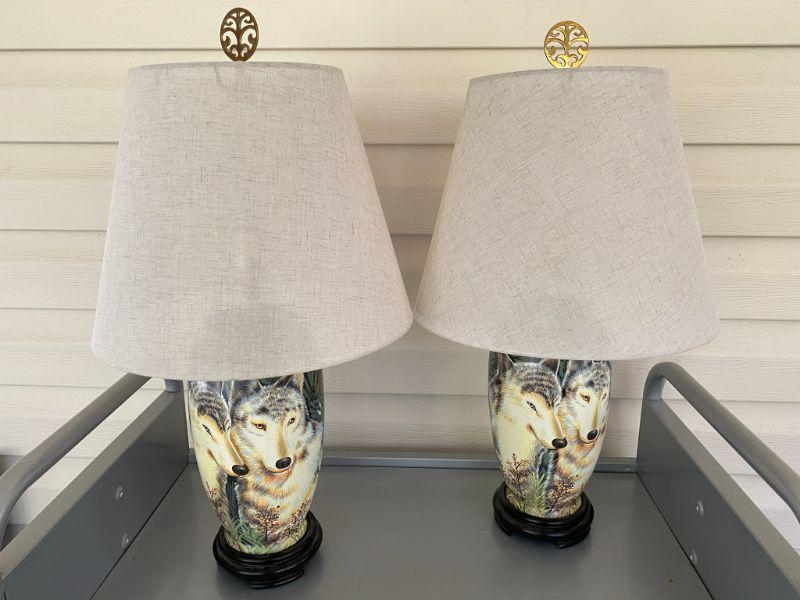 Pr Handpainted Wolf Lamps with Tan Shades Ginger Jar Style 24in Tall