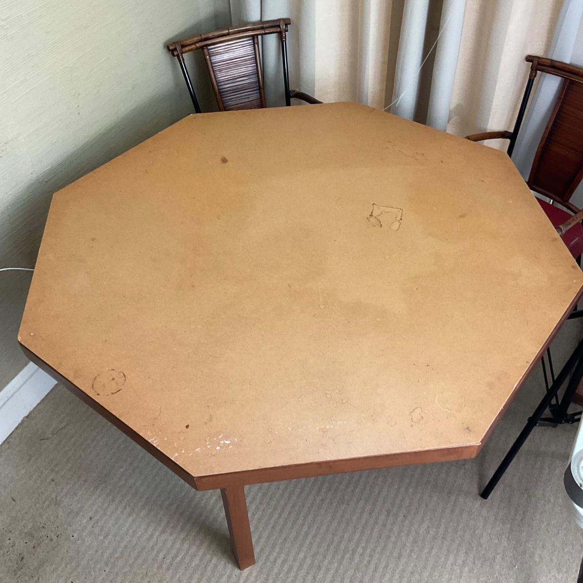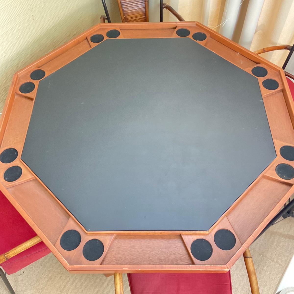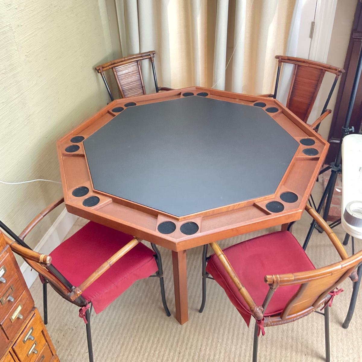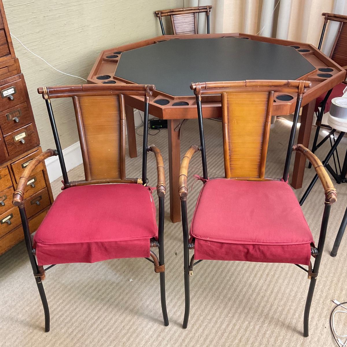 Comes with 8-sided card table with cut-out table cover. includes 4 red rattan chairs, they come "as-is" some are worn/damage. please refer to photos for chair wear.