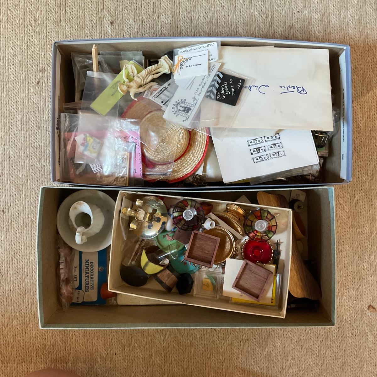 Includes small dolls, furniture, rugs, and doll accessories. 2 shoe boxes full of extra doll house items. Front door has multiple hinged opening.